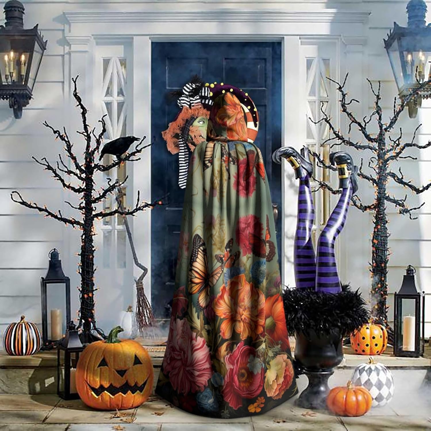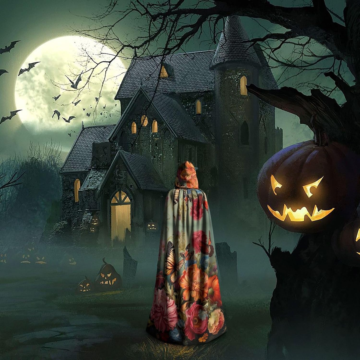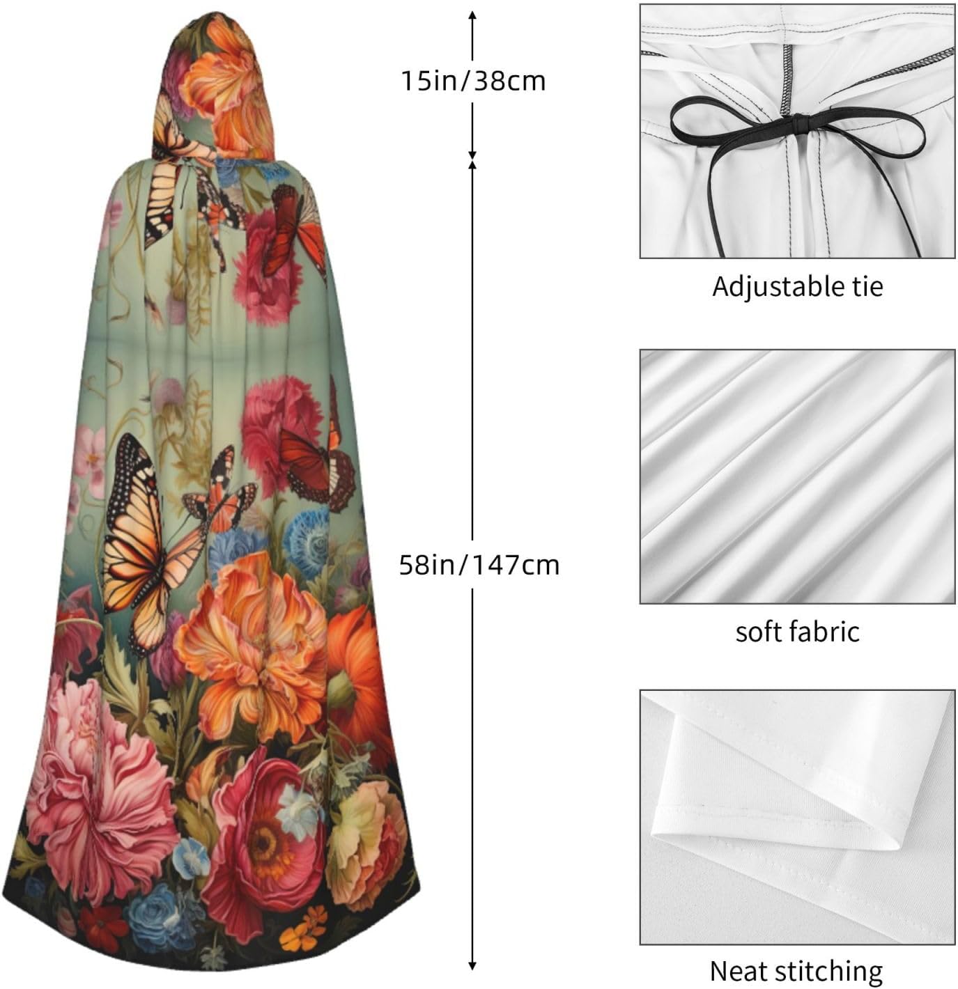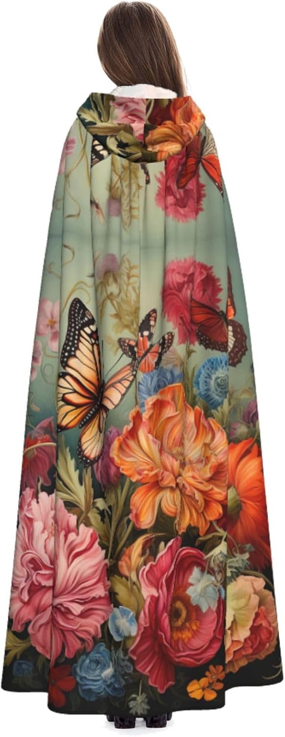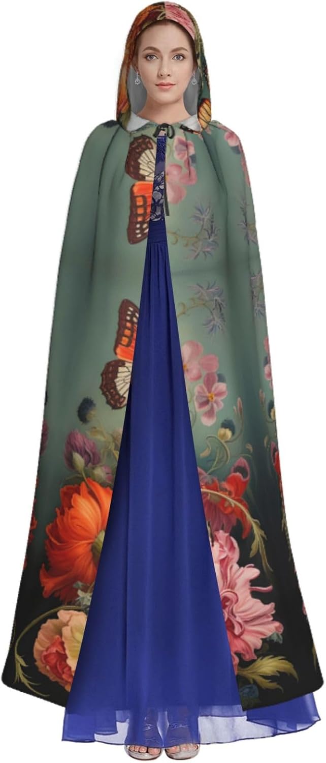 Il design senza cerniera, abbinato a un grande mantello con cappuccio e cravatta al collo, migliora il tuo mistero mantenendoti comodo con il suo tessuto non prurito. Con una lunghezza di 147 cm, larghezza di 154 cm e un'altezza del cappuccio di 38 cm, il nostro mantello con cappuccio con stampa di fiori e farfalle offre una copertura completa, assicurandoti di distinguerti in ogni occasione. Vari eventi come Halloween, cosplay, costumi da palcoscenico, feste a tema, balli, convegni di fumetti e molto altro ancora, il nostro mantello è versatile e conveniente. Facile da mantenere e di lunga durata, il nostro mantello con cappuccio con stampa di fiori e farfalle è lavabile in lavatrice e lavabile a mano. Con un design neutro, il nostro mantello è perfetto per uomini e donne.