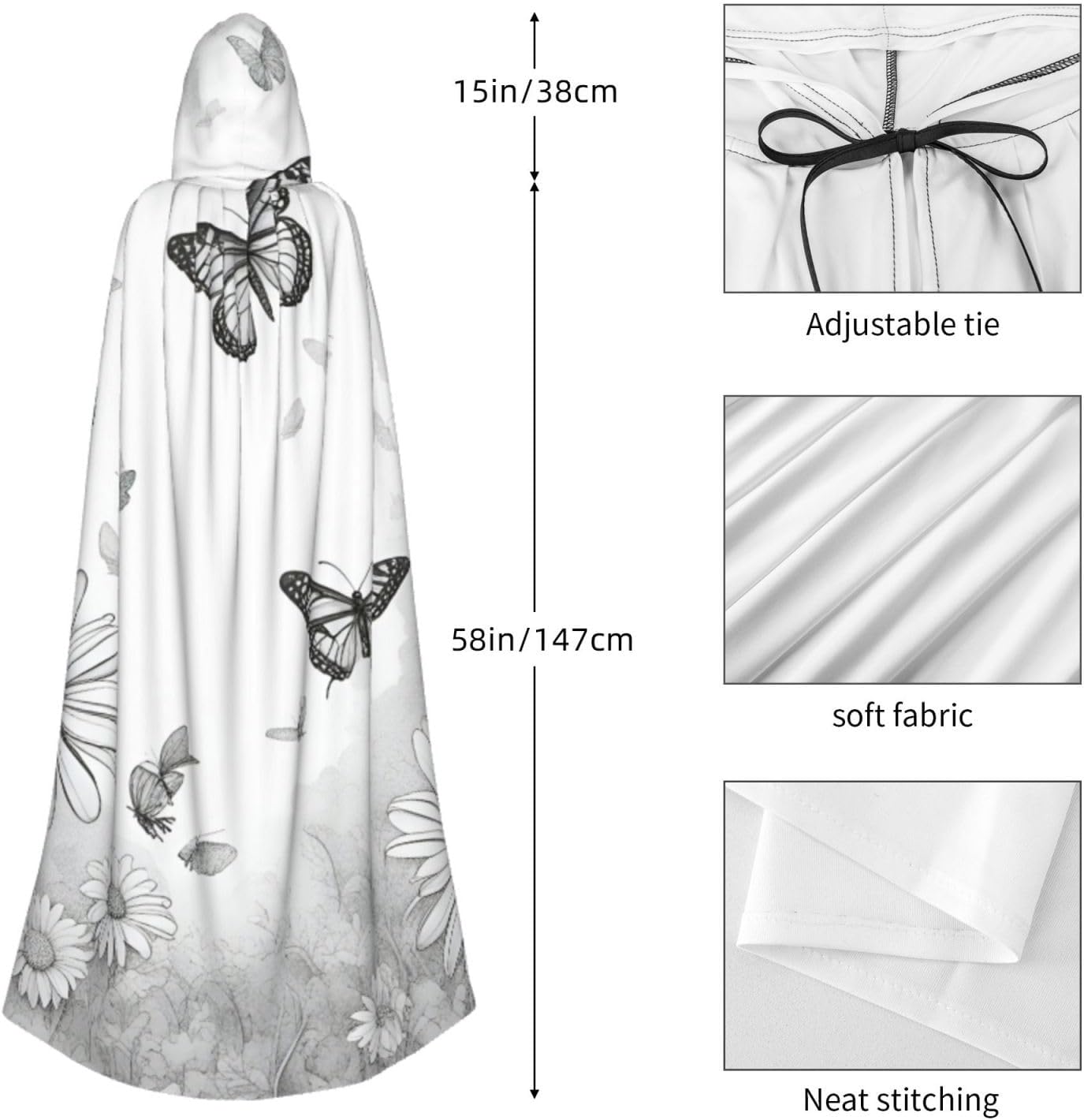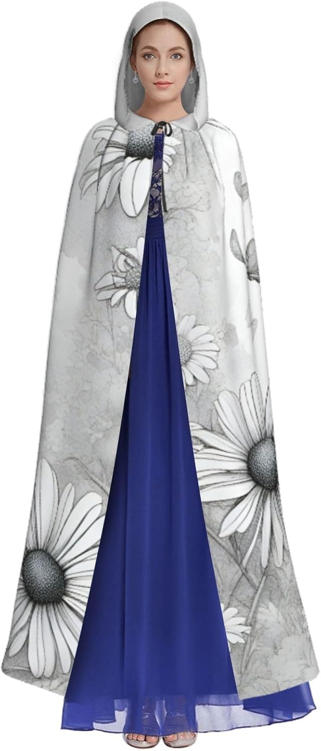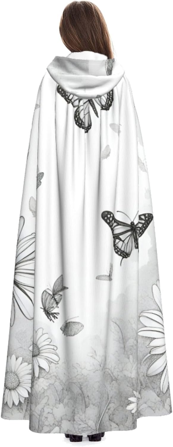 Il design senza cerniera, abbinato a un grande mantello con cappuccio e cravatta al collo, migliora il tuo mistero mantenendoti comodo con il suo tessuto non prurito. Con una lunghezza di 147 cm, una larghezza di 154 cm e un'altezza del cappuccio di 38 cm, il nostro mantello con cappuccio con stampa a farfalla e margherite offre una copertura completa, assicurandoti di distinguerti in ogni occasione. Vari eventi come Halloween, cosplay, costumi da palcoscenico, feste a tema, balli, convegni di fumetti e molto altro ancora, il nostro mantello è versatile e conveniente. Facile da mantenere e di lunga durata, il nostro mantello con cappuccio con stampa margherita farfalla è lavabile in lavatrice e lavabile a mano. Con un design neutro, il nostro mantello è perfetto per uomini e donne.
