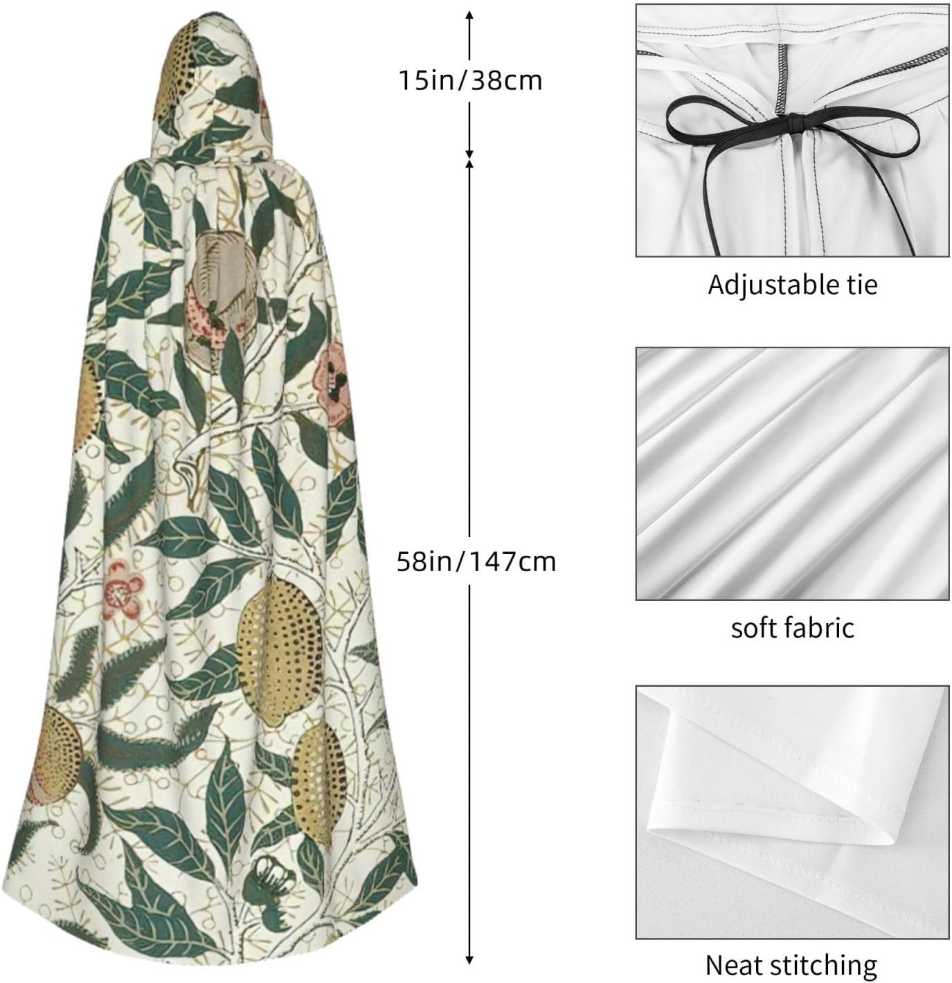 Il design senza cerniera, abbinato a un grande mantello con cappuccio e cravatta al collo, migliora il tuo mistero mantenendoti comodo con il suo tessuto non prurito. Con una lunghezza di 147 cm, larghezza di 154 cm e un'altezza del cappuccio di 38 cm, il nostro mantello con cappuccio con stampa di piante e frutta offre una copertura completa, assicurandoti di distinguerti in ogni occasione. Vari eventi come Halloween, cosplay, costumi da palcoscenico, feste a tema, balli, convegni di fumetti e molto altro ancora, il nostro mantello è versatile e conveniente. Facile da mantenere e di lunga durata, il nostro mantello con cappuccio con stampa di piante e frutta è lavabile in lavatrice e lavabile a mano. Con un design neutro, il nostro mantello è perfetto per uomini e donne.