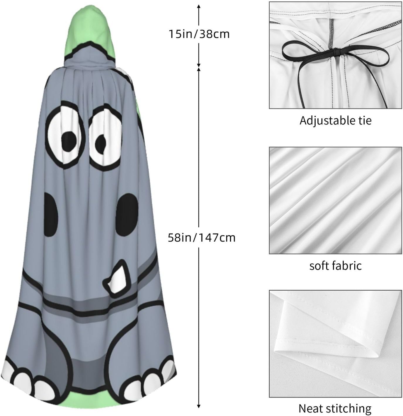 Il design senza cerniera, abbinato a un grande mantello con cappuccio e cravatta al collo, migliora il tuo mistero mantenendoti comodo con il suo tessuto non prurito. Con una lunghezza di 147 cm, una larghezza di 154 cm e un'altezza del cappuccio di 38 cm, il nostro mantello con cappuccio con stampa ippopotamo in stile cartone animato offre una copertura completa, assicurandoti di distinguerti in ogni occasione. Vari eventi come Halloween, cosplay, costumi da palcoscenico, feste a tema, balli, convegni di fumetti e molto altro ancora, il nostro mantello è versatile e conveniente. Facile da mantenere e di lunga durata, il nostro mantello con cappuccio con stampa ippopotamo è lavabile in lavatrice e lavabile a mano. Con un design neutro, il nostro mantello è perfetto per uomini e donne.