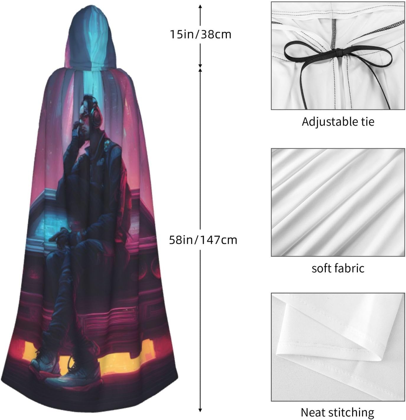 Il design senza cerniera, abbinato a un grande mantello con cappuccio e cravatta al collo, migliora il tuo mistero mantenendoti comodo con il suo tessuto non prurito. Con una lunghezza di 147 cm, una larghezza di 154 cm e un'altezza del cappuccio di 38 cm, il nostro mantello con cappuccio con stampa musicale offre una copertura completa, assicurandoti di distinguerti in ogni occasione. Vari eventi come Halloween, cosplay, costumi da palcoscenico, feste a tema, balli, convegni di fumetti e molto altro ancora, il nostro mantello è versatile e conveniente. Facile da mantenere e di lunga durata, il nostro mantello con cappuccio con stampa musicale è lavabile in lavatrice e lavabile a mano. Con un design neutro, il nostro mantello è perfetto per uomini e donne.