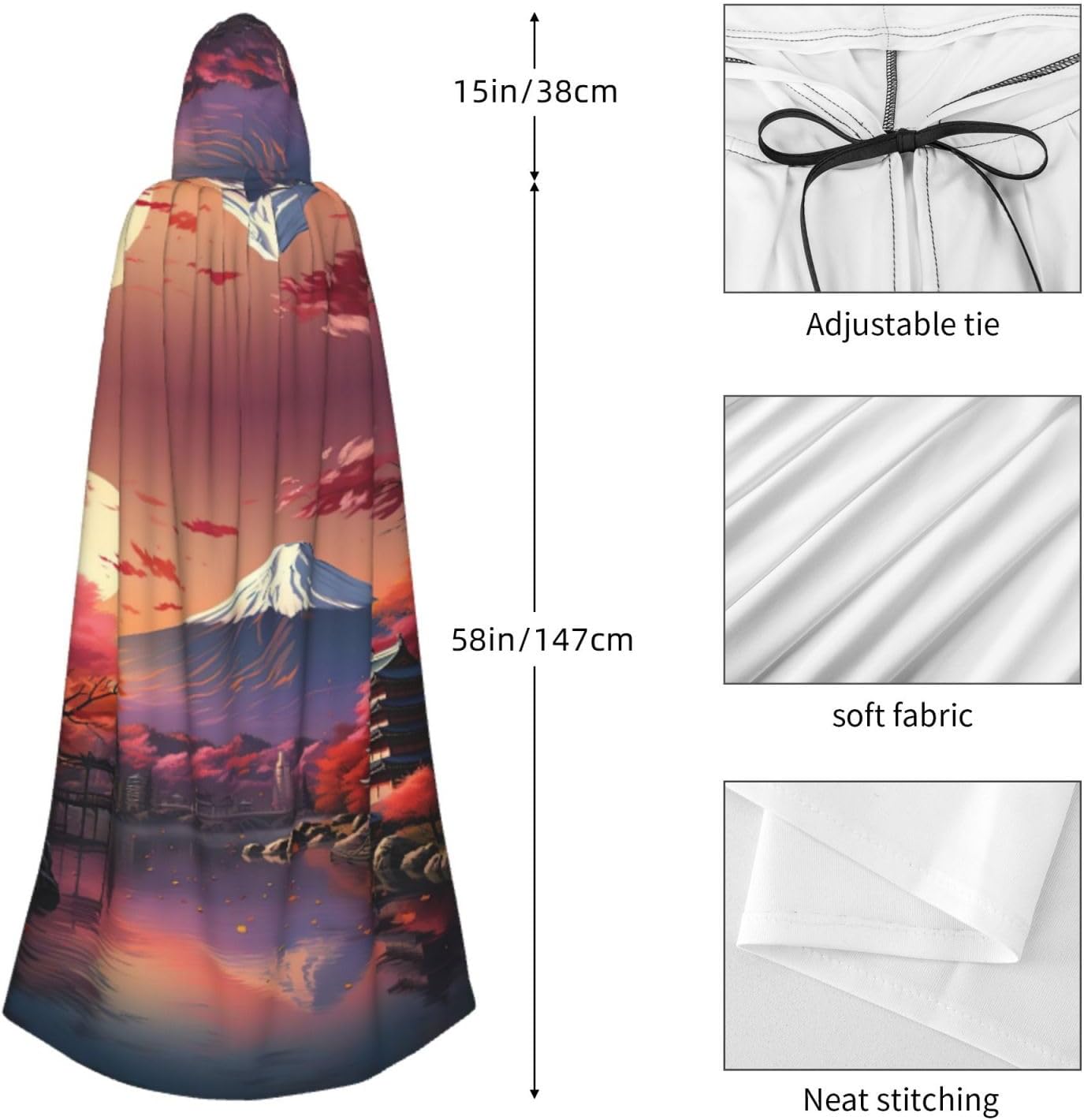 Il design senza cerniera, abbinato a un grande mantello con cappuccio e cravatta al collo, migliora il tuo mistero mantenendoti comodo con il suo tessuto non prurito. Con una lunghezza di 147 cm, larghezza di 154 cm e un'altezza del cappuccio di 38 cm, il nostro mantello con cappuccio con stampa orizzontale Monte Fuji giapponese offre una copertura completa, assicurandoti di distinguerti in ogni occasione. Vari eventi come Halloween, cosplay, costumi da palcoscenico, feste a tema, balli, convegni di fumetti e molto altro ancora, il nostro mantello è versatile e conveniente. Facile da mantenere e di lunga durata, il nostro mantello con cappuccio con stampa paesaggistica giapponese Monte Fuji è lavabile in lavatrice e lavabile a mano. Con un design neutro, il nostro mantello è perfetto per uomini e donne.