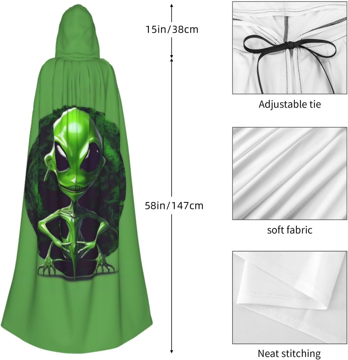 Realizzato in poliestere, questo mantello verde con stampa aliena con cappuccio garantisce longevità e comfort. Le sue dimensioni ottimali assicurano una copertura completa per tutte le età, facendoti risaltare in qualsiasi evento. Che tu sia diretto per Halloween, un evento cosplay, un costume da palcoscenico, una festa in maschera, una festa a tema, un ballo o una convention di fumetti, questo mantello è una scelta ideale. Il suo design unico, completo di un grande cappuccio e cravatte collare. Inoltre, puoi dire addio ai metodi di pulizia complicati. Questo mantello con cappuccio con stampa aliena verde è lavabile in lavatrice e a mano, offrendo una cura senza sforzo. Esci con stile e comfort con il nostro mantello con cappuccio, il tuo compagno per tutti gli eventi e le occasioni.