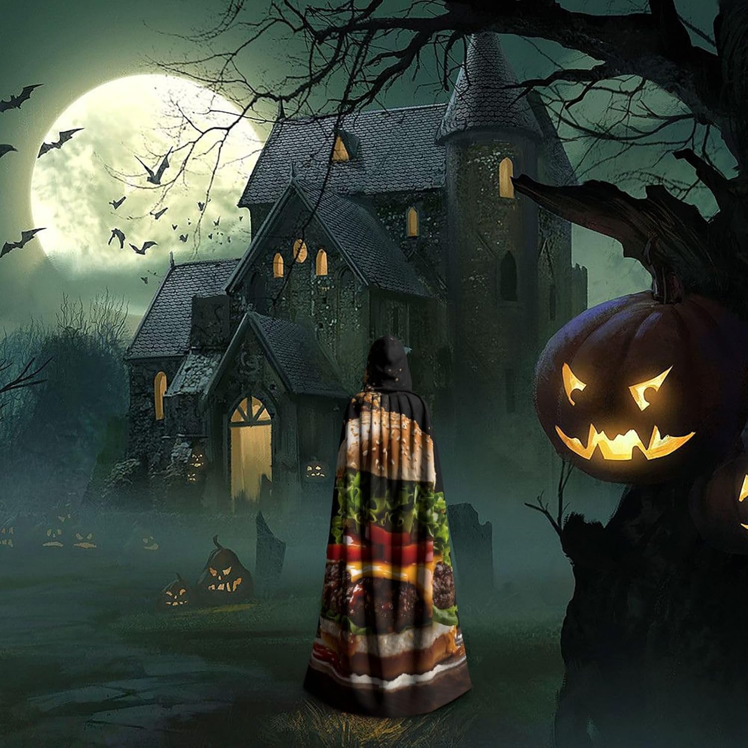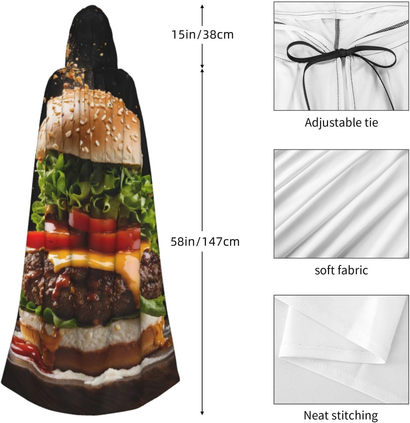 Il nostro mantello con stampa alimentare viene fornito con un cappuccio comodo e drammatico, insieme a una cravatta per un facile utilizzo, privo di cerniere che potrebbero rovinare l'estetica. Questo mantello con cappuccio con stampa alimentare promette un comfort eccezionale grazie al suo tessuto anti-prurito e offre una copertura completa adatta a tutte le età. Non importa dove ti trovi, distinguiti tra la folla con questo pezzo eccezionale. Versatile e facile da mantenere, questo mantello è per una serie di eventi, che si tratti di Halloween, balli in maschera, feste in costume o fumetti. Basta metterlo in lavatrice o lavarlo a mano e sei pronto ad andare. Vestiti nello spirito di Halloween e Cosplay con il nostro mantello con cappuccio con stampa alimentare, offrendo la combinazione di comodità, comfort e stile.