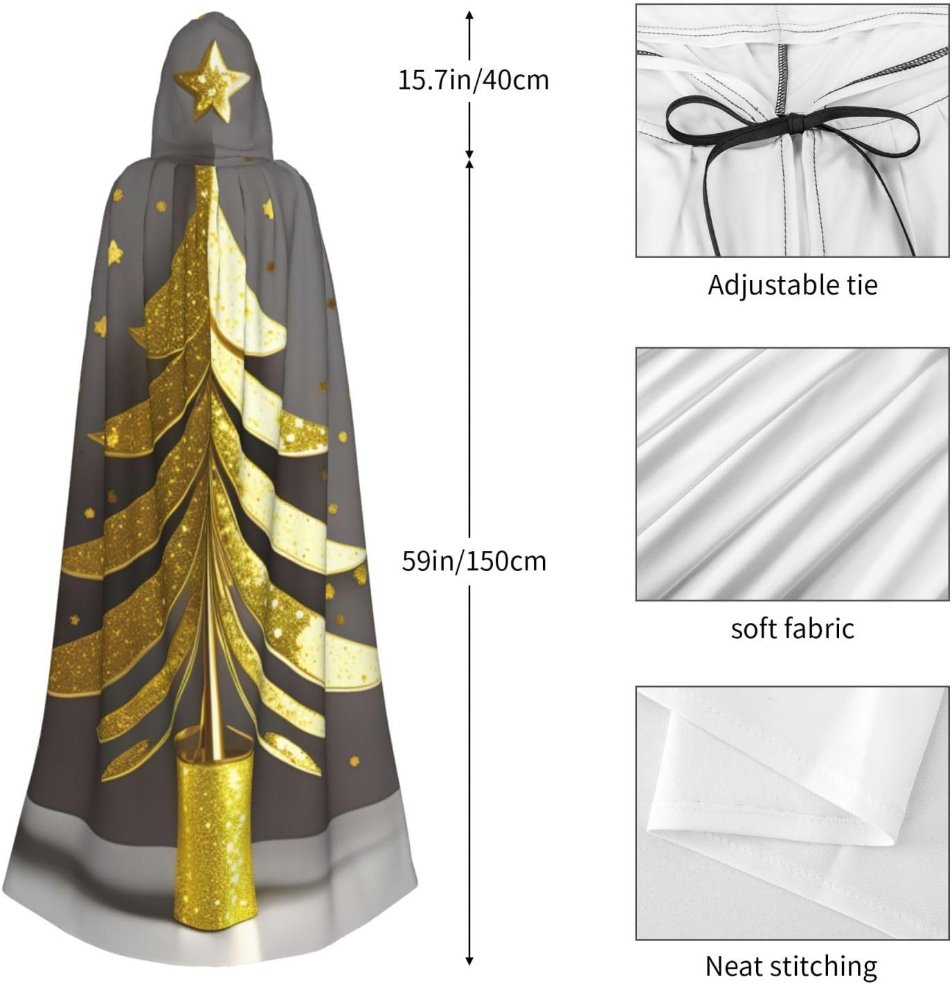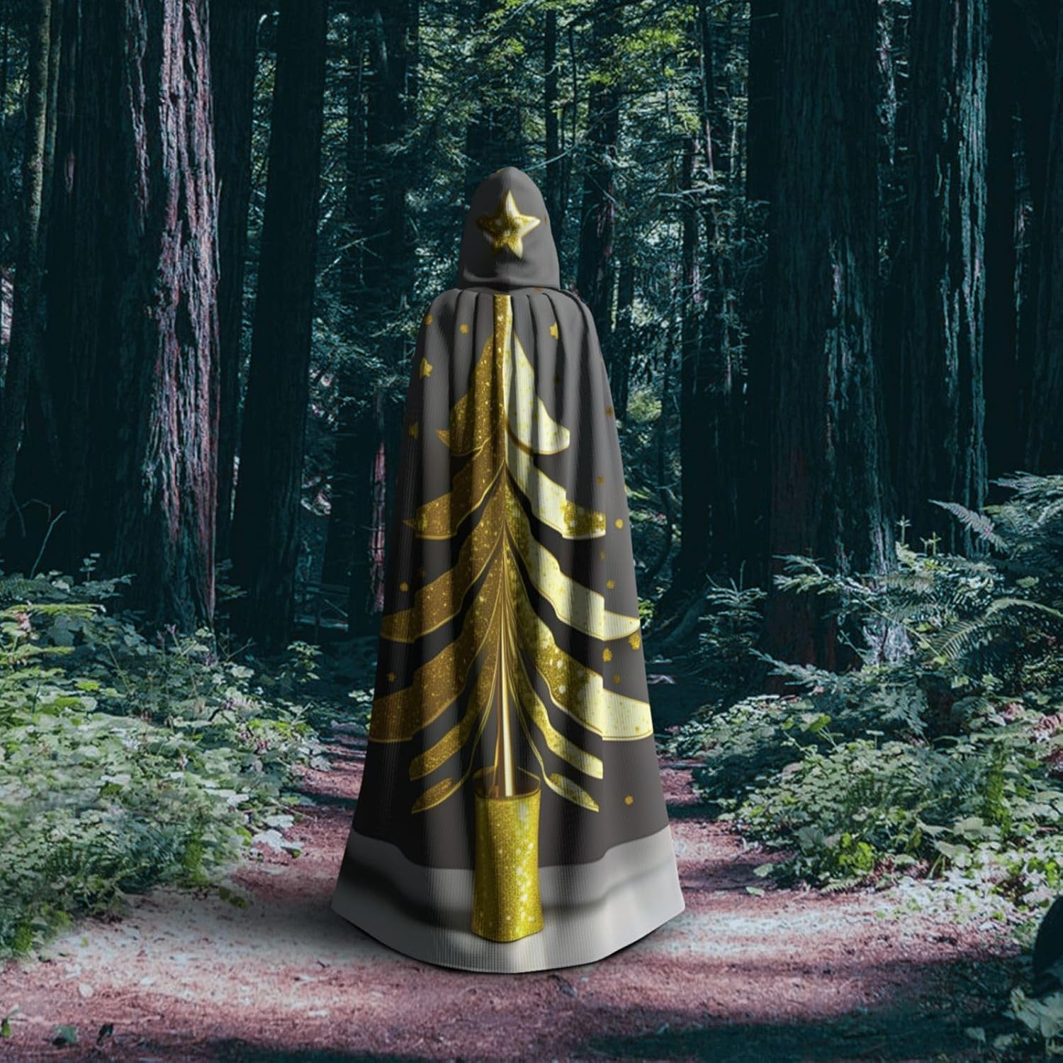 Mantello con cappuccio unisex con stampa di albero di Natale glitterato dorato per adulti Halloween a lunghezza intera mantello da uomo con cappuccio costume