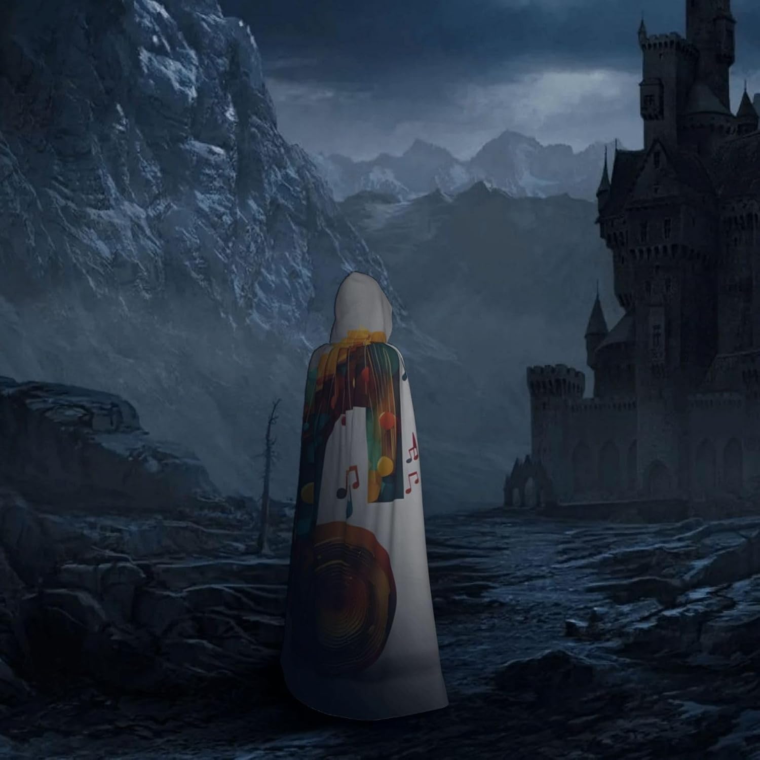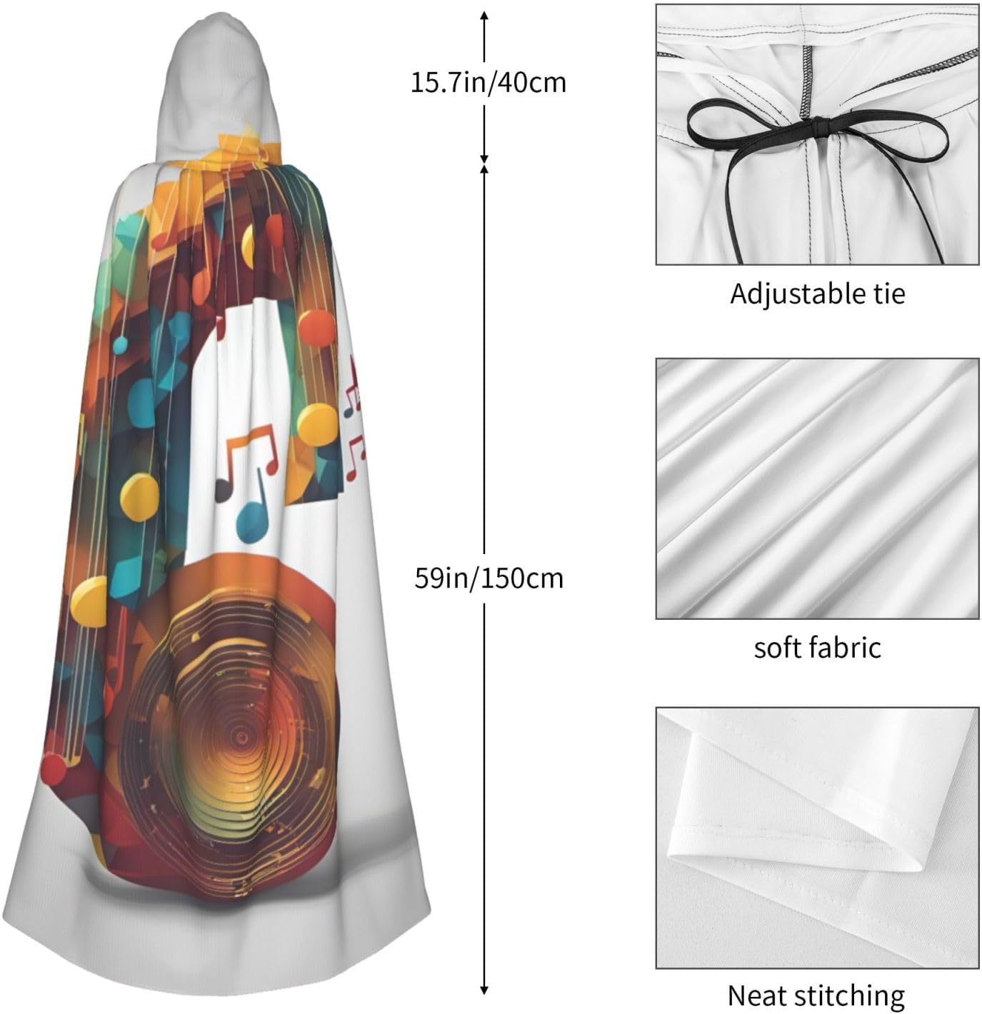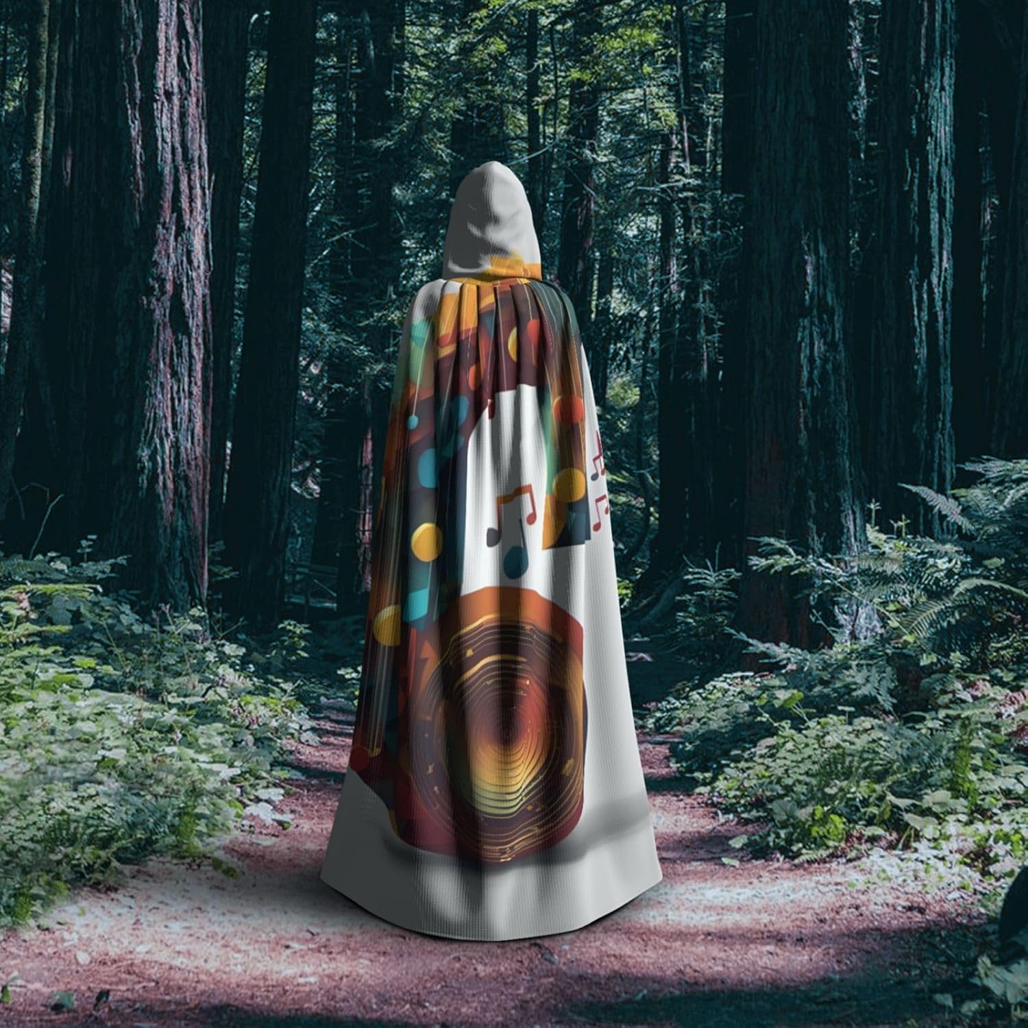 Mantello con cappuccio unisex con stampa di note musicali per adulti Halloween a lunghezza intera mantello da uomo con cappuccio costume