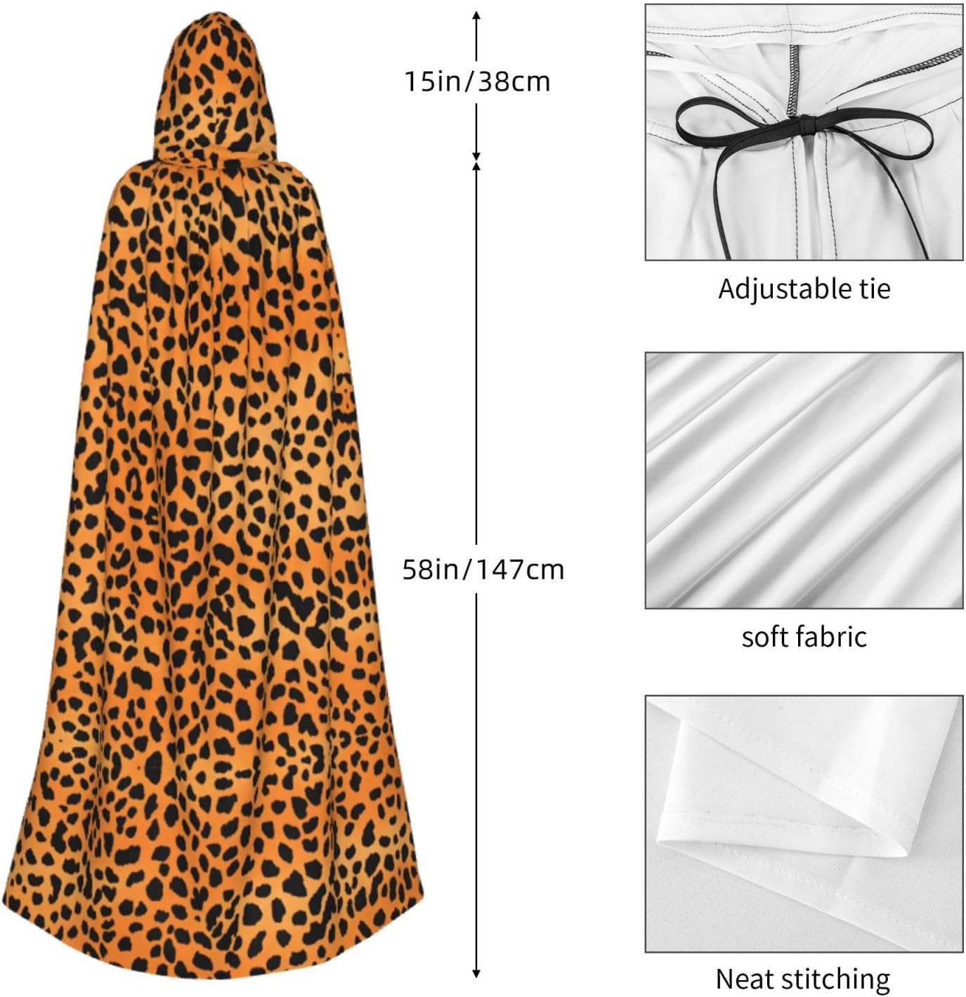 Il nostro mantello con stampa leopardata viene fornito con un cappuccio comodo e drammatico, insieme a una cravatta per un facile utilizzo, privo di cerniere che potrebbero rovinare l'estetica. Questo mantello con cappuccio con stampa leopardata promette un comfort eccezionale grazie al suo tessuto anti-prurito e offre una copertura completa adatta a tutte le età. Non importa dove ti trovi, distinguiti tra la folla con questo pezzo eccezionale. Versatile e facile da mantenere, questo mantello è per una serie di eventi, che si tratti di Halloween, balli in maschera, feste in costume o fumetti. Basta metterlo in lavatrice o lavarlo a mano e sei pronto ad andare. Vestiti nello spirito di Halloween e Cosplay con il nostro mantello con cappuccio con stampa leopardata, offrendo la combinazione di comodità, comfort e stile.