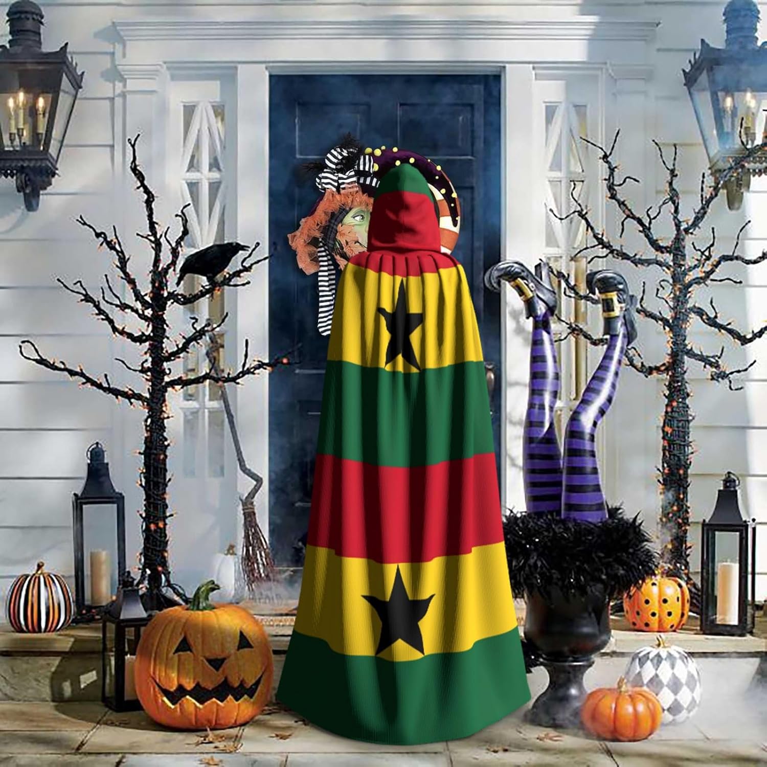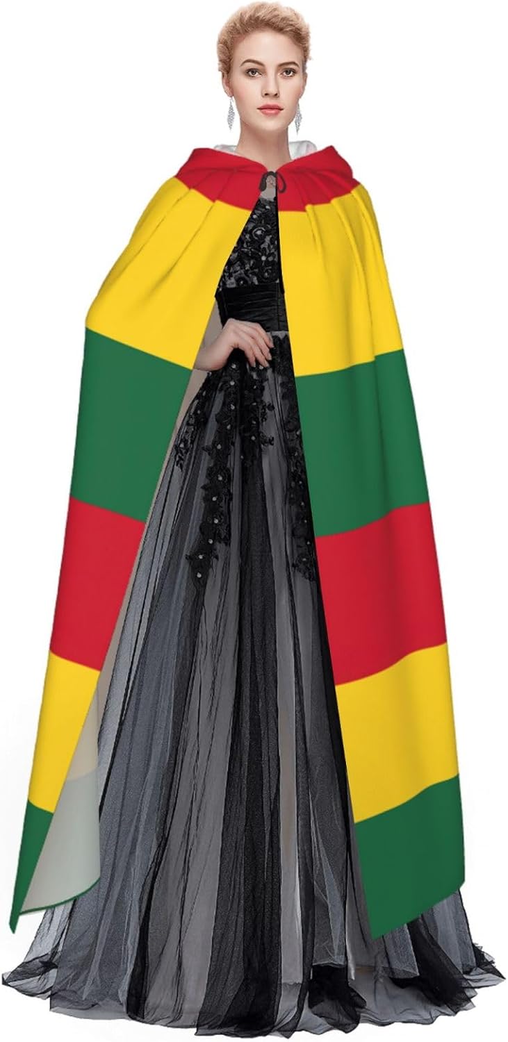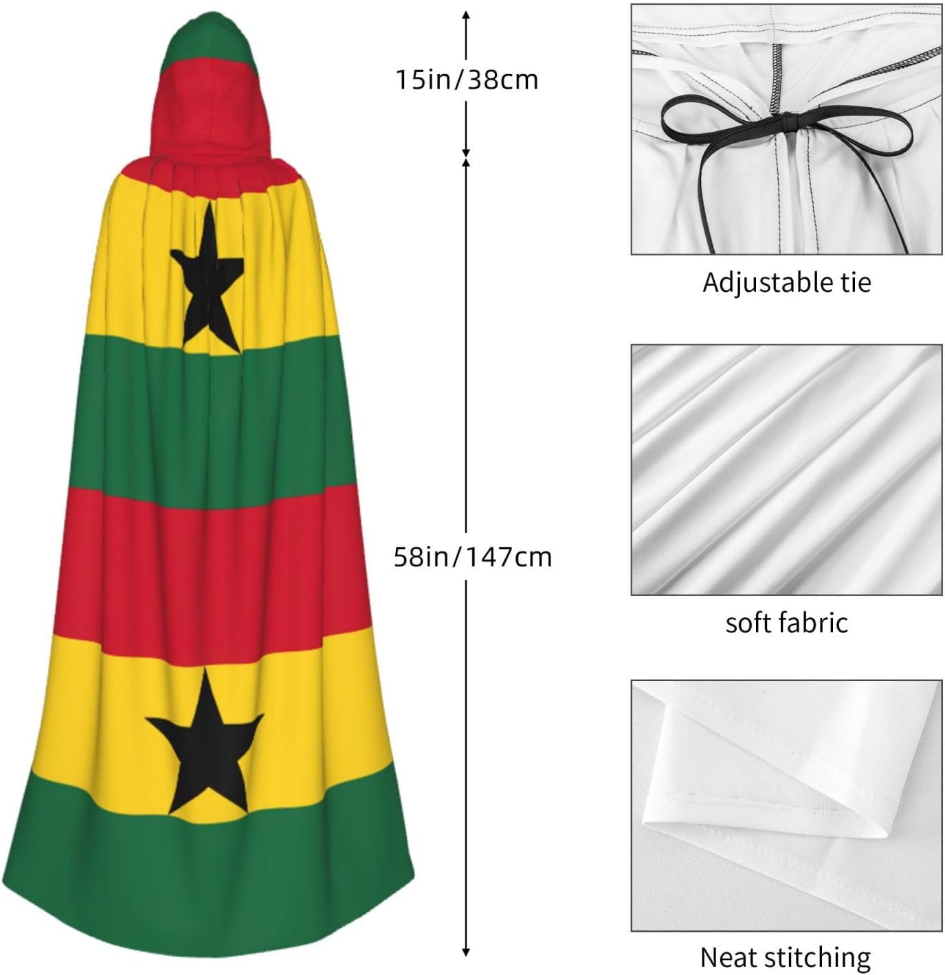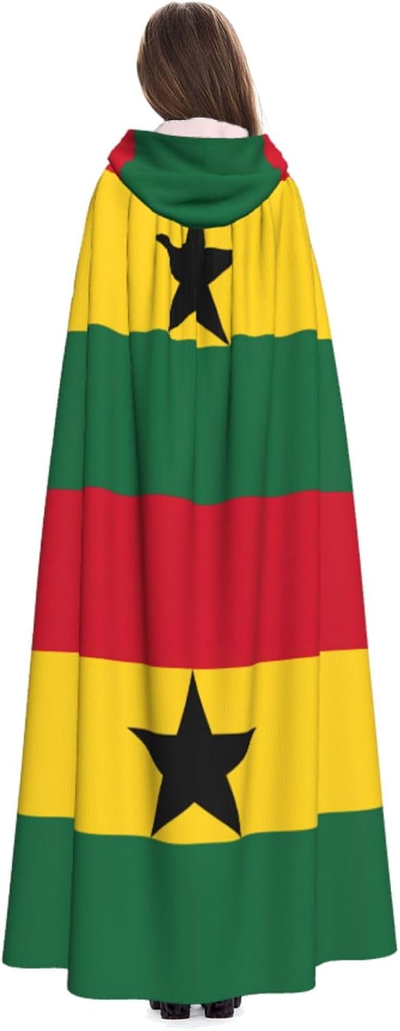 Realizzato in poliestere, questo mantello con stampa bandiera del Ghana con cappuccio garantisce longevità e comfort. Le sue dimensioni ottimali assicurano una copertura completa per tutte le età, facendoti risaltare in qualsiasi evento. Che tu sia diretto per Halloween, un evento cosplay, un costume da palcoscenico, una festa in maschera, una festa a tema, un ballo o una convention di fumetti, questo mantello è una scelta ideale. Il suo design unico, completo di un grande cappuccio e cravatte collare. Inoltre, puoi dire addio ai metodi di pulizia complicati. Questo mantello con cappuccio con stampa bandiera del Ghana è lavabile in lavatrice e a mano, offrendo una cura senza sforzo. Esci con stile e comfort con il nostro mantello con cappuccio, il tuo compagno per tutti gli eventi e le occasioni.
