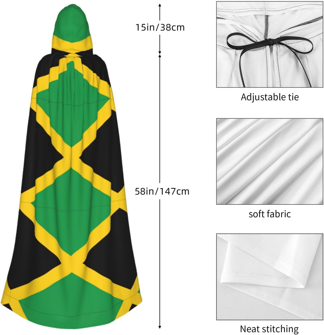 Realizzato in poliestere, questo mantello con stampa bandiera della Giamaica con cappuccio garantisce longevità e comfort. Le sue dimensioni ottimali assicurano una copertura completa per tutte le età, facendoti risaltare in qualsiasi evento. Che tu sia diretto per Halloween, un evento cosplay, un costume da palcoscenico, una festa in maschera, una festa a tema, un ballo o una convention di fumetti, questo mantello è una scelta ideale. Il suo design unico, completo di un grande cappuccio e cravatte collare. Inoltre, puoi dire addio ai metodi di pulizia complicati. Questo mantello con cappuccio con stampa bandiera della Giamaica è lavabile in lavatrice e a mano, offrendo una cura senza sforzo. Esci con stile e comfort con il nostro mantello con cappuccio, il tuo compagno per tutti gli eventi e le occasioni.