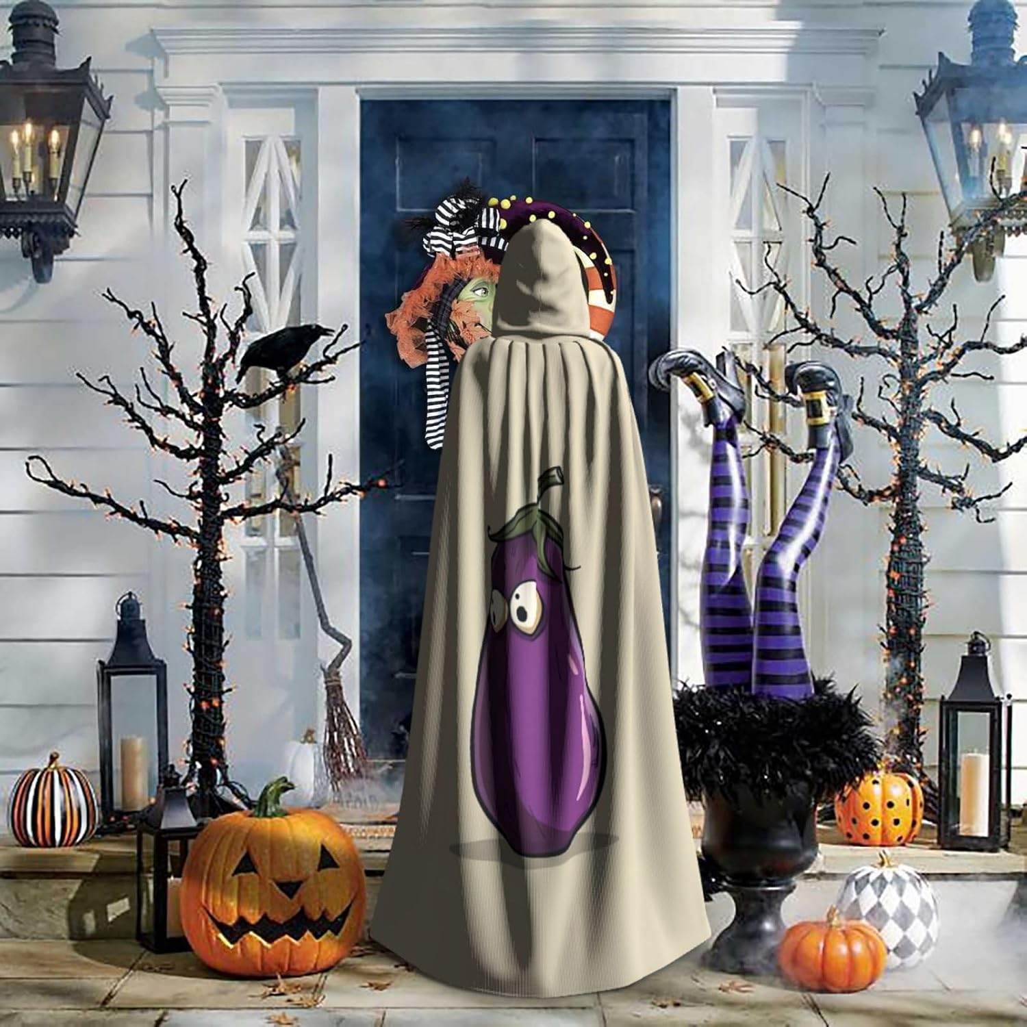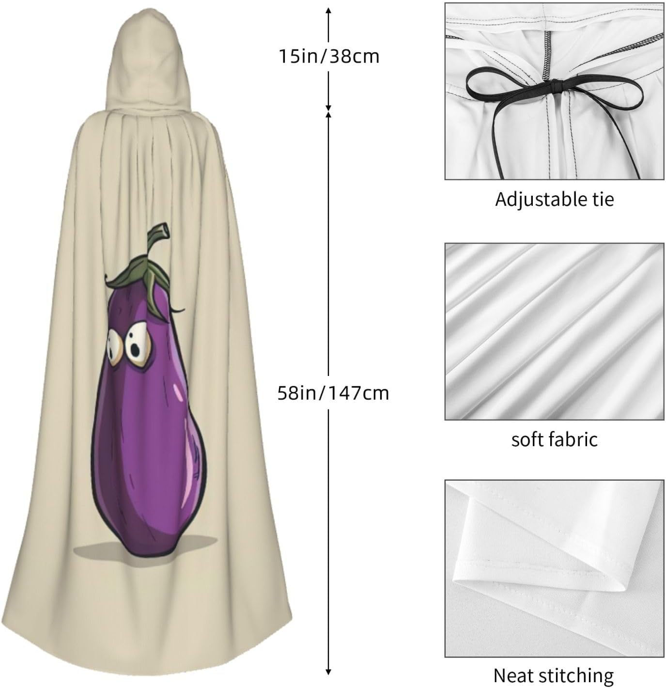 Realizzato in poliestere, questo mantello con stampa melanzana con cappuccio garantisce longevità e comfort. Le sue dimensioni ottimali assicurano una copertura completa per tutte le età, facendoti risaltare in qualsiasi evento. Che tu sia diretto per Halloween, un evento cosplay, un costume da palcoscenico, una festa in maschera, una festa a tema, un ballo o una convention di fumetti, questo mantello è una scelta ideale. Il suo design unico, completo di un grande cappuccio e cravatte collare. Inoltre, puoi dire addio ai metodi di pulizia complicati. Questo mantello con cappuccio con stampa melanzana è lavabile in lavatrice e a mano, offrendo una cura senza sforzo. Esci con stile e comfort con il nostro mantello con cappuccio, il tuo compagno per tutti gli eventi e le occasioni.