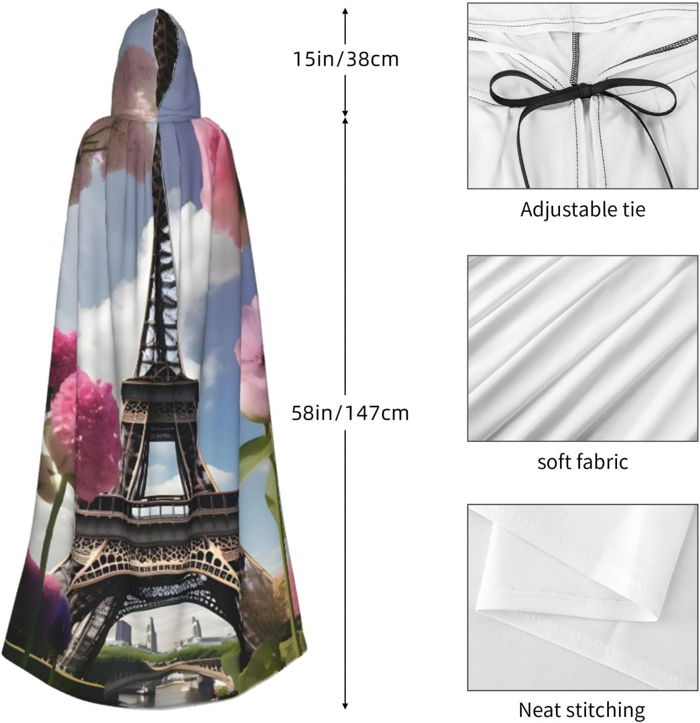 Realizzato in poliestere, questo mantello con stampa floreale Torri Eiffel Parigi con cappuccio garantisce longevità e comfort. Le sue dimensioni ottimali assicurano una copertura completa per tutte le età, facendoti risaltare in qualsiasi evento. Che tu sia diretto per Halloween, un evento cosplay, un costume da palcoscenico, una festa in maschera, una festa a tema, un ballo o una convention di fumetti, questo mantello è una scelta ideale. Il suo design unico, completo di un grande cappuccio e cravatte collare. Inoltre, puoi dire addio ai metodi di pulizia complicati. Questo mantello con cappuccio con stampa floreale Torre Eiffel di Parigi è lavabile in lavatrice e a mano, offrendo una cura senza sforzo. Esci con stile e comfort con il nostro mantello con cappuccio, il tuo compagno per tutti gli eventi e le occasioni.