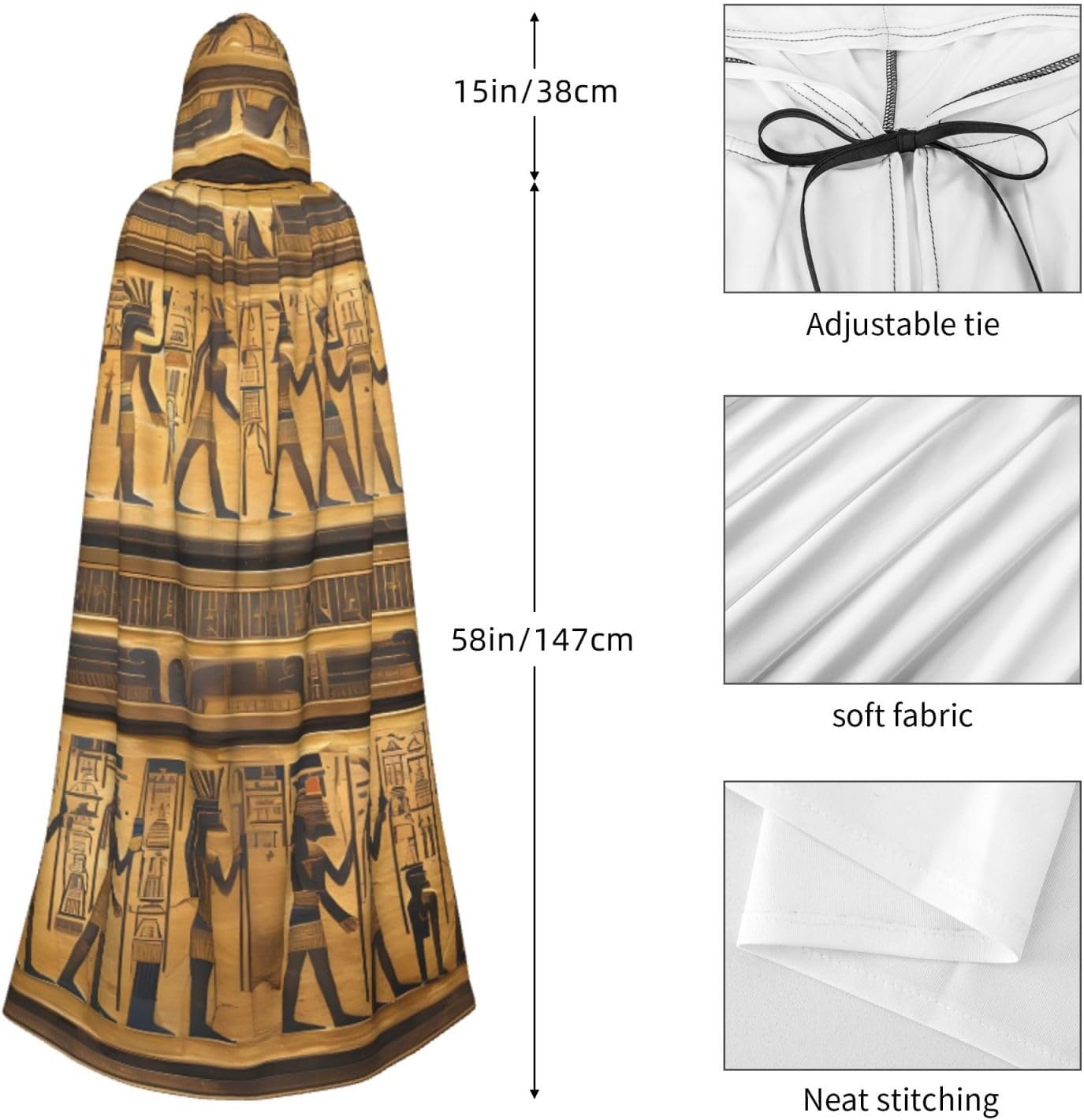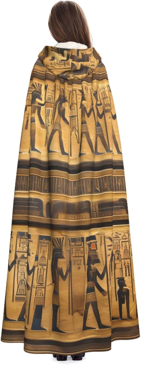 Realizzato in poliestere, questo mantello con stampa geroglifica egiziana con cappuccio garantisce longevità e comfort. Le sue dimensioni ottimali assicurano una copertura completa per tutte le età, facendoti risaltare in qualsiasi evento. Che tu sia diretto per Halloween, un evento cosplay, un costume da palcoscenico, una festa in maschera, una festa a tema, un ballo o una convention di fumetti, questo mantello è una scelta ideale. Il suo design unico, completo di un grande cappuccio e cravatte collare. Inoltre, puoi dire addio ai metodi di pulizia complicati. Questo mantello con cappuccio con stampa geroglifica egiziana è lavabile in lavatrice e a mano, offrendo una cura senza sforzo. Esci con stile e comfort con il nostro mantello con cappuccio, il tuo compagno per tutti gli eventi e le occasioni.
