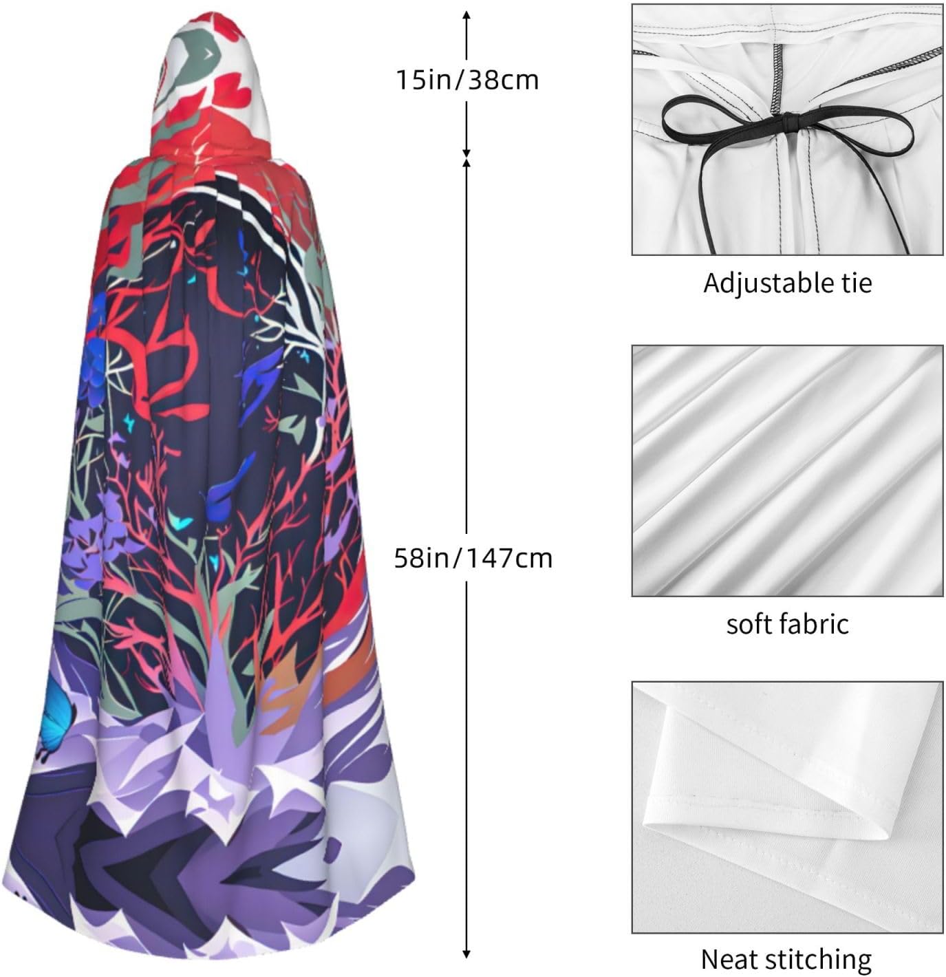 Entra nel mondo della fantasia e dell'avventura con il nostro elegante mantello da donna. Realizzato in fibra di poliestere di alta qualità, questo mantello offre una vestibilità leggera e confortevole, permettendoti di abbracciare i tuoi personaggi preferiti o personaggi per feste in costume, Halloween, fumetti e molto altro ancora. Dotato di un cappuccio oversize e una chiusura con cravatta, questo mantello non solo aggiunge un elemento di mistero, ma completa anche una vasta gamma di scelte di outfit La costruzione garantisce una lunga durata. Uso duraturo senza alcun fastidio o prurito. Che tu stia partecipando a una festa a tema, una danza o un evento cosplay, questo versatile mantello è sicuro di fare una dichiarazione. È perfetto per feste di Halloween, convegni di fumetti, spettacoli teatrali, feste in maschera e altre occasioni festive. Lascia che la tua creatività risplenda e immergiti nel mondo della fantasia. Pulire questo mantello è un gioco da ragazzi, Lavabile in lavatrice. Facile da pulire. Il suo design ti consente di godertelo per gli anni a venire, rendendolo una scelta affidabile ed elegante per tutte le tue esigenze di abbigliamento. Sperimenta l'incanto e il fascino del nostro elegante mantello da donna e diventa al centro dell'attenzione in ogni evento. Migliora il tuo gioco di costumi e crea ricordi indimenticabili con questo accessorio indispensabile. Abbraccia la tua immaginazione e intraprendi un viaggio straordinario oggi!