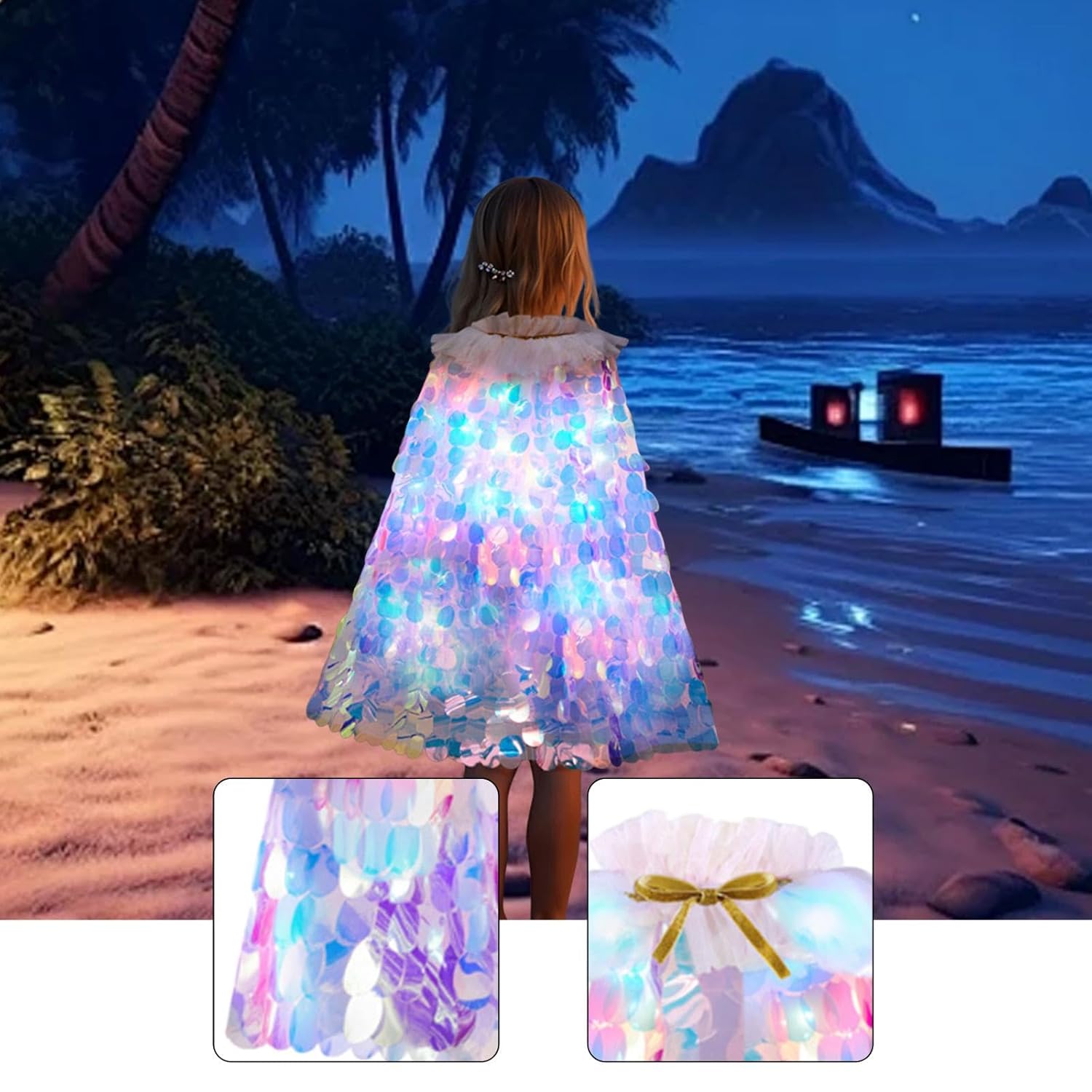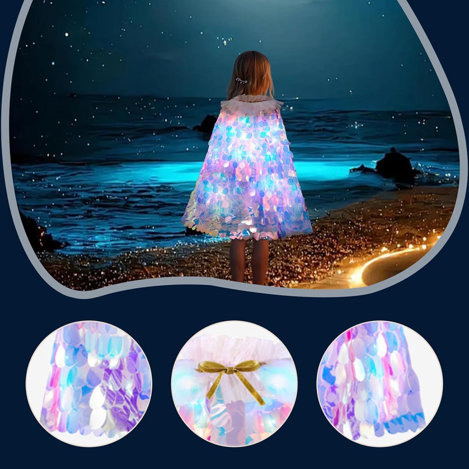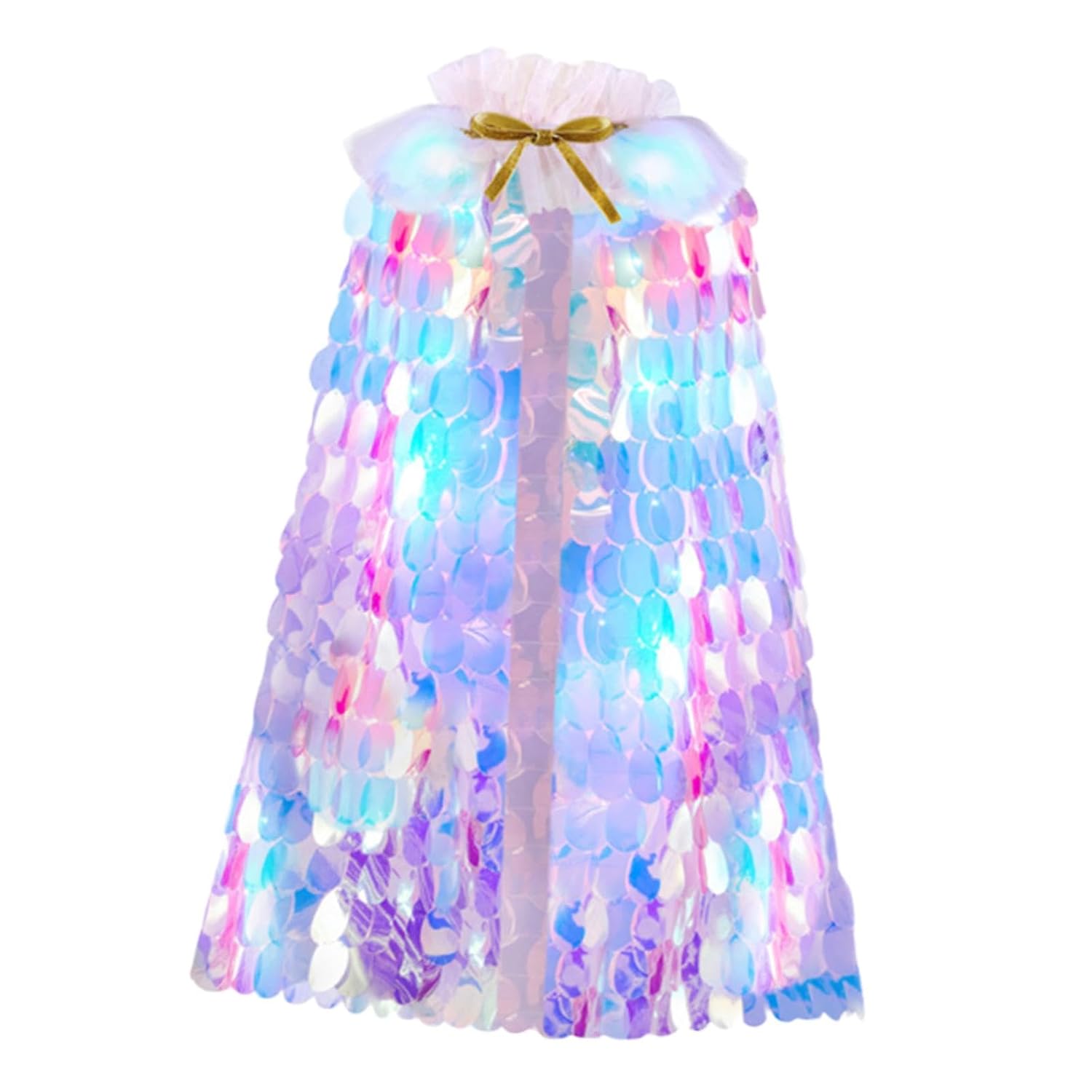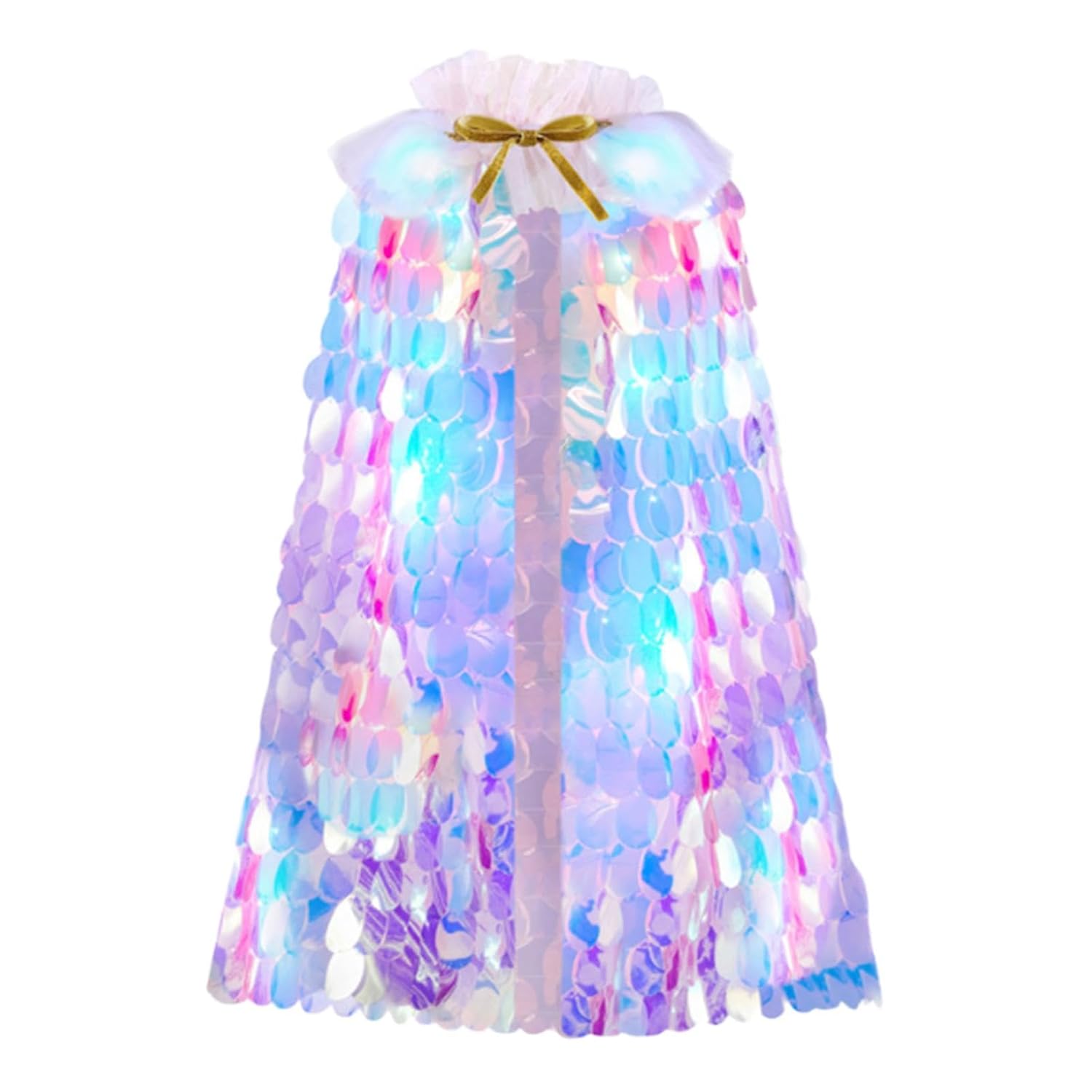 【Materiale morbido e confortevole】 Il costume cosplay è realizzato in tessuto a rete morbido, confortevole e leggero, che ti consente di indossarlo comodamente tutto il giorno. 【Adatto per】: Il mantello in tulle presenta un design regolabile con una lunghezza di 70 cm/27,56 pollici, che lo rende adatto a bambini di età compresa tra 3 e 10 anni e versatile. 【Ideale per le vacanze】: Il mantello da principessa per ragazze perfetto per Halloween, Natale, feste di compleanno o come principessa sirena, aggiungendo un tocco di fantasia a ogni occasione motivo a scaglie scintillanti e luci LED scintillanti che creano un bagliore accattivante per feste ed eventi