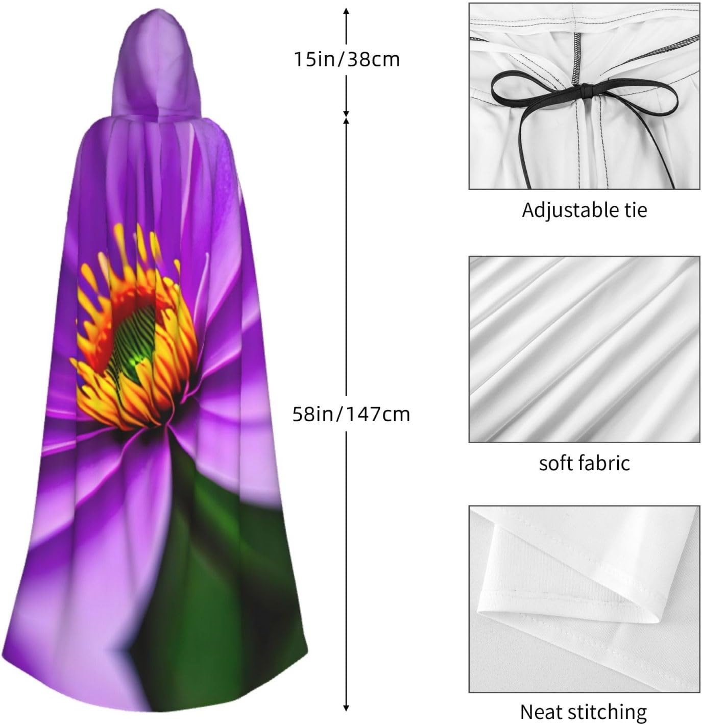 Entra nel mondo della fantasia e dell'avventura con il nostro elegante mantello da donna. Realizzato in fibra di poliestere di alta qualità, questo mantello offre una vestibilità leggera e confortevole, permettendoti di abbracciare i tuoi personaggi preferiti o personaggi per feste in costume, Halloween, fumetti e molto altro ancora. Dotato di un cappuccio oversize e una chiusura con cravatta, questo mantello non solo aggiunge un elemento di mistero, ma completa anche una vasta gamma di scelte di outfit La costruzione garantisce una lunga durata. Uso duraturo senza alcun fastidio o prurito. Che tu stia partecipando a una festa a tema, una danza o un evento cosplay, questo versatile mantello è sicuro di fare una dichiarazione. È perfetto per feste di Halloween, convegni di fumetti, spettacoli teatrali, feste in maschera e altre occasioni festive. Lascia che la tua creatività risplenda e immergiti nel mondo della fantasia. Pulire questo mantello è un gioco da ragazzi, Lavabile in lavatrice. Facile da pulire. Il suo design ti consente di godertelo per gli anni a venire, rendendolo una scelta affidabile ed elegante per tutte le tue esigenze di abbigliamento. Sperimenta l'incanto e il fascino del nostro elegante mantello da donna e diventa al centro dell'attenzione in ogni evento. Migliora il tuo gioco di costumi e crea ricordi indimenticabili con questo accessorio indispensabile. Abbraccia la tua immaginazione e intraprendi un viaggio straordinario oggi!