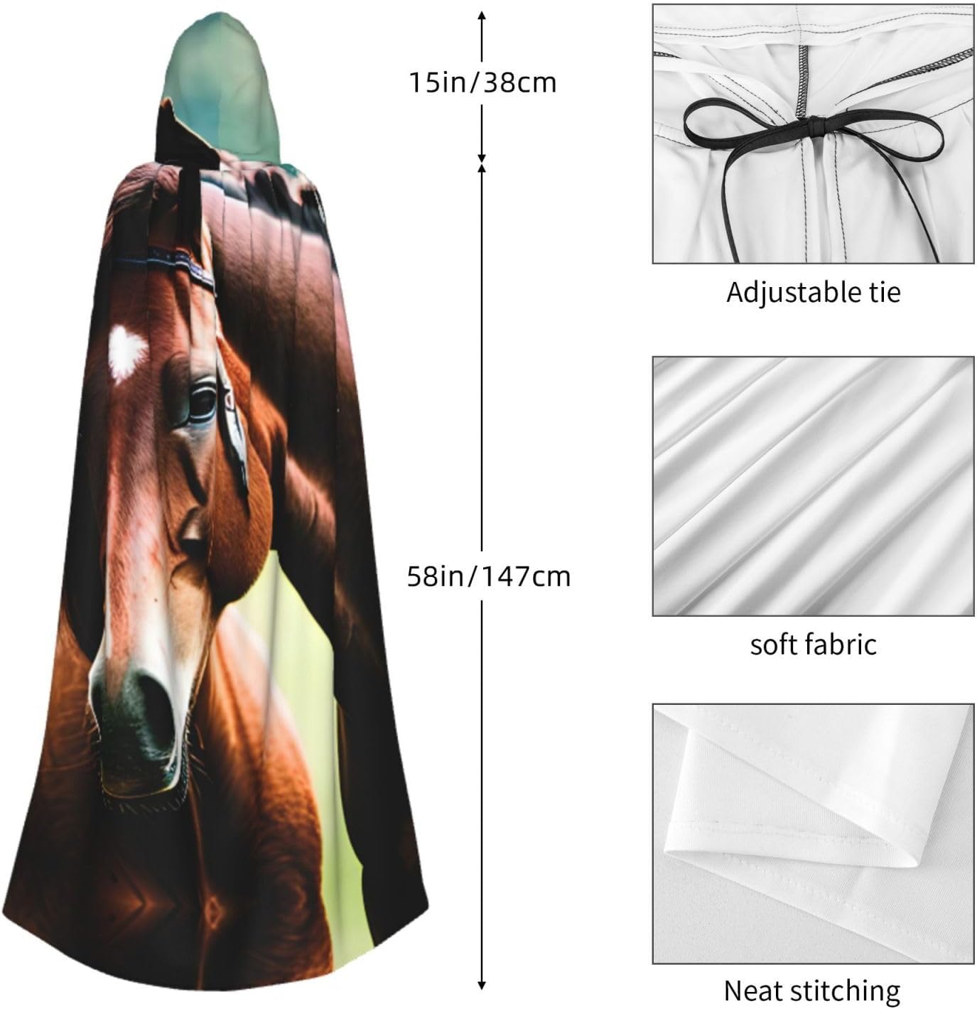 Entra nel mondo della fantasia e dell'avventura con il nostro elegante mantello da donna. Realizzato in fibra di poliestere di alta qualità, questo mantello offre una vestibilità leggera e confortevole, permettendoti di abbracciare i tuoi personaggi preferiti o personaggi per feste in costume, Halloween, fumetti e molto altro ancora. Dotato di un cappuccio oversize e una chiusura con cravatta, questo mantello non solo aggiunge un elemento di mistero, ma completa anche una vasta gamma di scelte di outfit La costruzione garantisce una lunga durata. Uso duraturo senza alcun fastidio o prurito. Che tu stia partecipando a una festa a tema, una danza o un evento cosplay, questo versatile mantello è sicuro di fare una dichiarazione. È perfetto per feste di Halloween, convegni di fumetti, spettacoli teatrali, feste in maschera e altre occasioni festive. Lascia che la tua creatività risplenda e immergiti nel mondo della fantasia. Pulire questo mantello è un gioco da ragazzi, Lavabile in lavatrice. Facile da pulire. Il suo design ti consente di godertelo per gli anni a venire, rendendolo una scelta affidabile ed elegante per tutte le tue esigenze di abbigliamento. Sperimenta l'incanto e il fascino del nostro elegante mantello da donna e diventa al centro dell'attenzione in ogni evento. Migliora il tuo gioco di costumi e crea ricordi indimenticabili con questo accessorio indispensabile. Abbraccia la tua immaginazione e intraprendi un viaggio straordinario oggi!