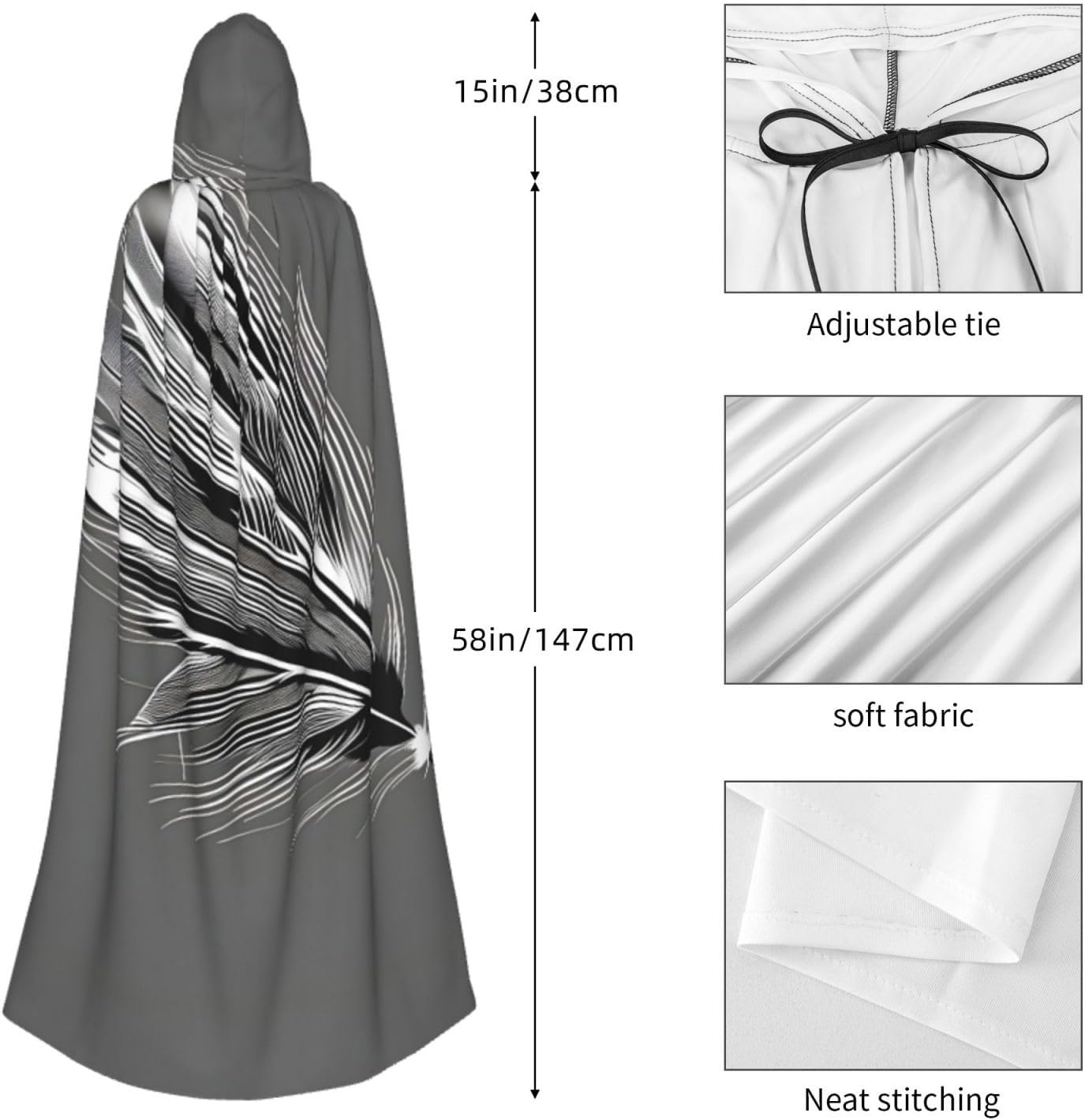 Entra nel mondo della fantasia e dell'avventura con il nostro elegante mantello da donna. Realizzato in fibra di poliestere di alta qualità, questo mantello offre una vestibilità leggera e confortevole, permettendoti di abbracciare i tuoi personaggi preferiti o personaggi per feste in costume, Halloween, fumetti e molto altro ancora. Dotato di un cappuccio oversize e una chiusura con cravatta, questo mantello non solo aggiunge un elemento di mistero, ma completa anche una vasta gamma di scelte di outfit La costruzione garantisce una lunga durata. Uso duraturo senza alcun fastidio o prurito. Che tu stia partecipando a una festa a tema, una danza o un evento cosplay, questo versatile mantello è sicuro di fare una dichiarazione. È perfetto per feste di Halloween, convegni di fumetti, spettacoli teatrali, feste in maschera e altre occasioni festive. Lascia che la tua creatività risplenda e immergiti nel mondo della fantasia. Pulire questo mantello è un gioco da ragazzi, Lavabile in lavatrice. Facile da pulire. Il suo design ti consente di godertelo per gli anni a venire, rendendolo una scelta affidabile ed elegante per tutte le tue esigenze di abbigliamento. Sperimenta l'incanto e il fascino del nostro elegante mantello da donna e diventa al centro dell'attenzione in ogni evento. Migliora il tuo gioco di costumi e crea ricordi indimenticabili con questo accessorio indispensabile. Abbraccia la tua immaginazione e intraprendi un viaggio straordinario oggi!