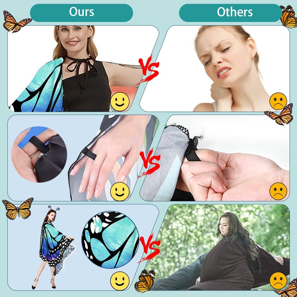 Das ist die beste Investition, die ich im letzten Jahr getätigt habe. Die Farben sind kräftig, das Halsband hat bei mir super gepasst. Kratzt nicht und würgt einen auch nicht. Der Stoff ist überraschend gut. Kein billiges, hartes Plastikzeug. Sondern tatsächlich sehr weich, etwas schwerer, flattert aber super im Wind. Es sieht echt schön aus. Selbst mein Vater ist damit durchs Wohnzimmer getanzt wie eine Elfenkönigin :-D Bei ihm saß aber das Halsband etwas zu eng. Es gibt Fingerschlaufen, so muss man die Flügel nicht festhalten. Ich bin 1,74 groß, sie reichen fast bis zum Fußboden und ich kann die Arme ausstrecken ohne dass was spannt. Das Kostüm macht mich glücklicher als es vielleicht sollte. Mies gelaunt? Schlechten Tag gehabt? Das hier macht es aus irgendeinem Grund besser.