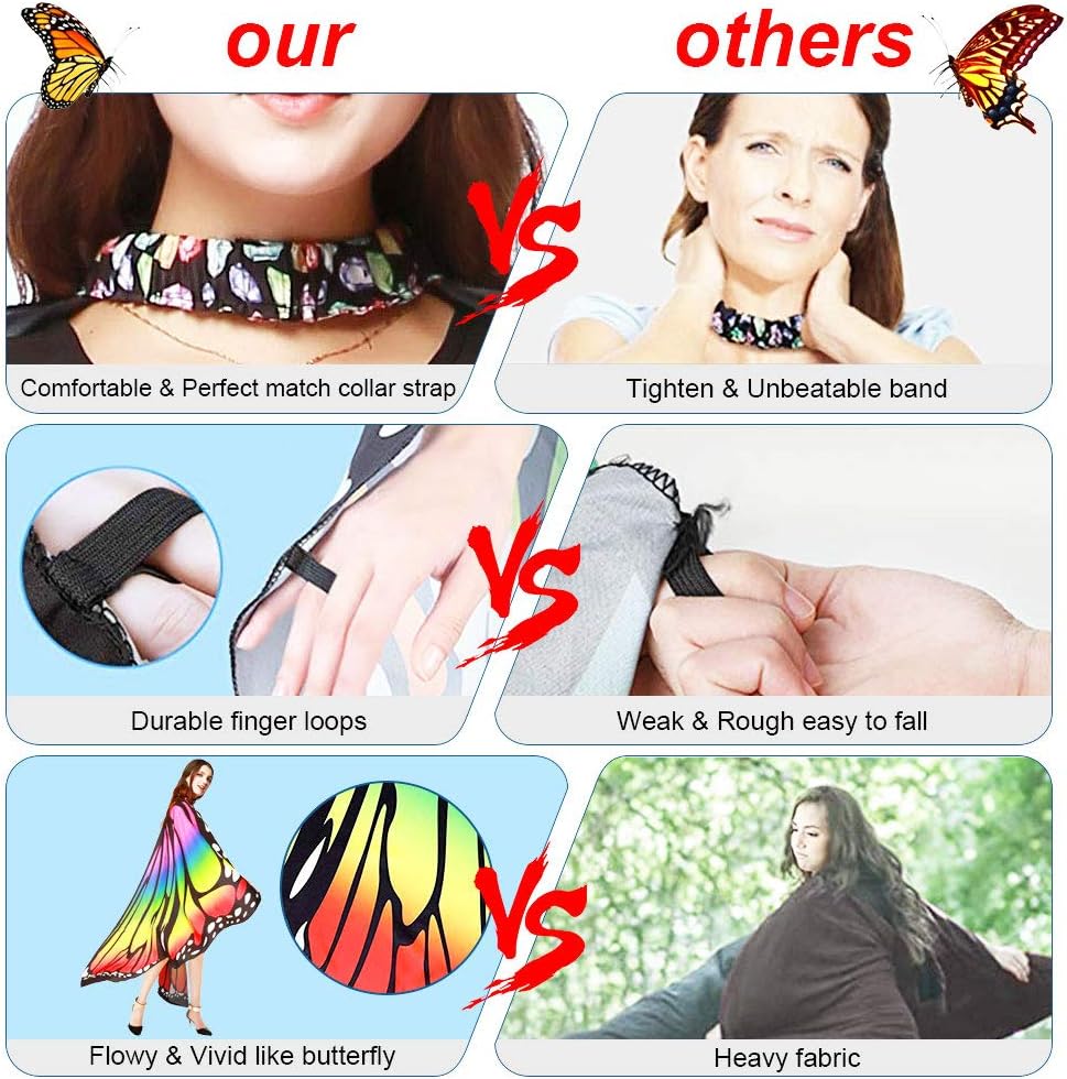 Das ist die beste Investition, die ich im letzten Jahr getätigt habe. Die Farben sind kräftig, das Halsband hat bei mir super gepasst. Kratzt nicht und würgt einen auch nicht. Der Stoff ist überraschend gut. Kein billiges, hartes Plastikzeug. Sondern tatsächlich sehr weich, etwas schwerer, flattert aber super im Wind. Es sieht echt schön aus. Selbst mein Vater ist damit durchs Wohnzimmer getanzt wie eine Elfenkönigin :-D Bei ihm saß aber das Halsband etwas zu eng. Es gibt Fingerschlaufen, so muss man die Flügel nicht festhalten. Ich bin 1,74 groß, sie reichen fast bis zum Fußboden und ich kann die Arme ausstrecken ohne dass was spannt. Das Kostüm macht mich glücklicher als es vielleicht sollte. Mies gelaunt? Schlechten Tag gehabt? Das hier macht es aus irgendeinem Grund besser.