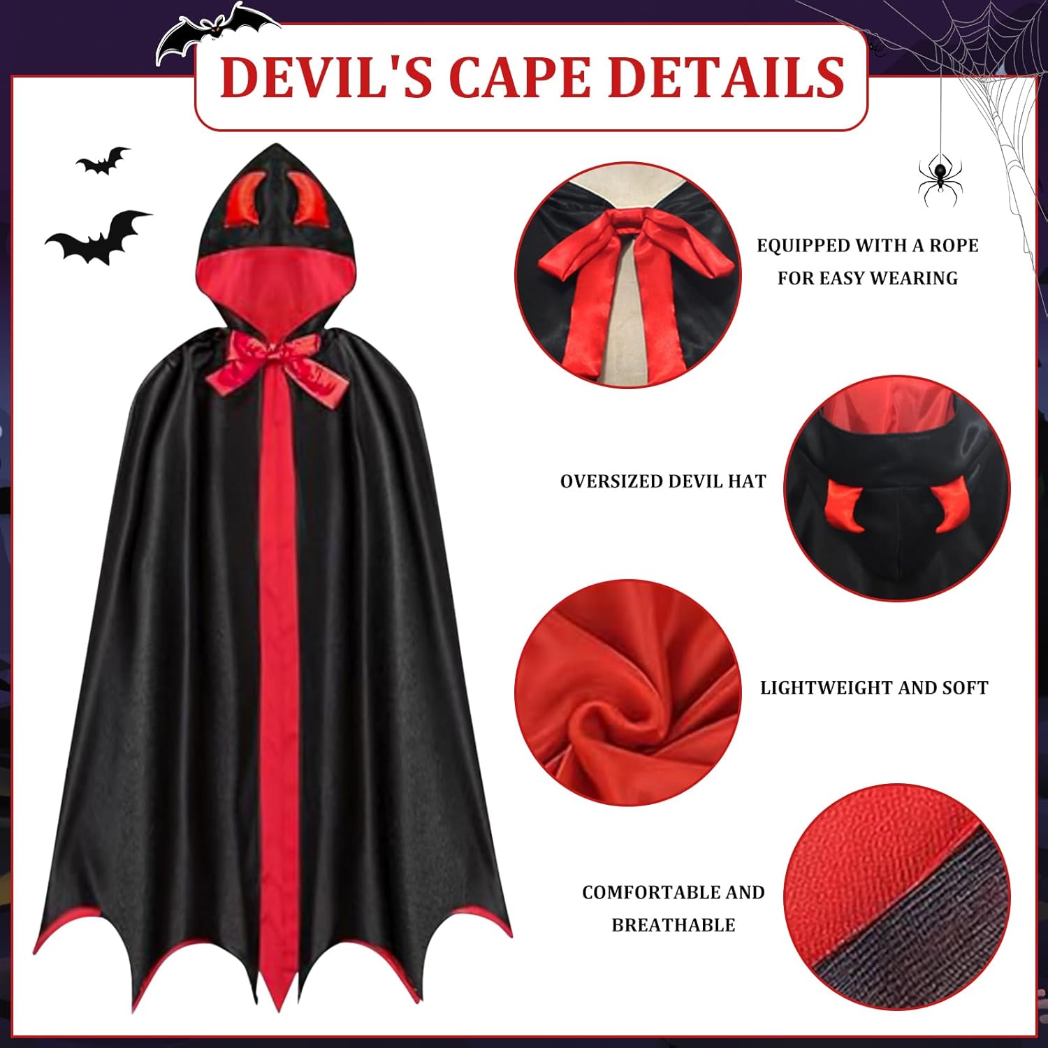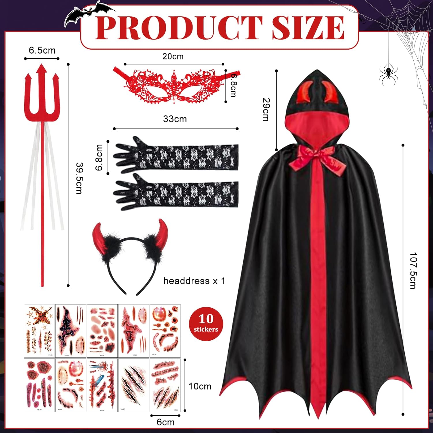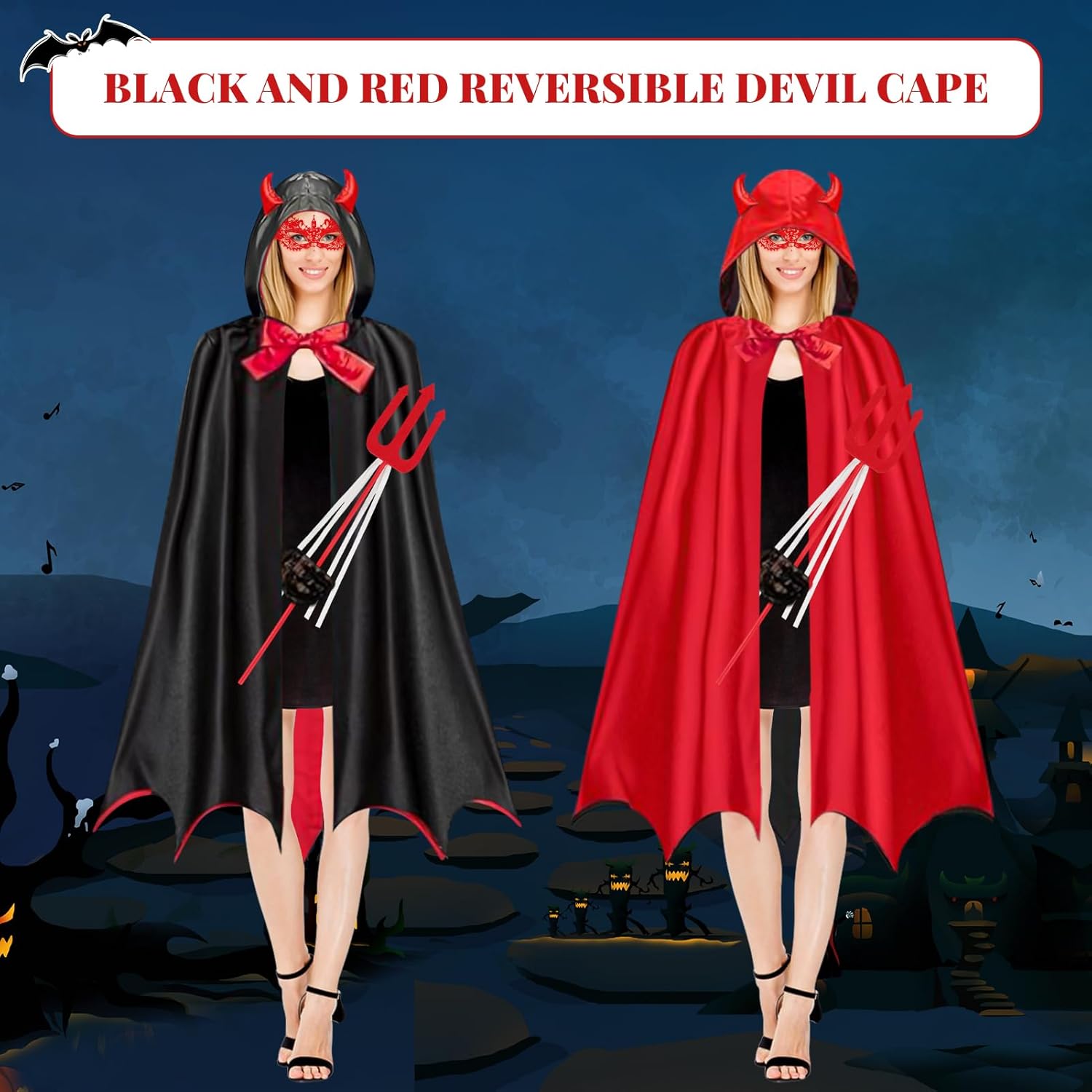 Mantello Diavolo Donna, Halloween Mantello da Vampiro Donna, Mantello con Cappuccio Nero Rosso Reversibile, Costume halloween donna, con Forchetta del Diavolo Guanti Gli Occhi in Pizzo. Caratteristiche: -Con il suo stile raffinato e la vestibilità impeccabile, il Costume Diavolo Donna ti farà sentire unica e affascinante. -Il design versatile del Costume Diavolo Donna assicura che tu possa indossarlo con sicurezza e eleganza in ogni situazione. -La qualità superiore del Mantello Diavolo Donna lo distingue dalle alternative meno curate. -Con questi accessori, il Costume halloween donna diventa la scelta ideale per un costume completo e affascinante. - La sua capacità di trasformare il tuo look rende il Mantello Diavolo Donna un must-have per ogni appassionata di costumi. Specifiche del prodotto: *Materiale:poliestere. *Colore: Come mostrato nell'immagine. *Dimensioni: Come mostrato nell'immagine. Il pacchetto include: 1 x Copricapo del diavolo, 1 x forchetta da diavolo, 1 x maschera in pizzo, 1 x guanti in pizzo, 10 x tatuaggi temporanei. Nota: *Si prega di consentire una leggera differenza di dimensione a causa della diversa misurazione manuale. *A causa della luce e della differenza di impostazione dello schermo, il colore dell'articolo potrebbe essere leggermente diverso dalle immagini.