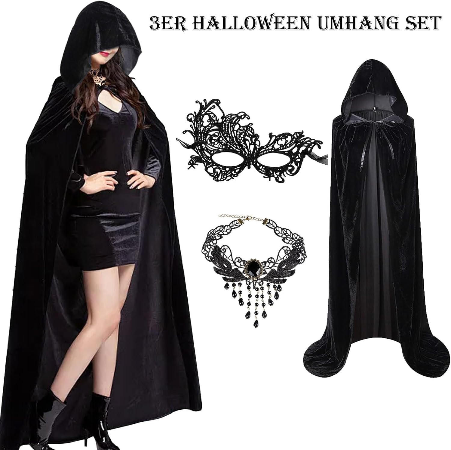 Mantello Halloween donne con maschera e collana, 3pcs velluto nero mantello con cappuccio Set 140/150cm Halloween Costume Vampiro mantello nero cappotto per Halloween Carnevale Cosplay Party