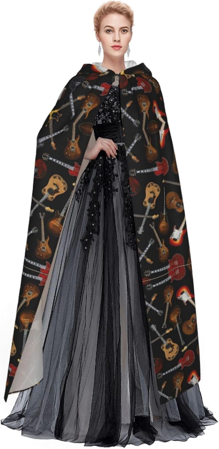 Mantello lungo con cappuccio con stampa di chitarre, per adulti, per Natale, Halloween, feste a tema, giochi di ruolo