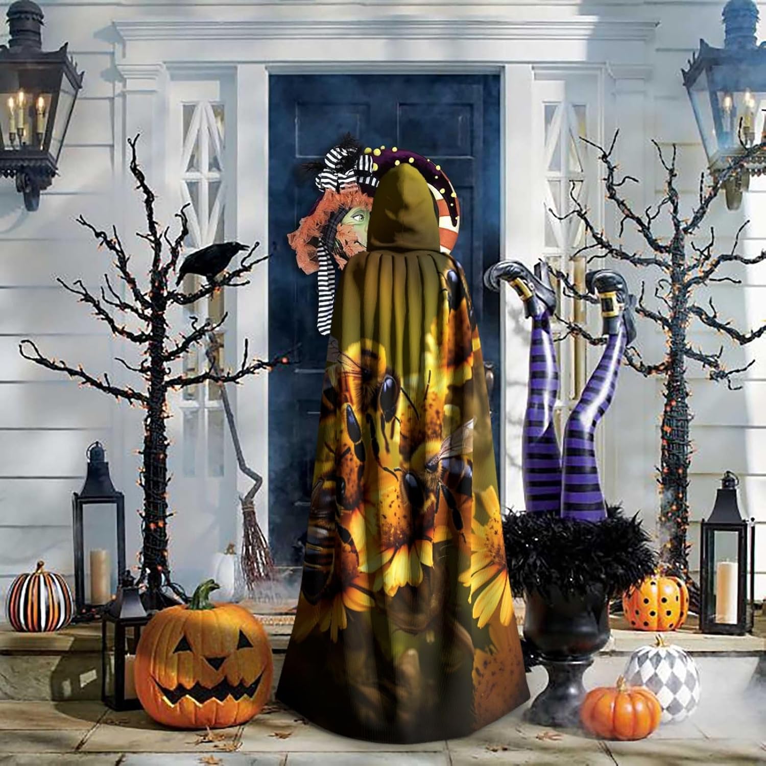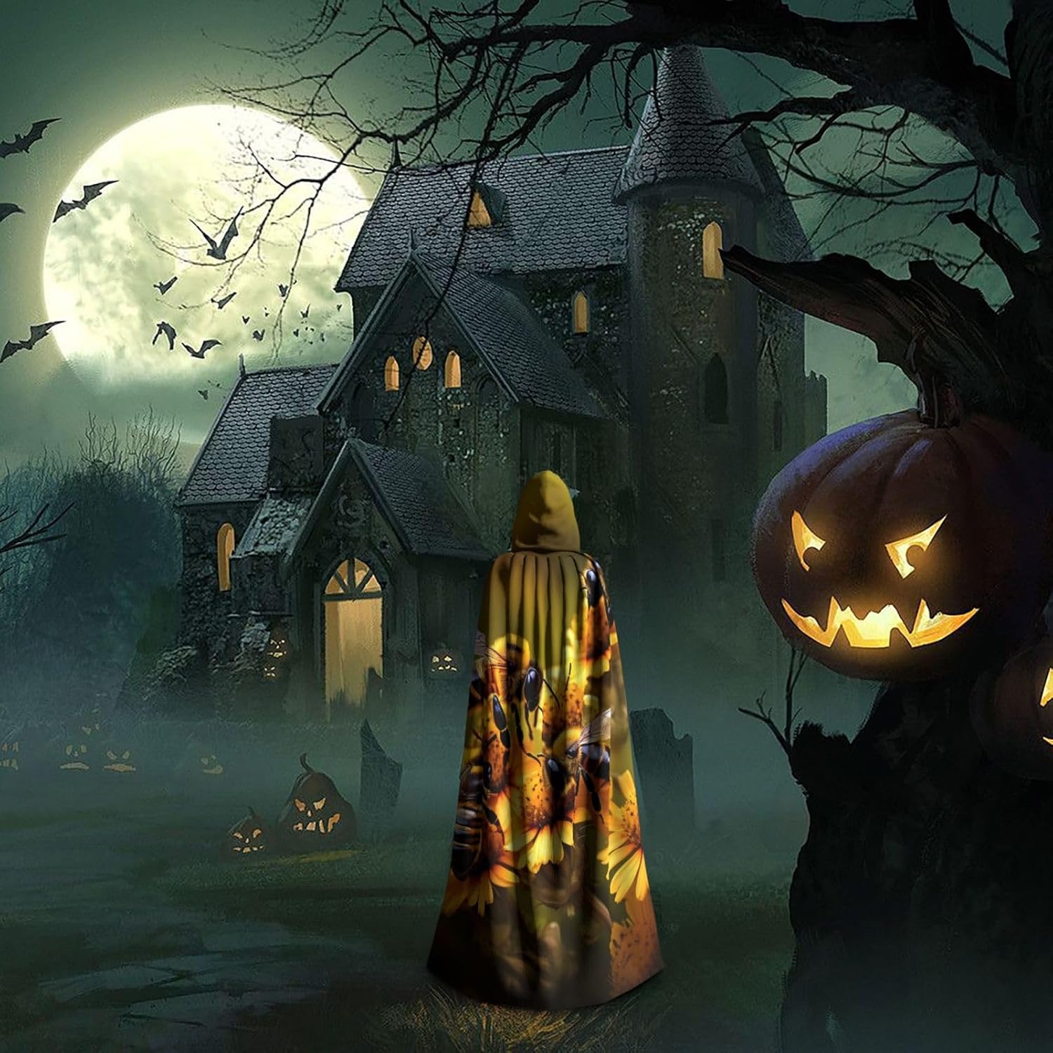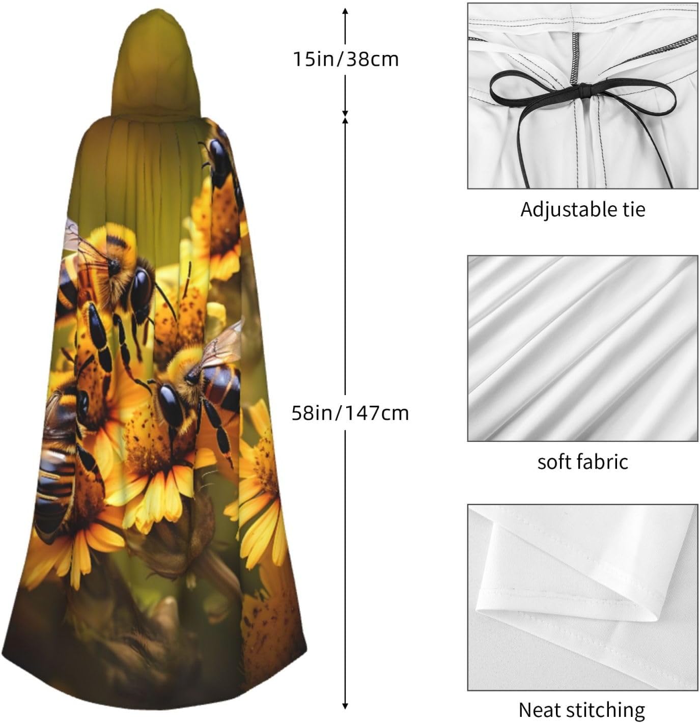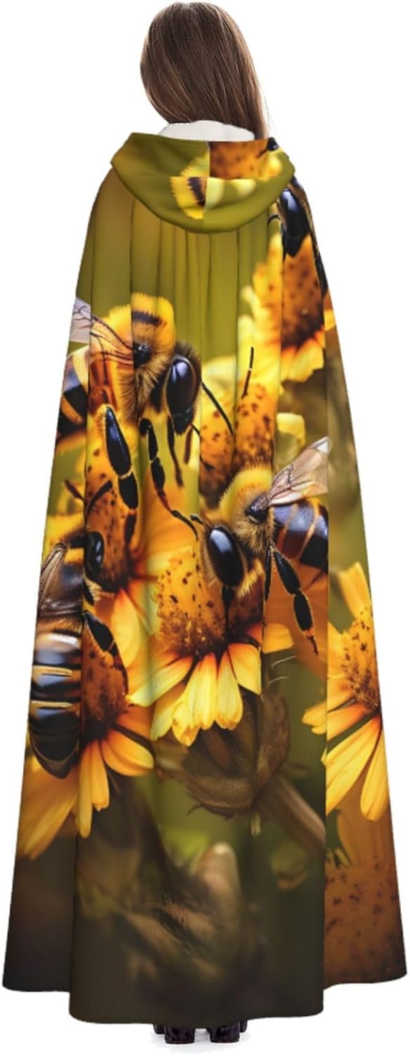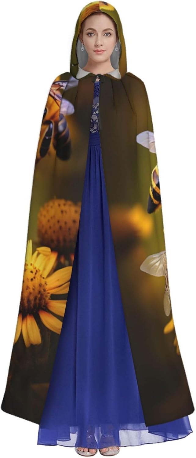 Il mantello con cappuccio per Halloween è realizzato con tessuto in poliestere morbido anche sulla pelle, prevenendo qualsiasi irritazione. Il mantello presenta un ampio cappuccio e uno stile annodato senza cerniere per un design sofisticato ed elegante. Con la sua dimensione universale, offre una copertura completa, adatta a tutti, assicurandoti di distinguerti tra la folla. Questo mantello rurale con stampa di api e fiori non è solo per Halloween; è abbastanza versatile per cosplay, spettacoli teatrali, balli in maschera, feste a tema e molto altro ancora.