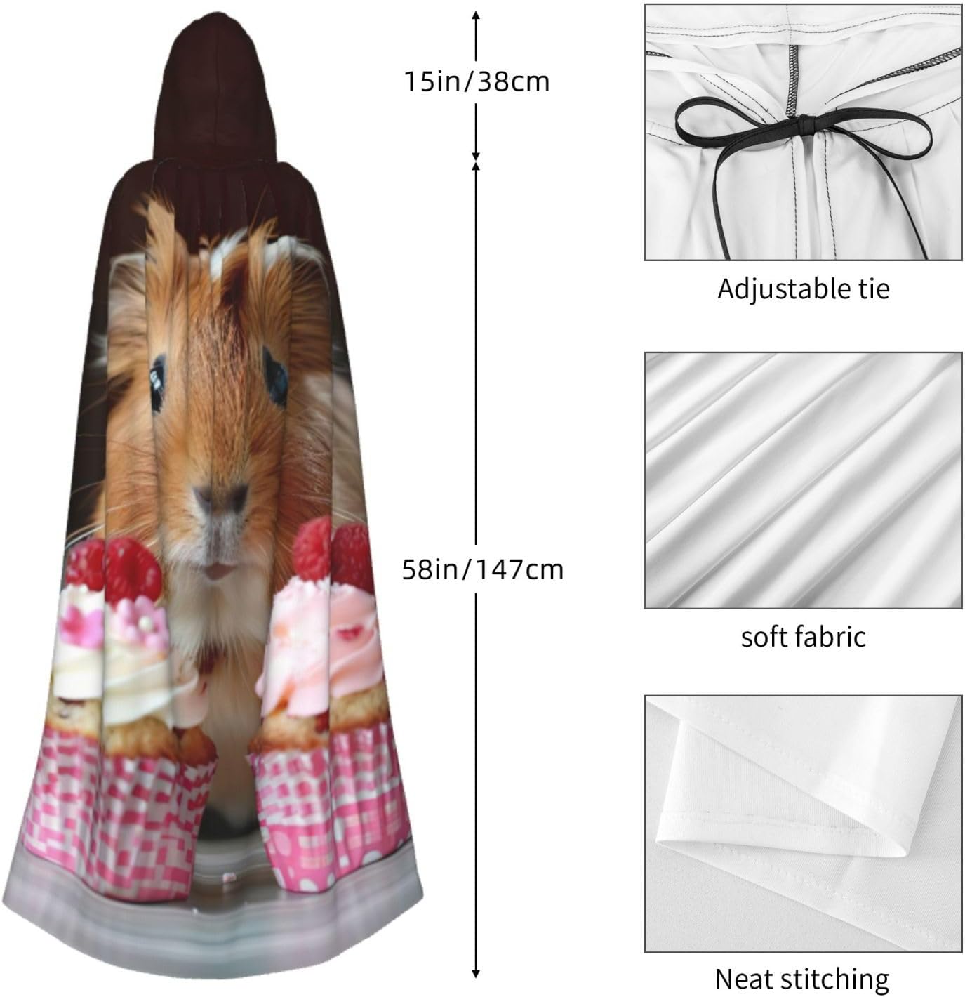 Realizzato in poliestere, questo mantello con stampa di porcellini d'India e cupcake con cappuccio garantisce longevità e comfort. Le sue dimensioni ottimali assicurano una copertura completa per tutte le età, facendoti risaltare in qualsiasi evento. Che tu sia diretto per Halloween, un evento cosplay, un costume da palcoscenico, una festa in maschera, una festa a tema, un ballo o una convention di fumetti, questo mantello è una scelta ideale. Il suo design unico, completo di un grande cappuccio e cravatte collare. Inoltre, puoi dire addio ai metodi di pulizia complicati. Questo mantello con cappuccio con stampa di porcellini d'India e Cupcakes è lavabile in lavatrice e a mano, offrendo una cura senza sforzo. Esci con stile e comfort con il nostro mantello con cappuccio, il tuo compagno per tutti gli eventi e le occasioni.