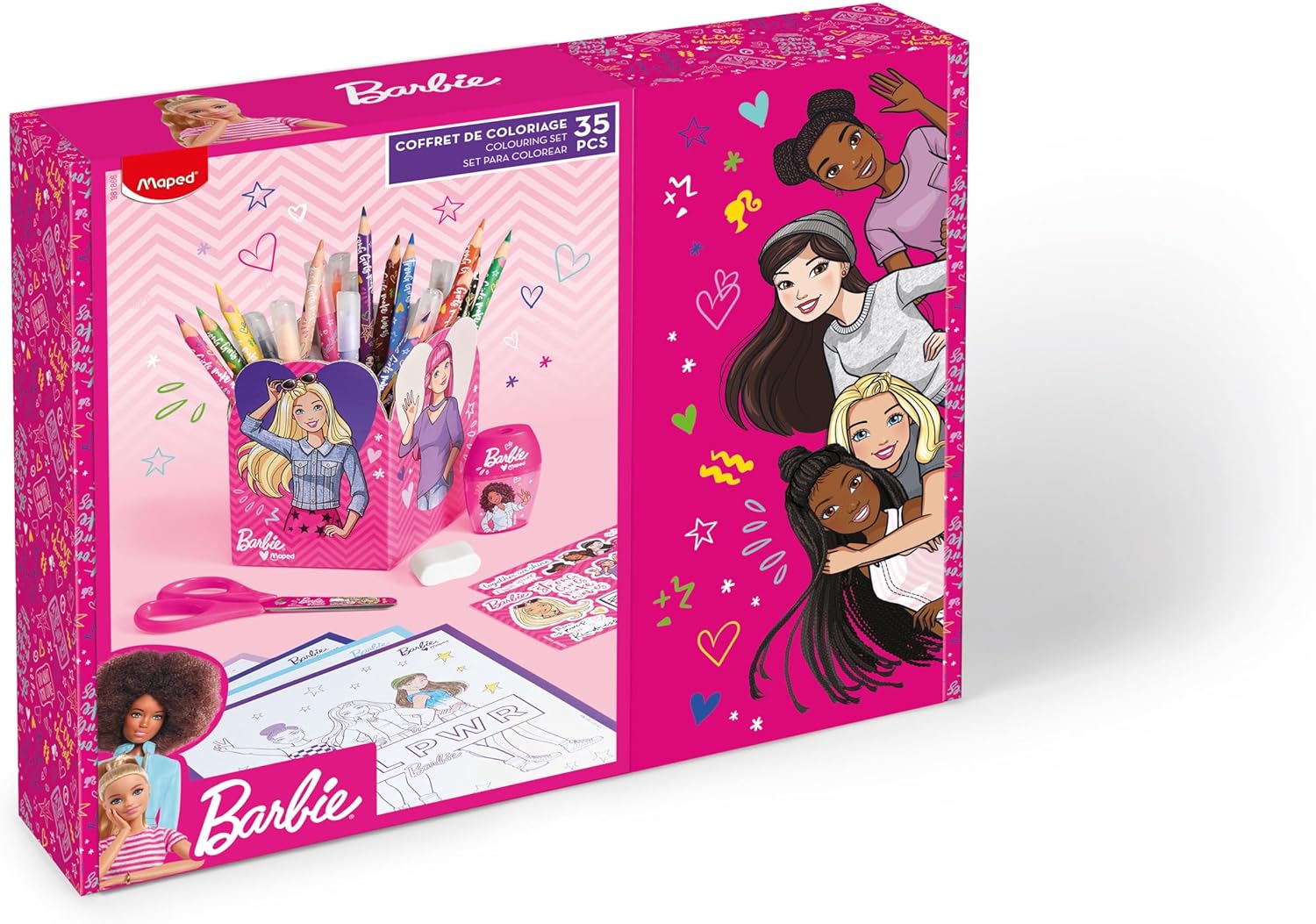 Confezione da colorare Barbie: con questa confezione regalo, i bambini si immergono nel mezzo dell'universo Barbie, intramontabile e accattivante. I bambini troveranno in questa splendida confezione regalo tutti gli strumenti indispensabili per colorare e molto altro ancora, il tutto con l'effigie Barbie! 12 matite colorate, 12 pennarelli, 1 temperamatite, 1 paio di forbici da 13 cm, 1 gomma, 2 fogli di adesivi, 5 fogli da colorare e 1 vaso per raggi fai da te, per riporre tutte le forniture CRAYONS, FELLI E FOGLIE DI COLORAZIONE BARBIE: Ogni matita e ogni feltro è decorato con una Barbie unica... Quale sarà la preferita dei bambini? La qualità Maped è all'appuntamento: matite ergonomiche a forma triangolare, pennarelli resistenti all'asciugatura... Cosa colorare e disegnare per lungo tempo, sui 5 fogli da colorare pre-riempiti di belle Barbies! Numerosi negozi e accessori per barbie: questa bella confezione regalo delizierà i bambini con tutti i suoi accessori abbinati Maped, per immergersi ore nell'universo Barbie. Temperamatite e forbici ergonomiche (dai 4 anni), gomma tubo protetto iper tendenza… Per non parlare dei fogli di adesivi Barbie, per personalizzare un quaderno o una scatola per merenda! COLLEZIONE UFFICIALE BARBIE X MAPED: Un modo divertente per rendere l'apprendimento ancora più emozionante! Bagnata con la famosa rosa Barbie e modernità, questa collezione incarna la perfetta alleanza tra stile e autoaffermazione. Lascia libero sfogo alla tua creatività e immaginazione. Con Barbie "puoi essere tutto quello che vuoi". CAMBIARE IL MONDO CON LE SUE MANI: Maped ha innovato da oltre 75 anni affinché i bambini di tutto il mondo coltivino il loro immaginario, sviluppino le loro conoscenze, imparino e creino con le loro mani. Strumenti innovativi e forniture scolastiche sostenibili appositamente progettati per loro... Giorno dopo giorno, Maped consente ai bambini di cambiare il mondo con le loro mani!