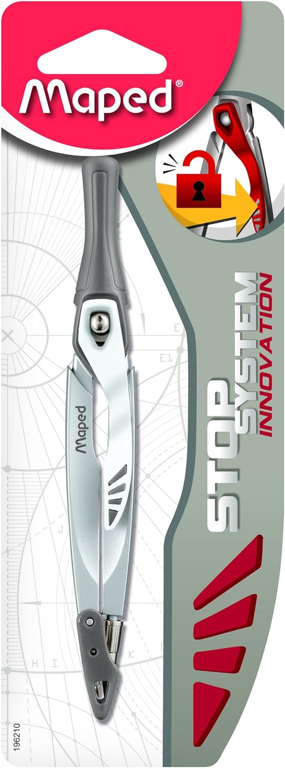 TRACCE PERFETTE: Grazie al sistema brevettato di bloccaggio dei bracci, il compasso Stop System garantisce un raggio invariato per tutta la durata del tracciamento. Questa esclusiva innovazione Maped consente di appoggiare e maneggiare lo strumento senza tensione e senza dover ricontrollare la misura di apertura. Apri la leva, quindi regola la distanza dei bracci, chiudi la leva per bloccare i bracci e traccia un cerchio perfetto! CACHE PUNTA SICUREZZA: La bussola è dotata di un sistema di protezione che si piega sia sulla punta asciutta che sulla matita. Questa sicurezza aiuta a evitare qualsiasi pericolo con la punta e protegge la bussola in caso di caduta PERFETTO PER LA TROUSSE: La bussola miniera Stop System di Maped è una bussola facile da infilare nel kit. Questa bussola miniera è indispensabile per il rientro a scuola COMPAS STOP SYSTEM: La bussola Stop System illustra la forza di innovazione di Maped che unisce know-how tradizionale e innovazioni rivoluzionarie. La bussola Maped, oggetto iconico e simbolo del marchio da oltre 70 anni, viene reinventata per diventare una delle innovazioni dell'anno MAPED : Fin dalla sua istituzione nel 1947, la società Maped (Produzione di articoli di precisione e disegno) sostiene il suo sviluppo sul suo know-how industriale, cultura dell'innovazione e reattività per offrire ai suoi utenti soluzioni sempre più efficienti e sostenibili
