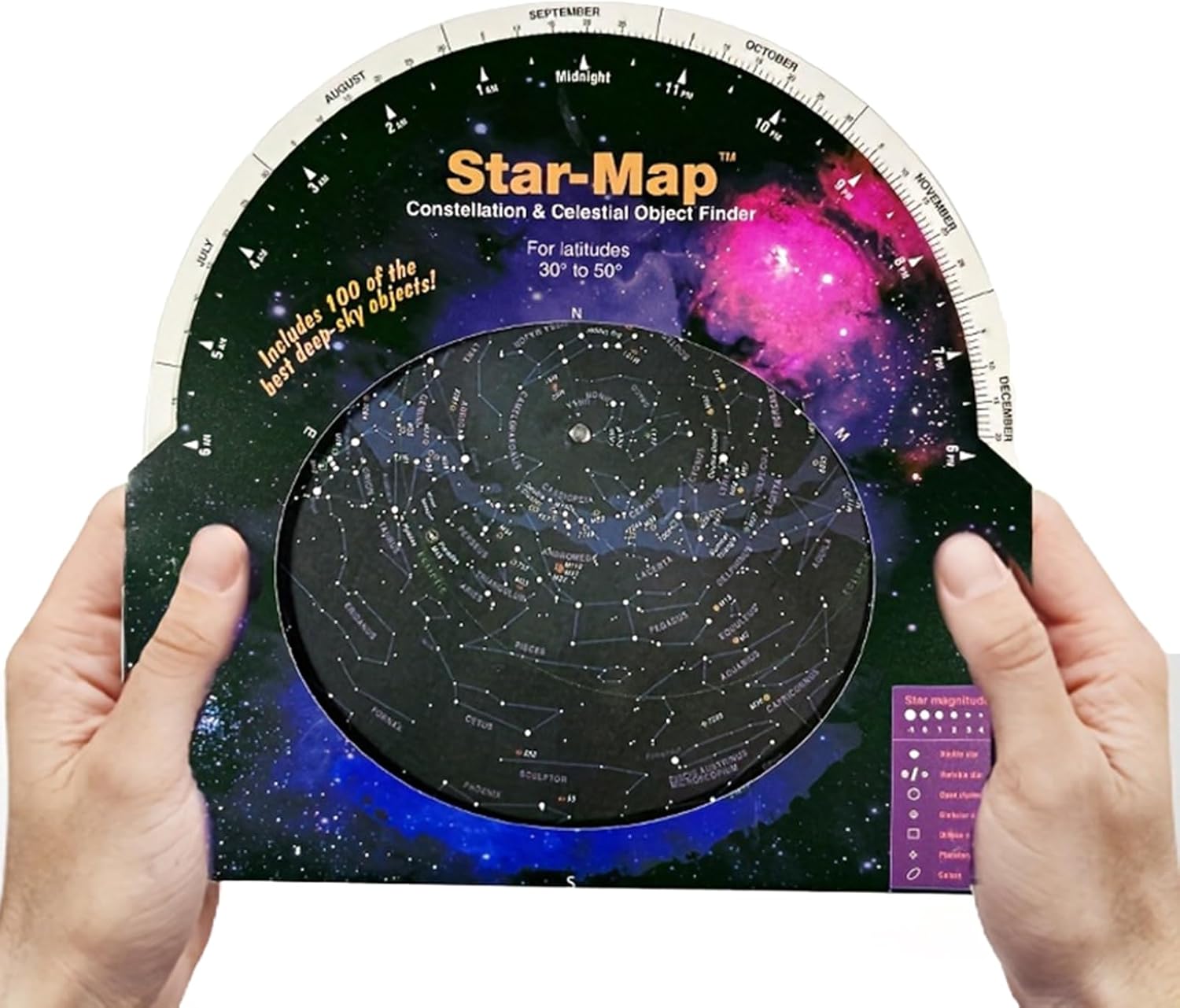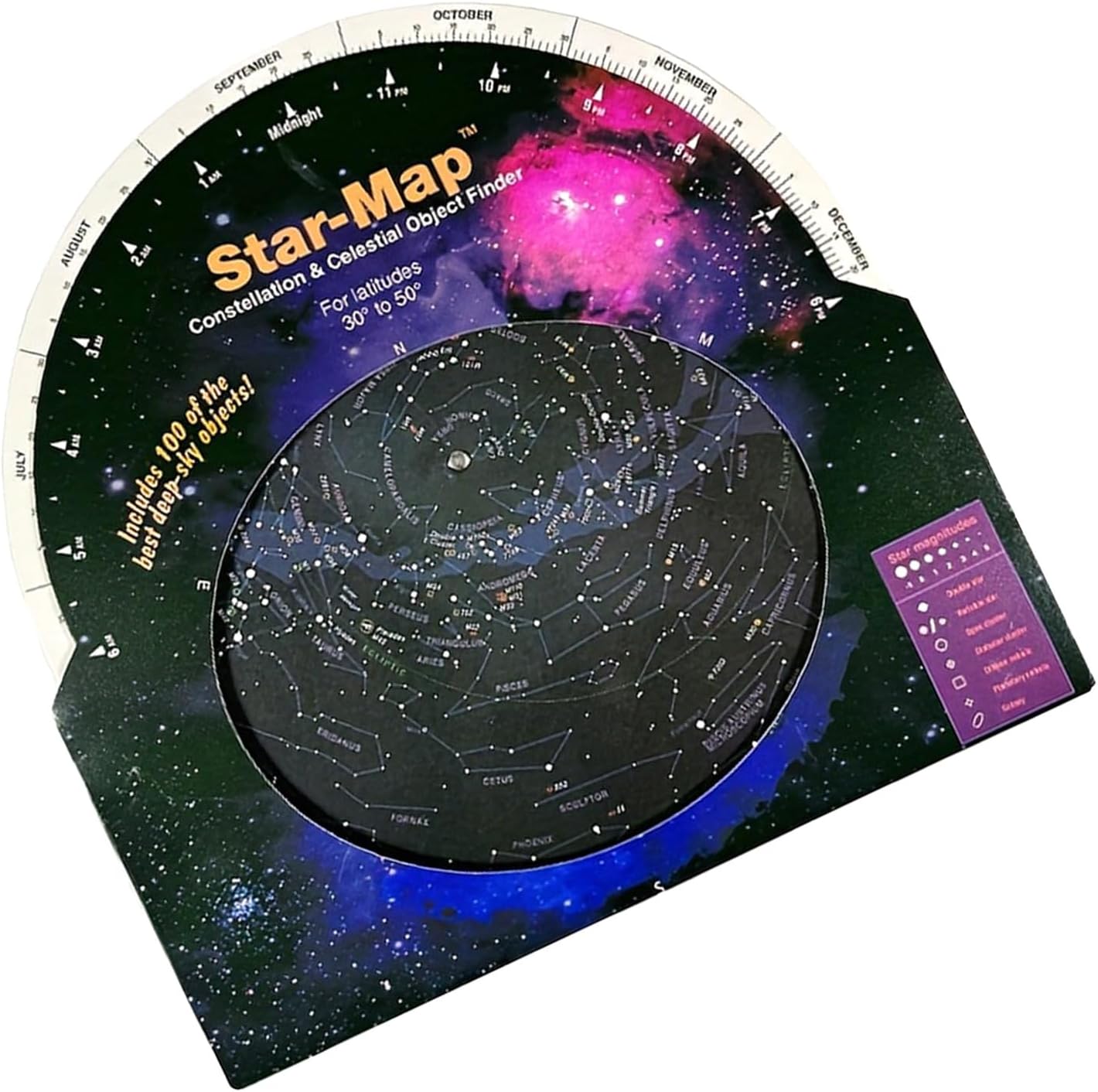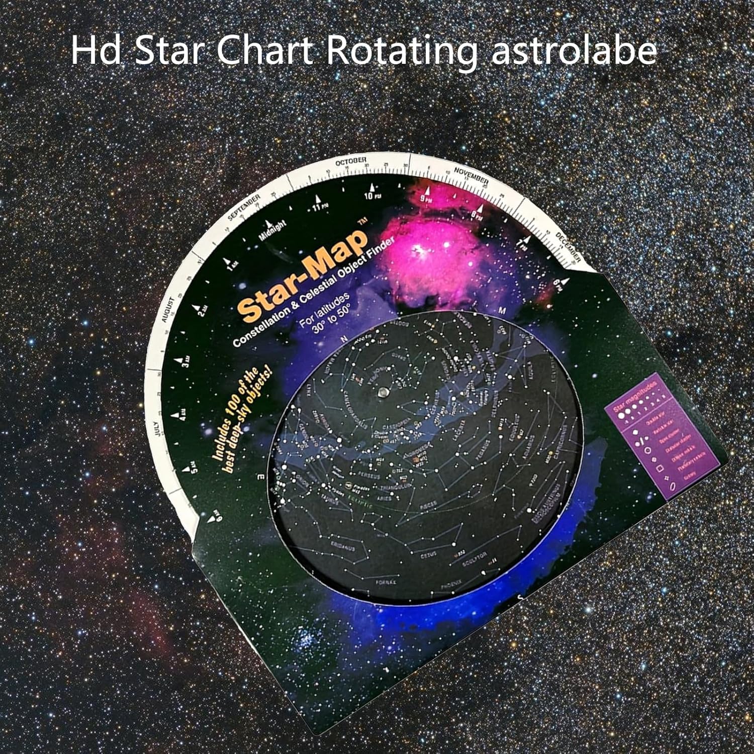 Guida stellare: Questa mappa fornisce agli appassionati di astronomia una guida chiara per conoscere le costellazioni, stella luminosa,. Lucida le tue abilità di osservazione delle stelle con questo strumento essenziale. Facile da usare: basta allineare la data e l'ora e questa guida a stella rotante ti mostrerà sopra la testa. È facile da usare e ideale per astronomi avanzati e principianti. Ottima opzione telescopica: che tu stia usando un binocolo, questa guida stellare è un ottimo accessorio per le tue osservazioni astronomiche. Progettato per l'uso entro 30 gradi a 50 gradi gamme settentrionali, può essere utilizzato indipendentemente dall'anno solare. Goditi lo sguardo senza ostacoli delle stelle tutto l'anno. Strumento educativo: la guida stellare mostra le posizioni di 100 ammassi stellari e galassie. È il buon aiuto per osservare questi corpo attraverso un binocolo.