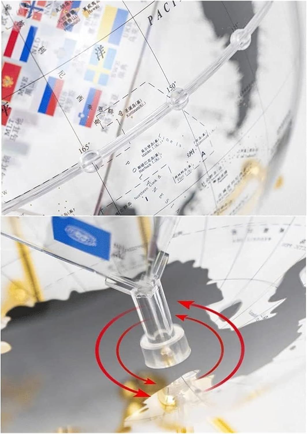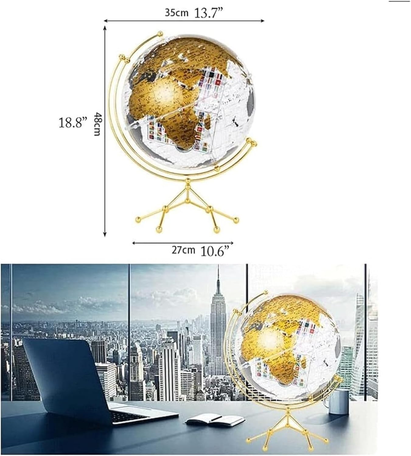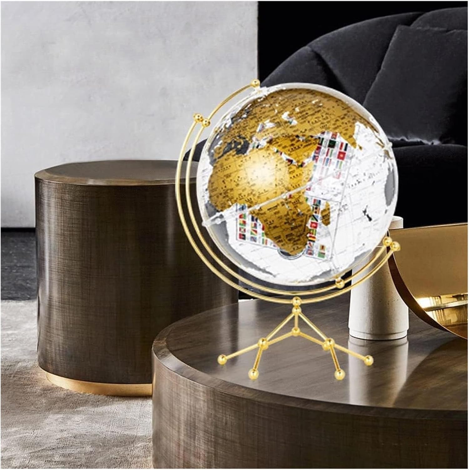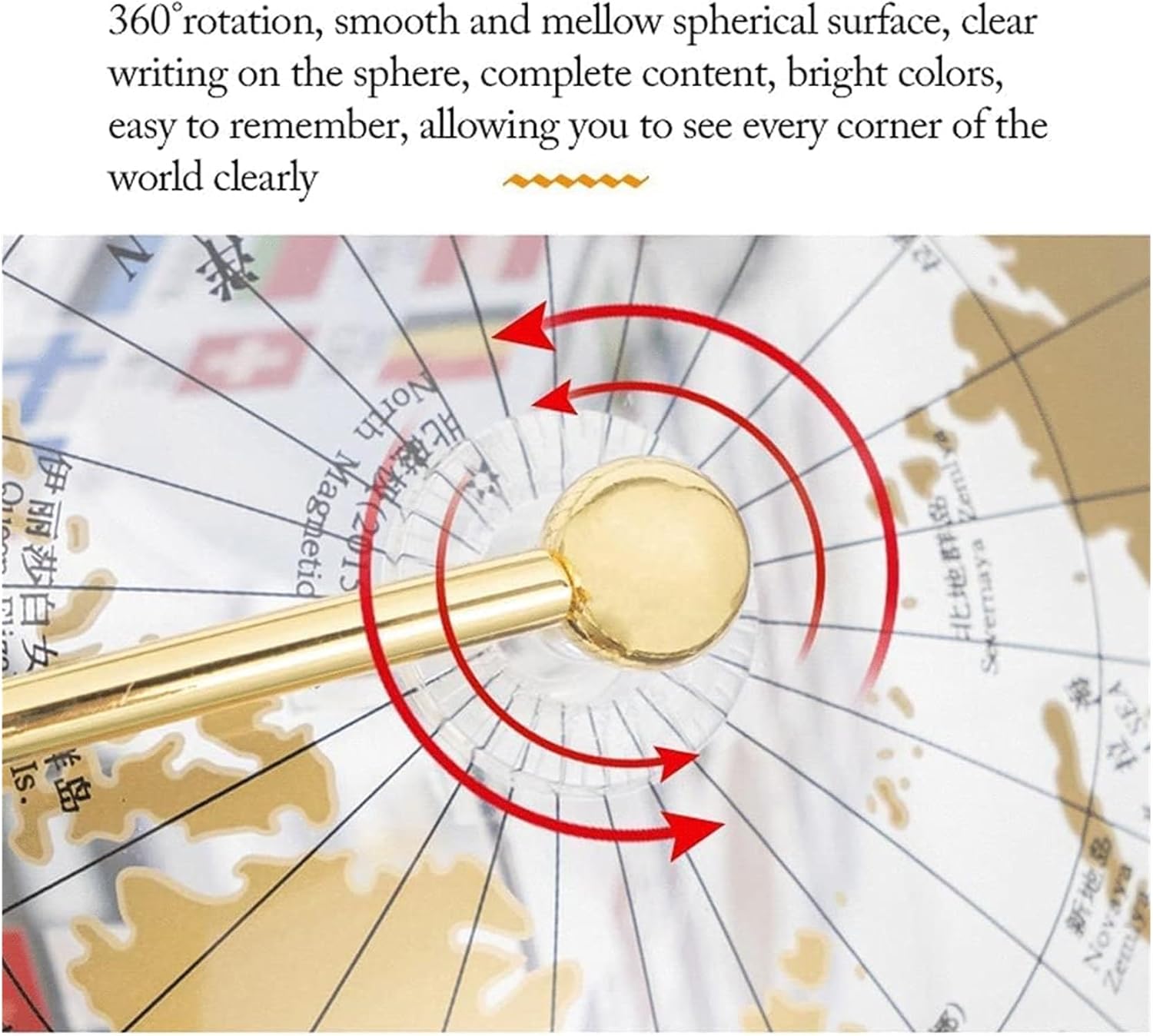 I globi sono eccellenti strumenti educativi e il modo perfetto per ispirare l'apprendimento e l'esplorazione della geografia mondiale. I globi forniscono un modo divertente per introdurre la geografia. Costituiscono ottimi strumenti di riferimento in classe. La sfera terrestre è realizzata in materiale (acrilico) ecologico, che ha una buona trasmissione della luce e stabilità chimica, e la sfera di cristallo è resistente all'usura e impermeabile. Base in metallo sintetico resistente ed elegante, stabile e non oscillerà. La superficie adotta la tecnologia di serigrafia ad alta definizione, con colori chiari, scrittura chiara, visione chiara e strati trasparenti L'interno della sfera è costituito da un cubo acrilico trasparente ruotabile stampato con il motivo della bandiera del mondo, e la squisita fattura delle perle equatoriali è cristallina come il cristallo, e l'identificazione e l'isolamento sono più chiari.
