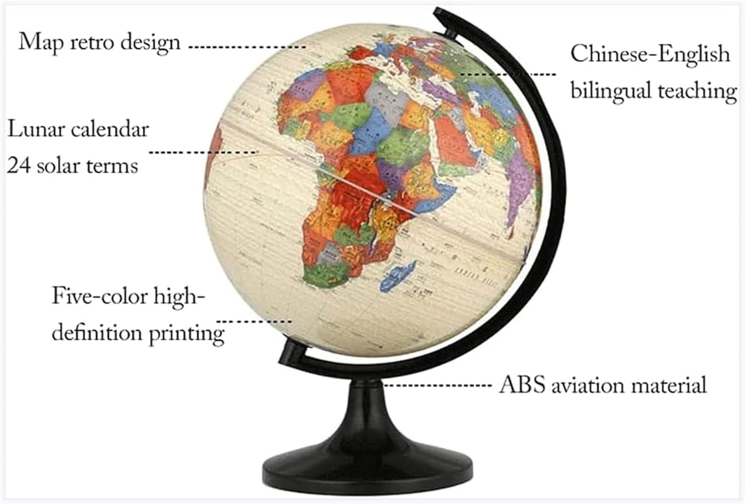 I globi sono eccellenti strumenti educativi e il modo perfetto per ispirare l'apprendimento e l'esplorazione della geografia mondiale. I globi forniscono un modo divertente per introdurre la geografia. Costituiscono ottimi strumenti di riferimento in classe. Aggiunte le caratteristiche delle usanze popolari dei ventiquattro termini solari del calendario lunare. La superficie della sfera adotta la tecnologia di stampa ad alta definizione, la tecnologia di stampaggio e stampaggio una tantum e gli emisferi settentrionale e meridionale sono armoniosi e unificati. La sfera è realizzata in materiale aeronautico ABS e la staffa in plastica nera è sicura e innocua, rendendola più sicura da usare for i bambini. Esecuzione squisita, immagini e testi squisiti, stampa a cinque colori for ogni versione, uno strato di vernice può essere utilizzato nel gruppo del quinto colore for aumentare la lucentezza della superficie, ricca di strati ed effetti realistici. Questo mappamondo geografico di ispirazione antica è il regalo perfetto for il viaggiatore entusiasta ed è il fulcro 'arredamento della tua casa o dello strumento scolastico.