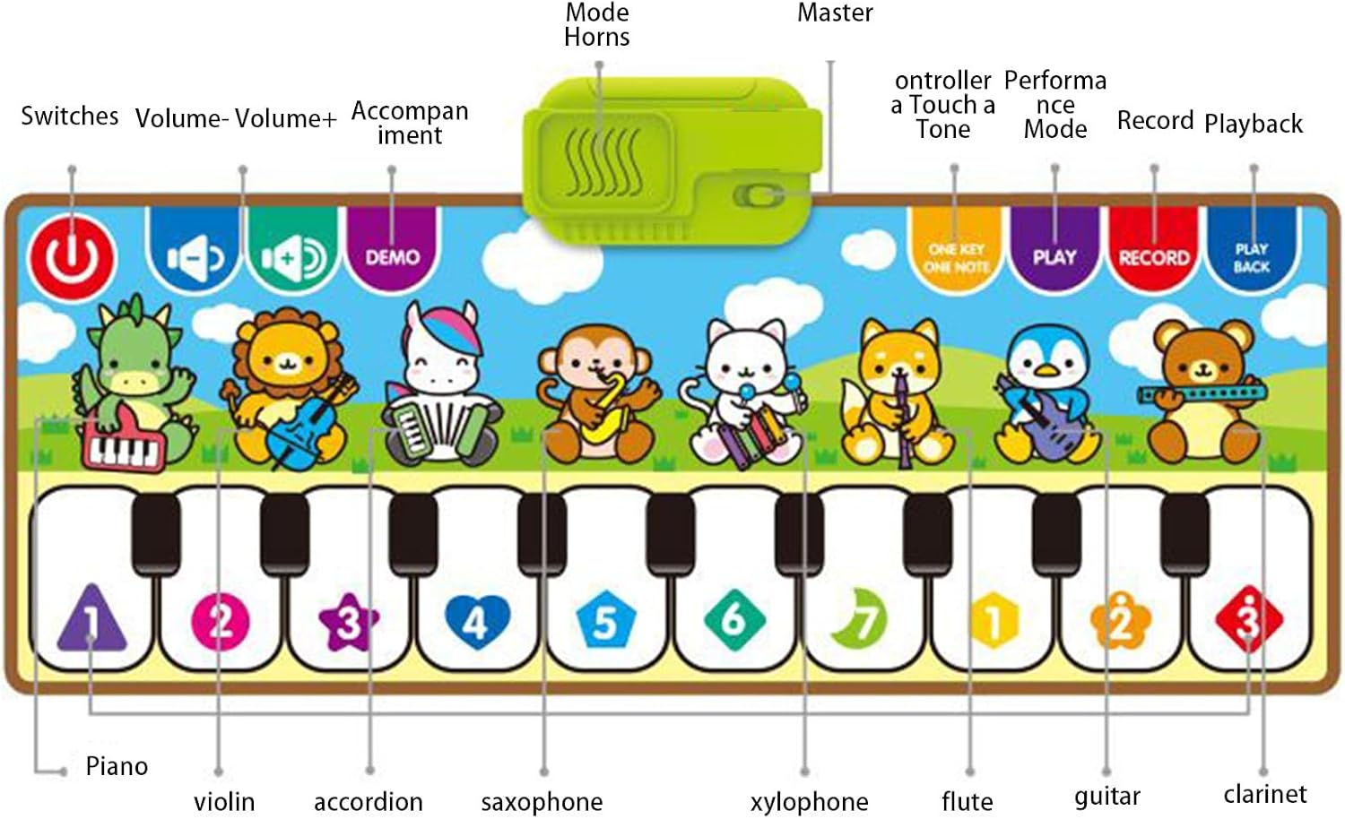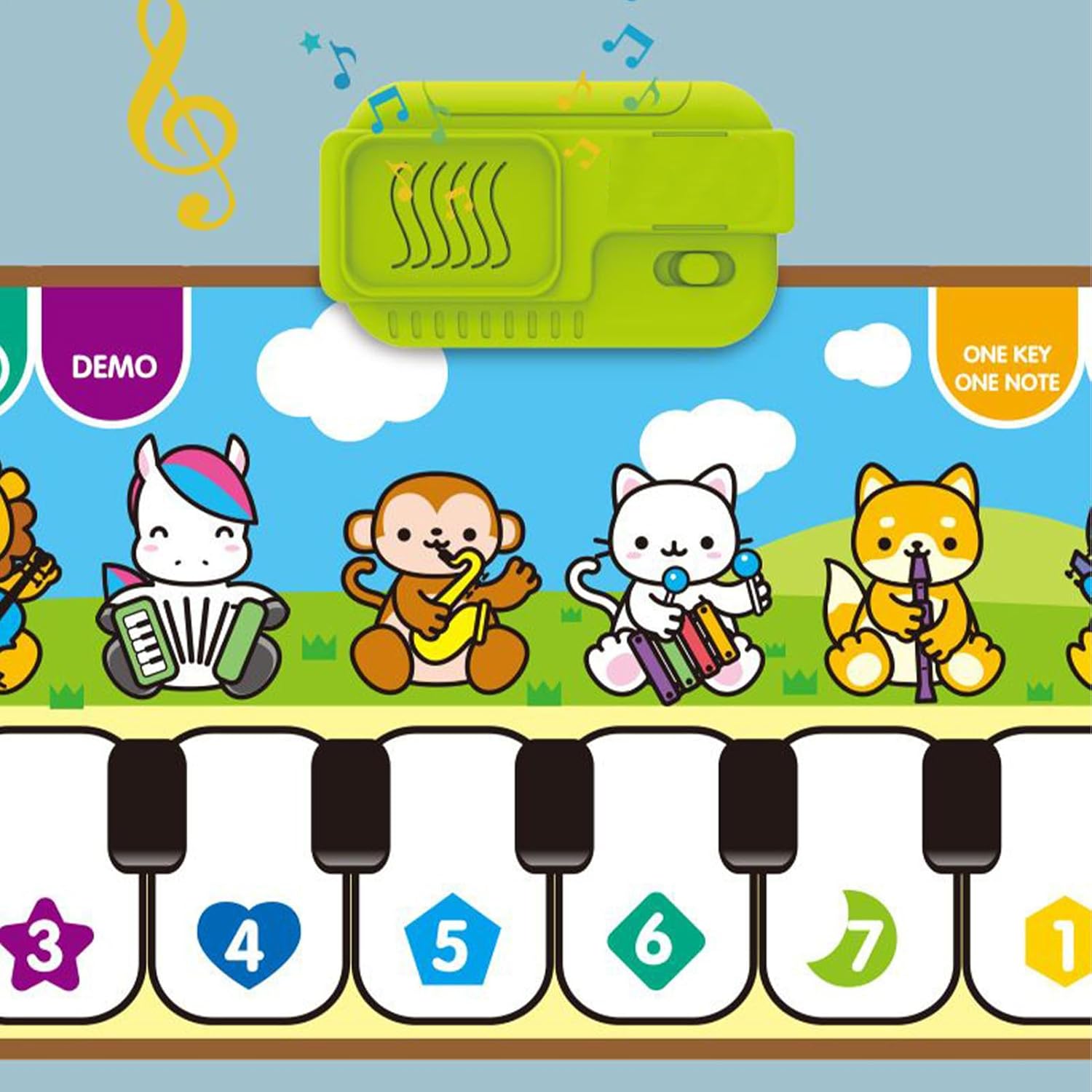 Costruzione di competenze basate sul suono: scintilla lo sviluppo intellettuale attraverso l'eccitazione uditiva e le attività basate sul ritmo. Il mat di piano coltiva l'ascolto concentrato, migliora le capacità di comprensione Arricchimento artistico: i colori ad alta saturazione sul tappetino per pianoforte affina le capacità di riconoscimento del colore e migliora l'estetica visiva. Progettato per coltivare l'apprezzamento artistico, promuove lo sviluppo cognitivo visivo Strumento di apprendimento multisensoriale: questo mat di pianoforte per bambini coinvolge i bambini nelle attività di associazione logica del suono, emozionante sviluppo di intelligenza poliedrica attraverso il gioco musicale Coordinamento del piede manuale: il tappetino per pianoforte allena il coordinamento degli occhi tramite chiavi reattive che attivano suoni con mani o piedi. Il feedback uditivo motiva i bambini a esplorare il ritmo attraverso i movimenti del corpo Parco giochi musicale interattivo: il tappetino per piano