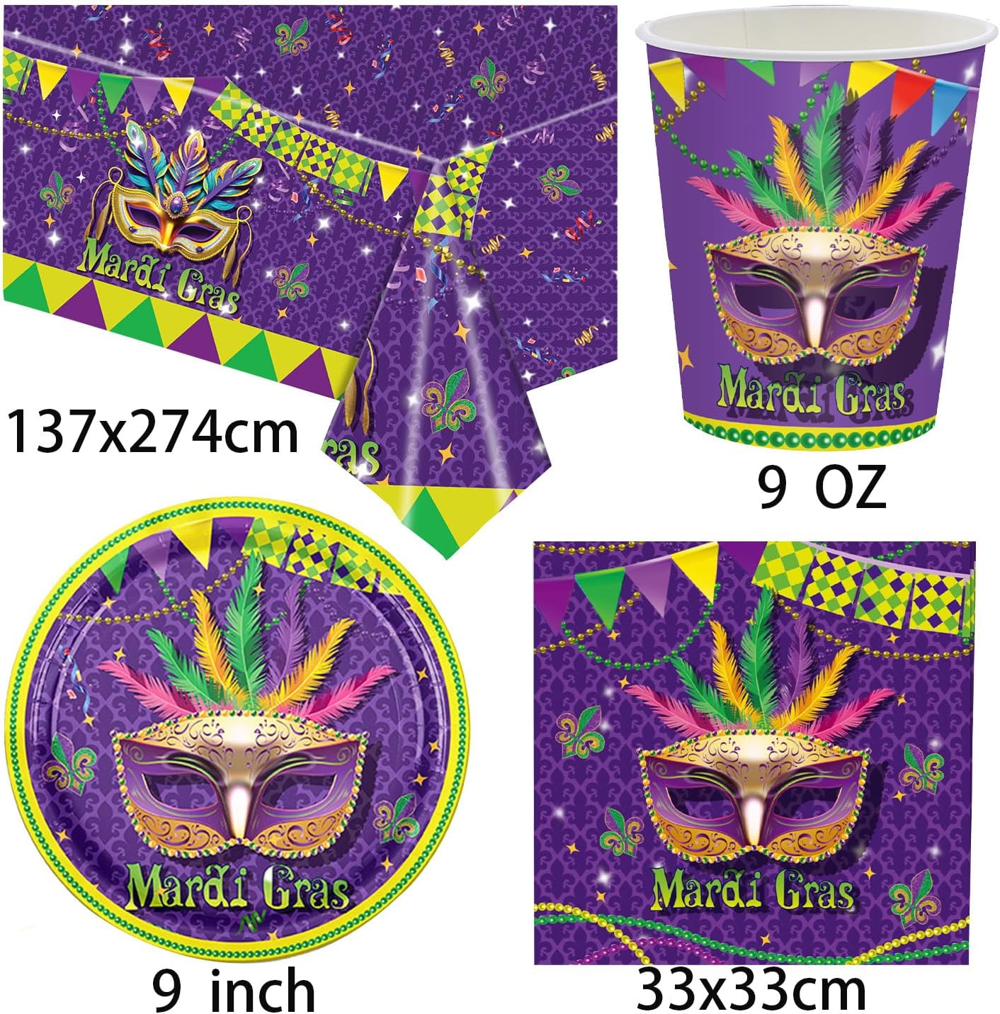 ✨TAVOLINI DA PARTY CARNEVALE: Riceverete 20 tovaglioli da 33 x 33 cm, 20 piatti grandi da 9 pollici, 20 bicchieri da 9 once, tovaglia da 137 x 274 cm, è l'accento perfetto per una festa di Martedì Grasso. 🎉 MATERIALE DI QUALITÀ: Le stoviglie per la festa della maschera di Mardi Gras sono realizzate in materiale cartaceo di alta qualità, durevole e pratico, la loro resistenza garantisce che possano sopportare cibi deliziosi senza piegarsi o perdere. ✨CARATTERISTICHE DEL DISEGNO: Emozionante festa di carnevale. Abbiamo utilizzato i classici colori viola, giallo, rosso e verde in una varietà di motivi Mardi Gras e abbiamo stampato la parola “Mardi Gras” per creare un design unico e accattivante. 🌿 RISPARMIO DI TEMPO: questo partyware con maschera del Mardi Gras è stato progettato pensando alla praticità e alla tutela dell'ambiente. È facile da pulire e può essere smaltita dopo la festa, facendovi risparmiare tempo e rispettando l'ambiente. ✨APPLICAZIONE: Adatto per carnevale, festa in maschera, festa di compleanno, riunione di famiglia, vacanza e così via. Sarà il miglior accessorio per feste e vi regalerà ricordi indimenticabili.