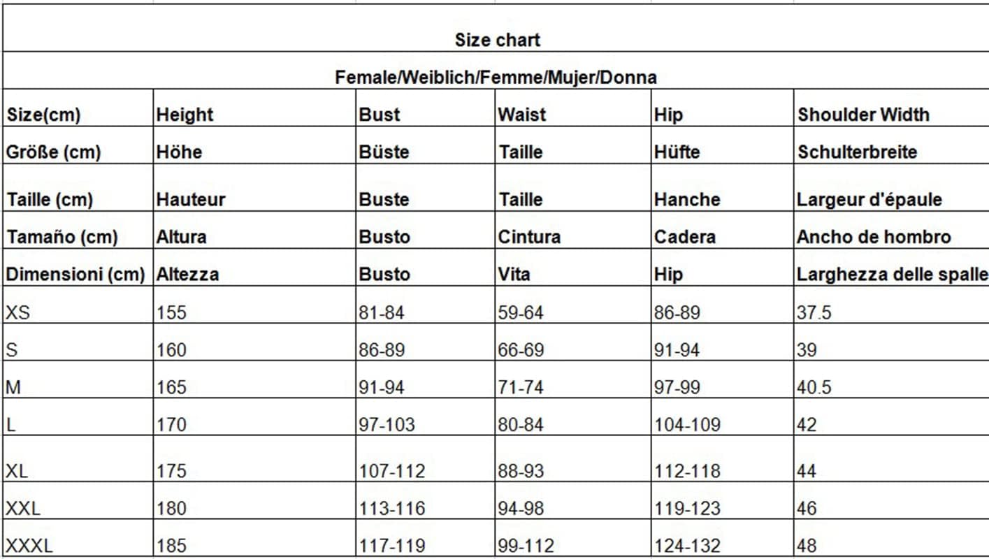 Tabella taglie: circonferenza torace 91-94 cm, circonferenza vita 71-74 cm, fianchi 97-99 cm, larghezza spalle 40,5 cm Taglia L: altezza 170 cm, circonferenza torace 97-103 cm, circonferenza vita 80-84 cm, fianchi 104-109 cm, larghezza spalle 42 cm Taglia XL: altezza 175 cm, circonferenza torace 107-112 cm, circonferenza vita 88-93 cm, fianchi 112-118 cm, larghezza spalle 44 cm 124-132 cm, larghezza spalle 48 cm Il colore dell'articolo può variare leggermente dalla foto a seconda dello schermo del computer e delle impostazioni di luminosità. Si prega di fare riferimento al progetto reale per la precisione.