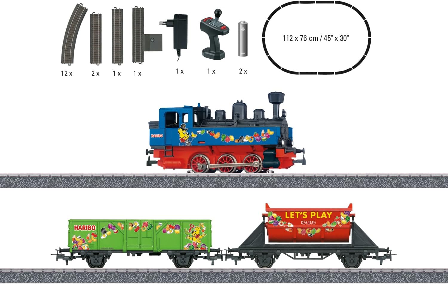 Allenati nell'attraente e colorato design HARIBO: ideale per bambini dai 6 anni in su. Kit tutto in uno: nello starter kit è tutto incluso per poter costruire e giocare subito: locomotiva, carrozza, binario, telecomando con 2 batterie AAA, spina di alimentazione e istruzioni di montaggio. Sistema di binari a C facile da montare: facile da montare e smontare rapidamente. Libertà di movimento nell'installazione grazie al controller wireless a infrarossi “Power Control Stick”. Puoi controllare fino a 4 locomotive contemporaneamente ed effetti sonori e luminosi. 2 batterie AAA incluse.