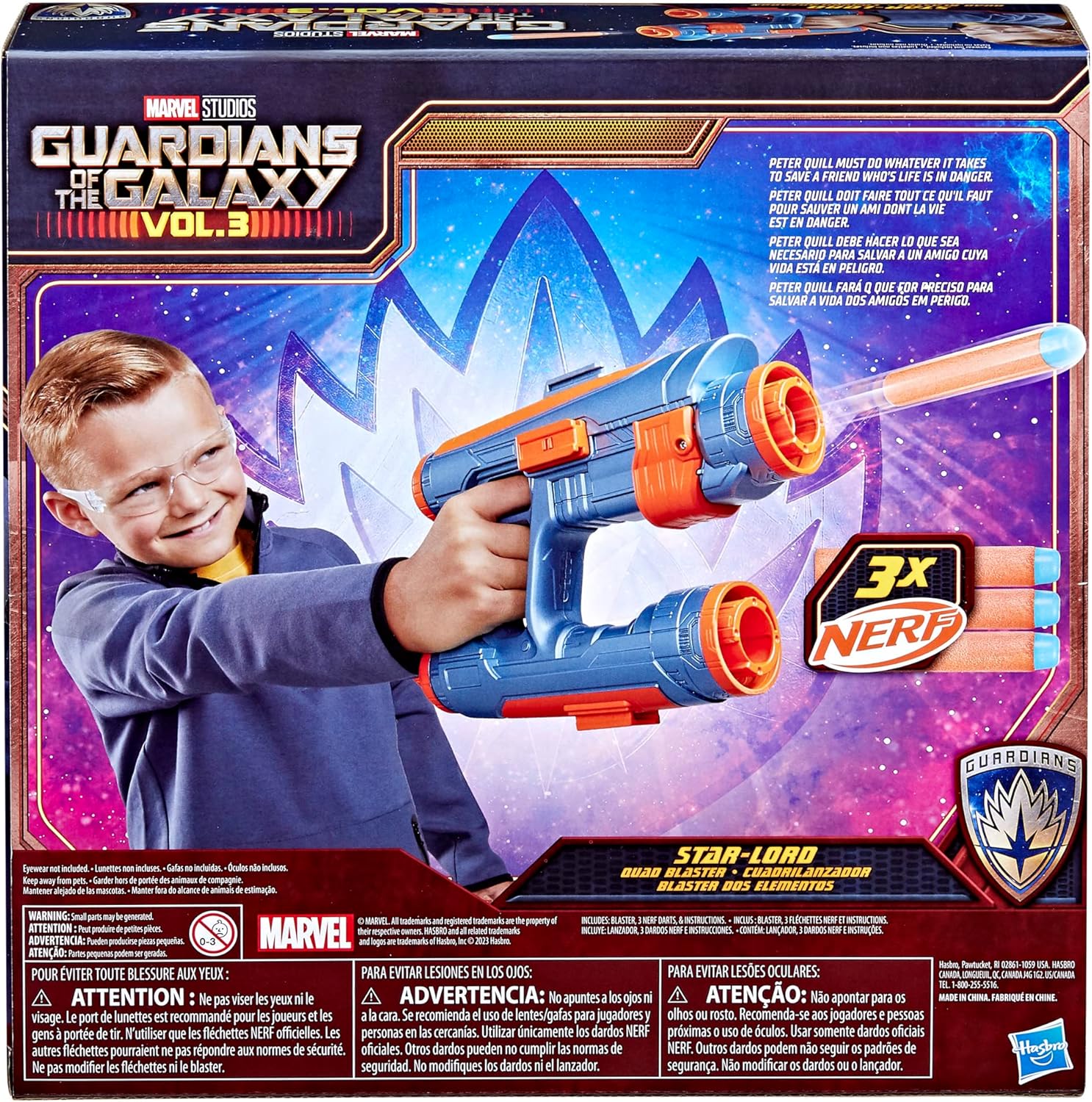 GIOCA COME STAR-LORD: In Marvel Studios' Guardiani della Galassia Vol. 3, il nostro eroe deve fare tutto il necessario per salvare un amico la cui vita è in pericolo SALVA LA GIORNATA CON NERF: questo gioco di ruolo Marvel giocattolo è alimentato da Nerf e include 3 freccette in modo che i bambini possano immaginare le proprie avventure piene di azione CARICA E BLAST: I bambini dai 5 anni in su possono prepararsi per fingere battaglie galattiche! Carica il blaster Star-Lord con un dardo, tira indietro per accendere, e premi il grilletto per esplodere! Design ispirato all'intrattenimento: NERF incontra l'iconico blaster di Star-Lord con un design ispirato ai Guardiani della Galassia Vol di Marvel Studios. 3 Cerca altri giocattoli Marvel: i bambini possono aggiungere alla loro collezione di giocattoli supereroi con altri giocattoli Guardiani della Galassia, action figure o giocattoli di ruolo che possono essere utilizzati sia per il tempo di gioco che per vestirsi (ciascuno venduto separatamente. Soggetto a disponibilità.)