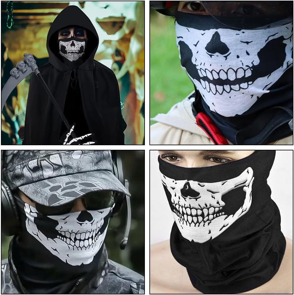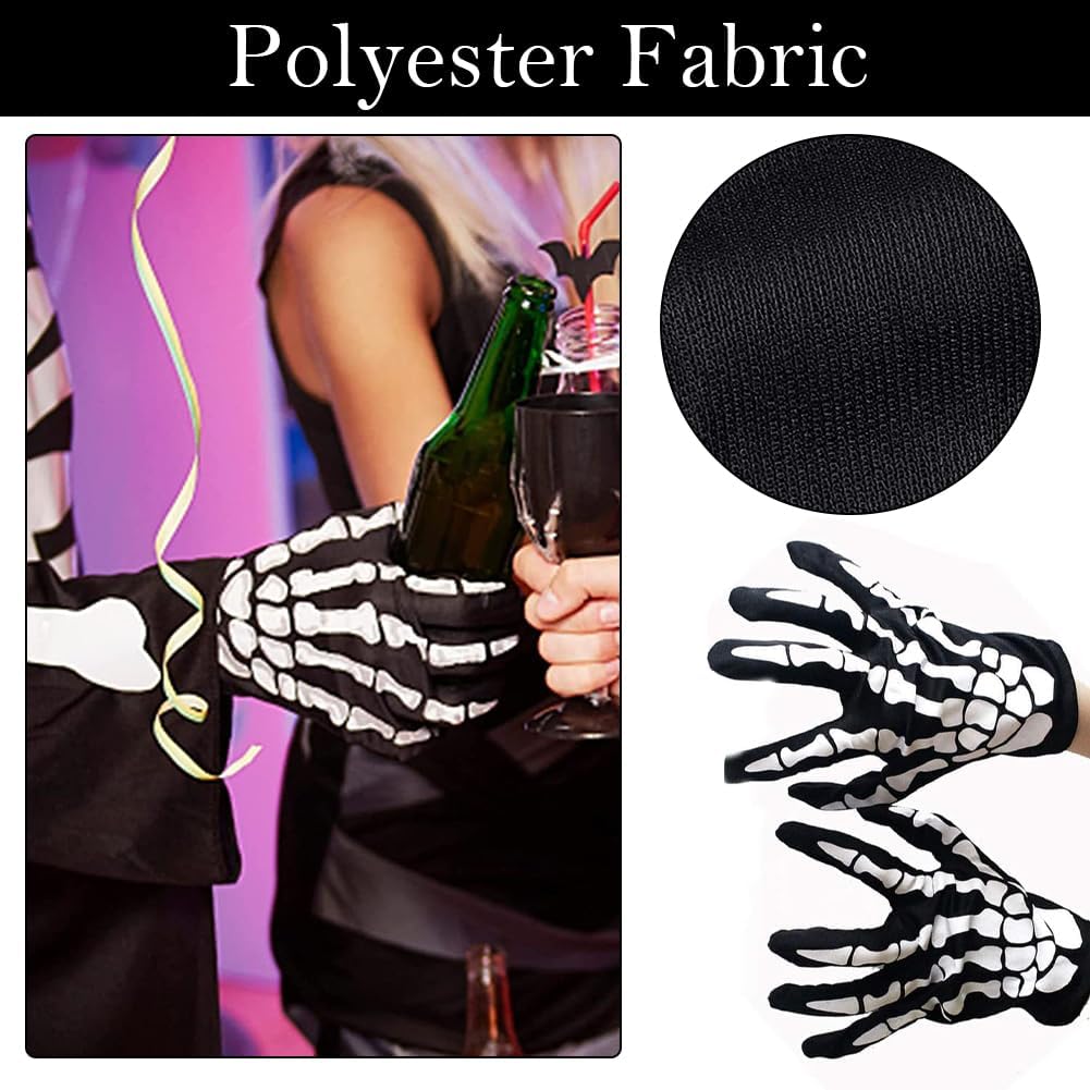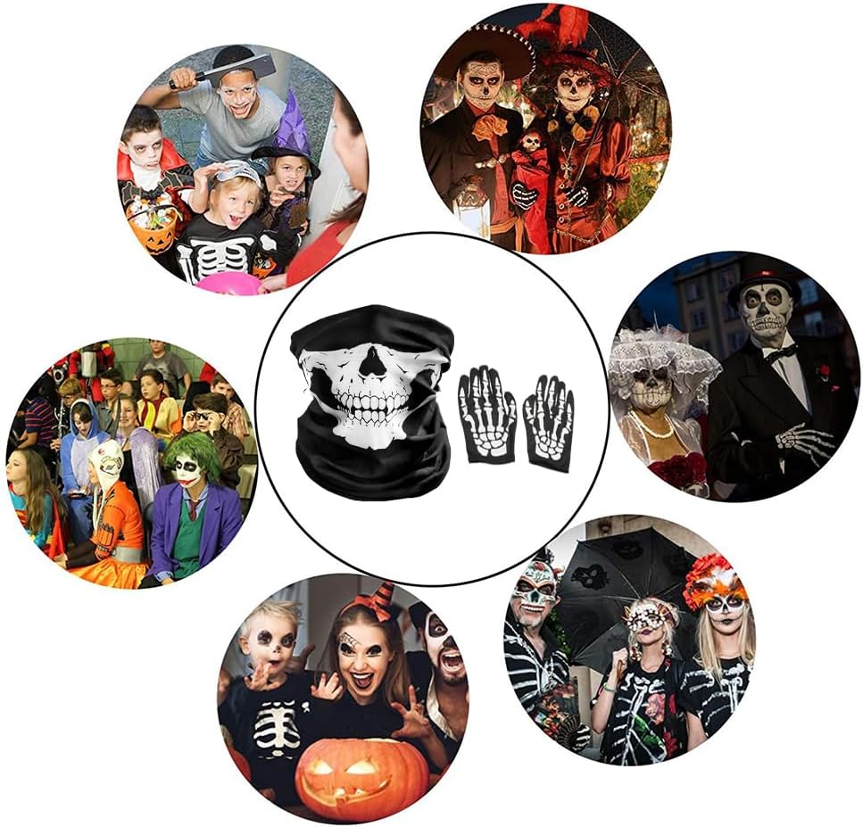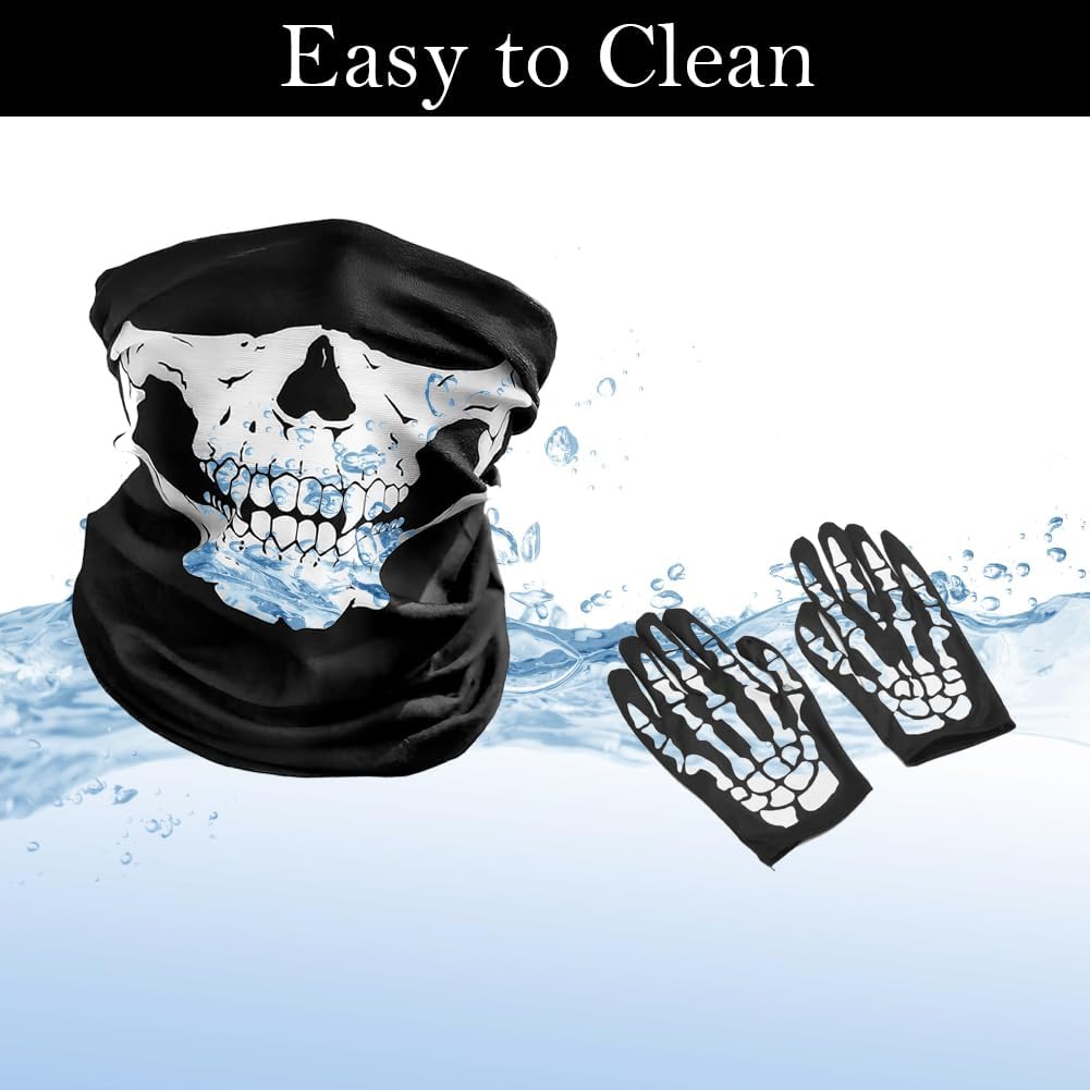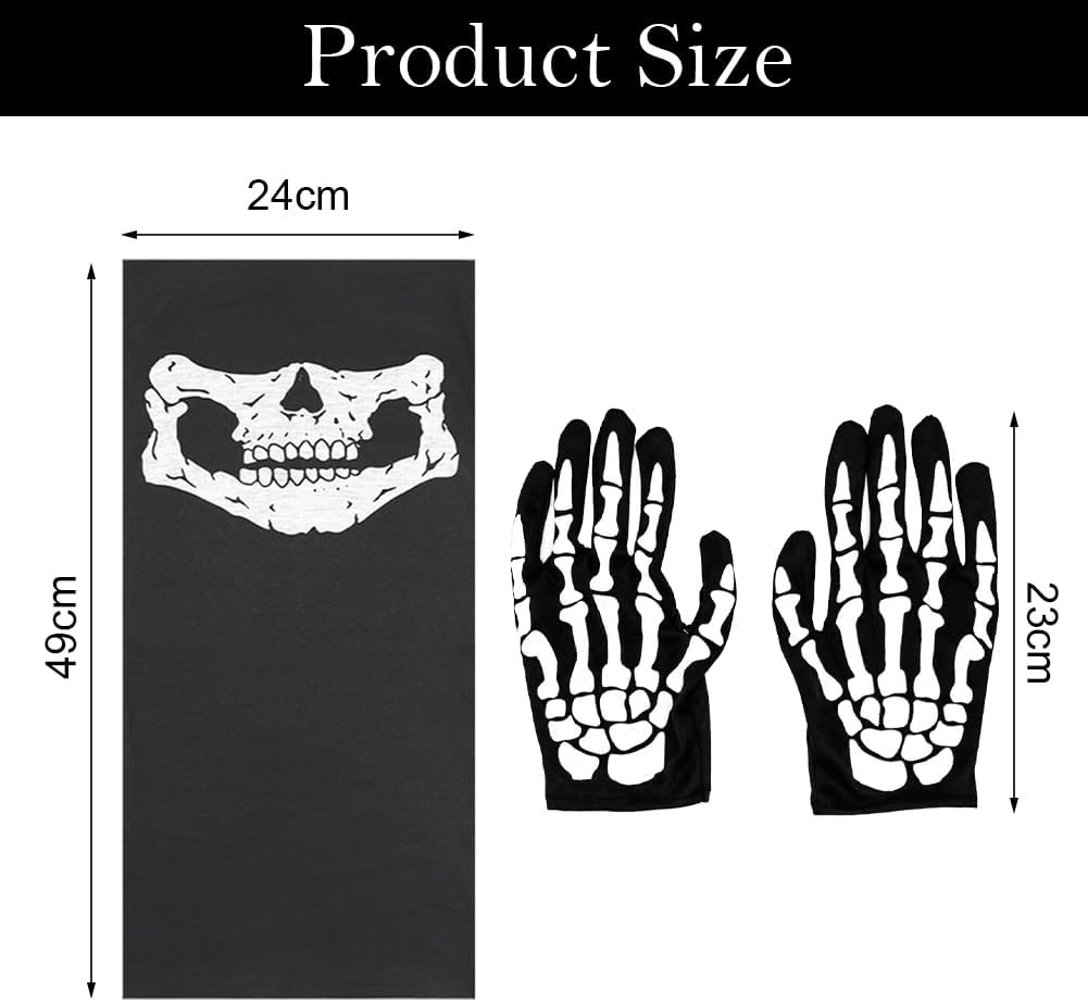 Questa maschera a forma di teschio è realizzata in microfibra di poliestere e presenta una stampa a teschio per un comfort leggero. Questa maschera elastica a forma di teschio presenta un design senza cuciture per evitare cedimenti. È perfetta per tenere al caldo viso, orecchie e collo. È facile da lavare e asciugare, mantiene il colore anche dopo il lavaggio ed è riutilizzabile. Può essere utilizzata come bandana, polsiera, fascia per capelli, mascherina, berretto, fascia per capelli, elastico per capelli o persino come asciugamano. I guanti a forma di teschio sono l'accessorio perfetto per completare il tuo look spettrale. Questi eleganti guanti neri, impreziositi da una stampa a teschio realistica, attireranno sicuramente l'attenzione a qualsiasi festa di Halloween. Sono adatti per attività all'aperto come motociclismo, ciclismo, escursionismo, campeggio, sci, alpinismo, caccia e sono perfetti anche per lo snowboard durante il periodo natalizio. Specifiche: Materiale: Poliestere di alta qualità Taglia: Taglia unica: Maschera a forma di teschio di Halloween 25 x 50 cm; Guanti da teschio di Halloween 23 cm Colore: Nero La confezione include: 1 maschera da teschio; 1 paio di guanti da teschio di Halloween
