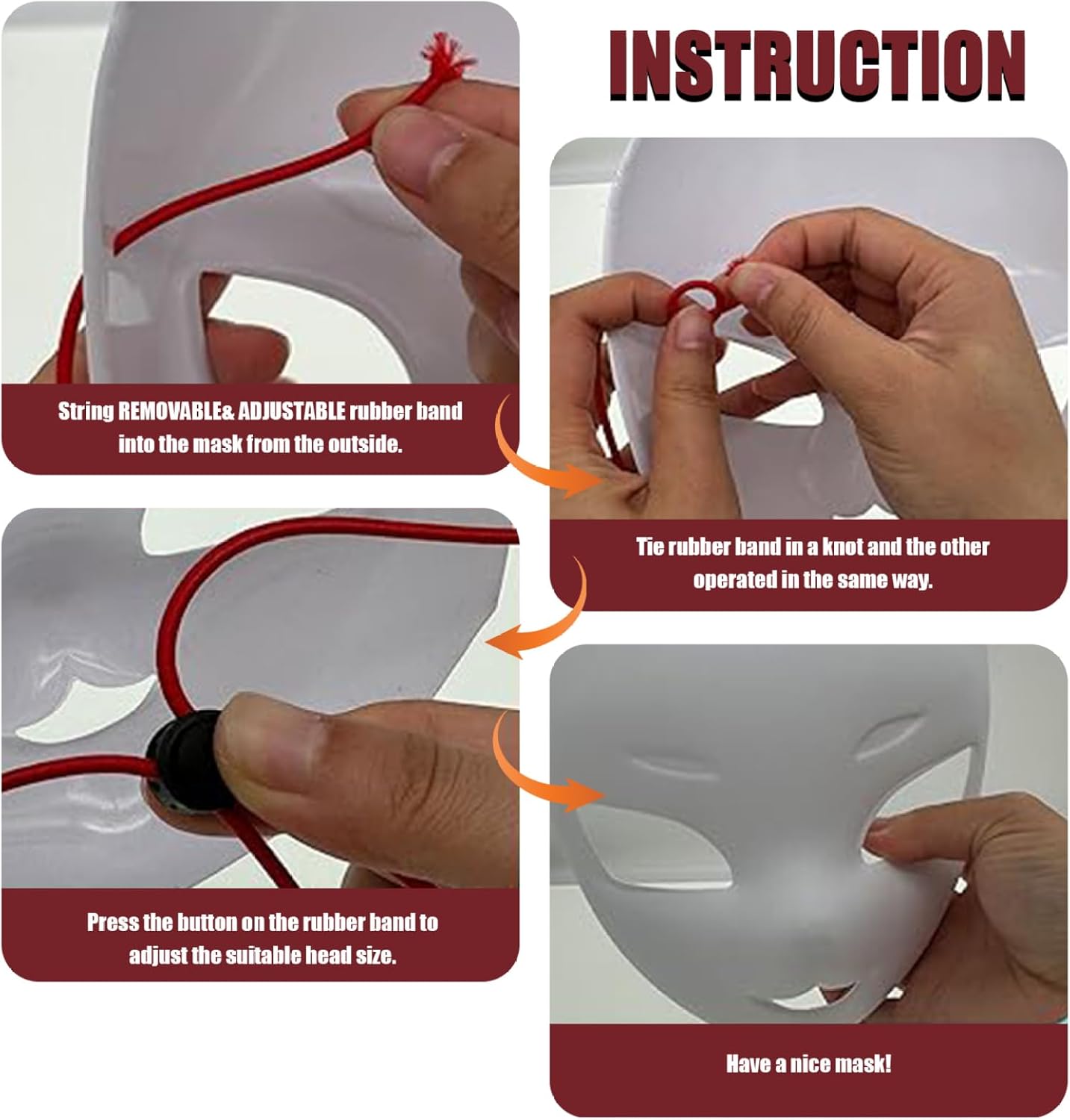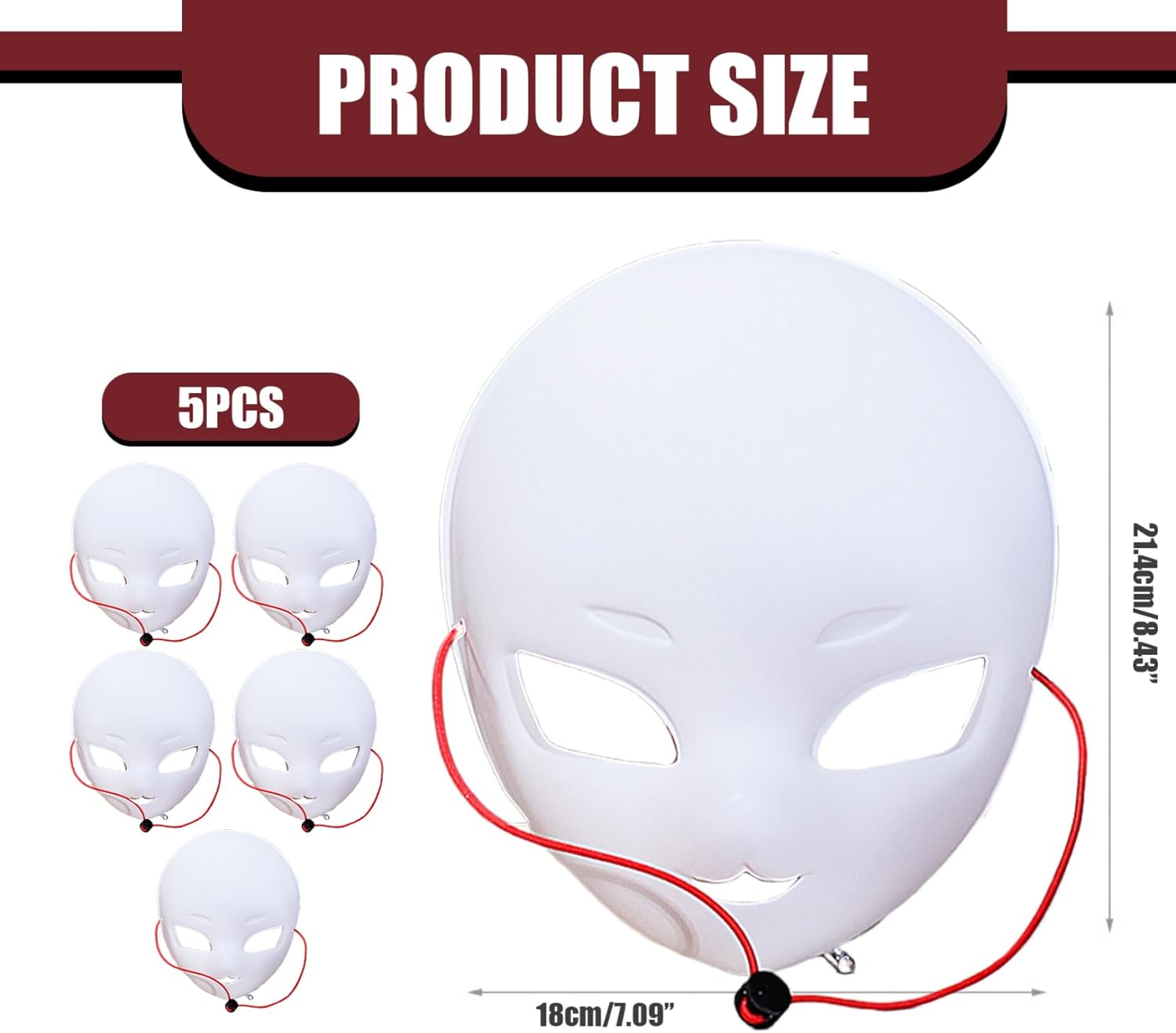 Descrizione prodotto Descrizione: Questo set di 5 maschere bianche è progettato per la pittura fai-da-te, permettendoti di personalizzare e creare un design unico per ogni occasione..Gli occhi sovradimensionati rendono le maschere espressive e giocose, aggiungendo un tocco di fascino carino, rendendole ideali per tutto, da Halloween alle feste in maschera e cosplay..Ogni maschera è dotata di una cinghia regolabile per una vestibilità sicura e confortevole.. Caratteristiche:.. Maschera per la testa con tuta in pelliccia.. -Colore: bianco.. -Materiale: PVC.. -Dimensioni: 18x21,4x7,5 cm/7,09x8,43x2,95 pollici.. Nota: Misurazione manuale, prega di consentire lievi errori sulla dimensione.. I colori potrebbero presentare una leggera differenza a causa dei diversi schermi.. Pacchetto compreso 5 pezzi * maschera cosplay Avviso di sicurezza Avvertenza: questo prodotto è un prodotto in legno, conservarlo lontano da fonti di fuoco.