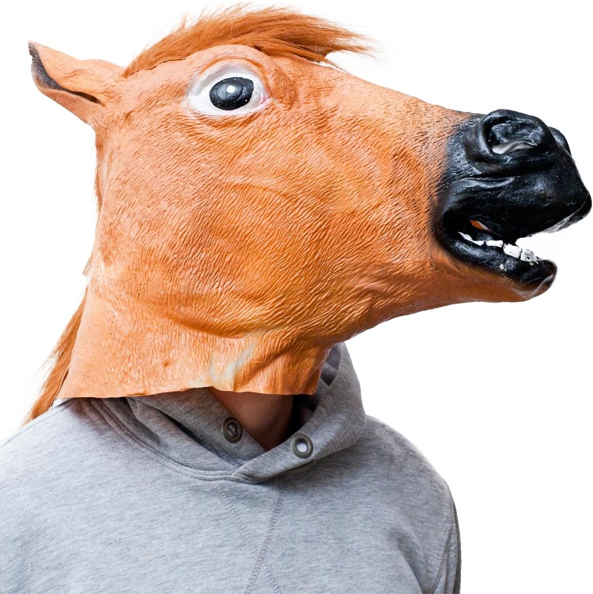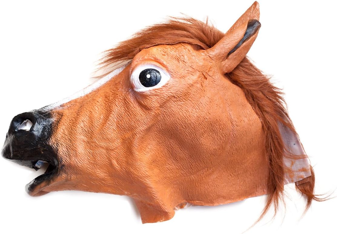 Maschera testa di cavallo interamente in lattice per un look ancora più fantasioso. Con questa maschera da cavallo avrete un aspetto spaventoso e inquietante ad Halloween (ad esempio basato su un film sulla mafia, o per intenditori e amici dell'horror), così come a carnevale o ad una festa in costume come maschera in lattice con testa di animale per un costume da cavallo. Qualità esclusivamente atossica, conforme alla norma europea EN71. IMPORTANTE: se possibile, arieggiare per alcuni giorni, poiché le maschere in lattice a volte possono avere inizialmente un forte odore di lattice. Sfortunatamente, a causa del processo di produzione, non è possibile evitarlo completamente.