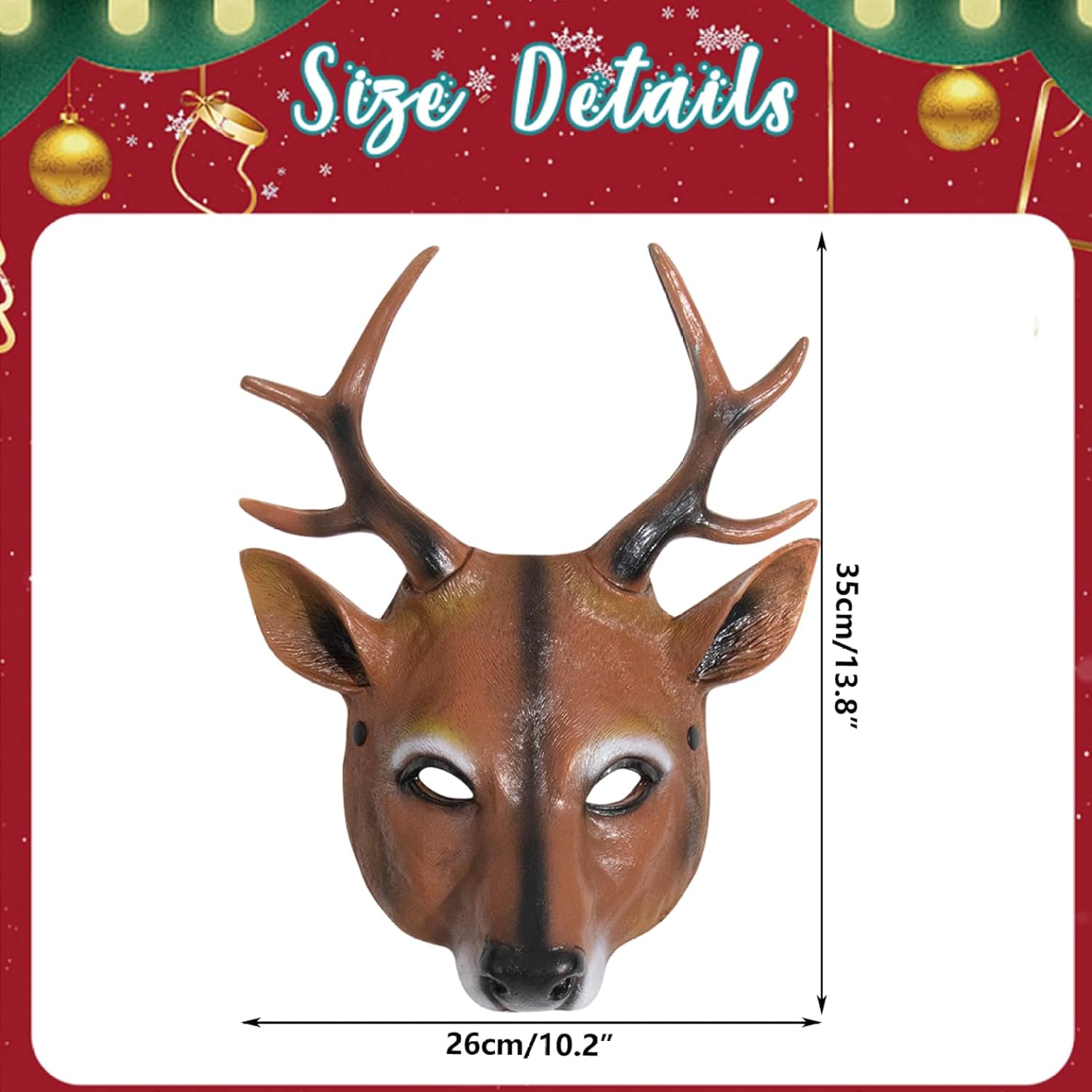 Descrizione prodotto Descrizione: Questa maschera da cervo a pieno facciale offre un realismo eccezionale con dettagli di teschi di cervo realizzati in modo intricato e un aspetto naturale di maschera di animale che completa perfettamente il tuo costume da cervo per feste in maschera, feste e festival natalizi..Progettata pensando al comfort dell'utente, la fascia elastica offre una vestibilità sicura e regolabile per diverse dimensioni della testa, consentendo ore di utilizzo confortevole..Realizzato con materiali leggeri ma allo stesso tempo leggeri, consente la libera circolazione senza sacrificare la longevità o la qualità..Ideale per balli in maschera ed eventi a tema, questa maschera versatile esalta il tuo outfit festivo con un'atmosfera misteriosa e accattivante..La sua struttura facile da indossare garantisce accensione e spegnimento senza problemi, mentre il design compatto semplifica la conservazione e la trasportabilità..Combinando un design autentico con un comfort funzionale, questa maschera da cervo è un accessorio indispensabile per elevare il tuo evento stagionale e in costume senza compromettere lo stile o la praticità.. Caratteristiche:.. -Colore: Marrone.. -Materiale: schiuma PU.. -Dimensioni: 26x35 cm/10,2x13,8 pollici.. Nota: Misurazione manuale, prega di consentire lievi errori sulla dimensione.. I colori potrebbero presentare una leggera differenza a causa dei diversi schermi.. Pacchetto compreso 1 * Maschera da cervo Avviso di sicurezza Avvertenza: Non adatto a bambini di età inferiore ai 3 anni; tenere lontano dal fuoco; non indossare durante la guida; togliere in caso di difficoltà respiratorie e usare sotto sorveglianza.