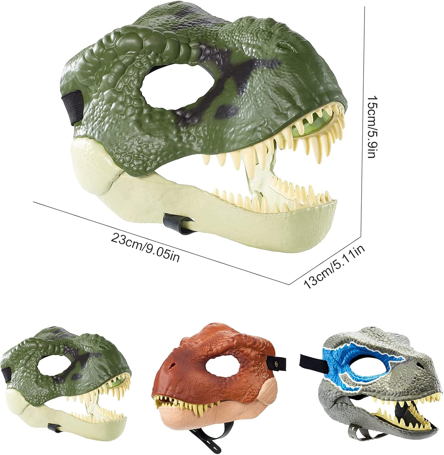 Caratteristiche: 1. Preparati per emozionanti azioni e avventure, le maschere sono ispirate all'iconico Tyrannosaurus Rex e Velociraptor del film e presentano dettagli realistici come la struttura della pelle, il colore e i denti. 2. La funzione di apertura della mascella consente di tagliare il movimento per un'azione ancora più realistica. 3. La nostra fascia per dinosauro è rinforzata con quattro strati di tessuto elastico nelle aree chiave della bocca, degli occhi, delle orecchie e del naso per garantire un'eccellente durata senza limitare i movimenti. Caratteristiche: Materiale: lattice Colori: verde, marrone, blu Dimensioni: 23 x 15 x 13 cm Peso: 250 g Contenuto: 1 maschera da dinosauro.