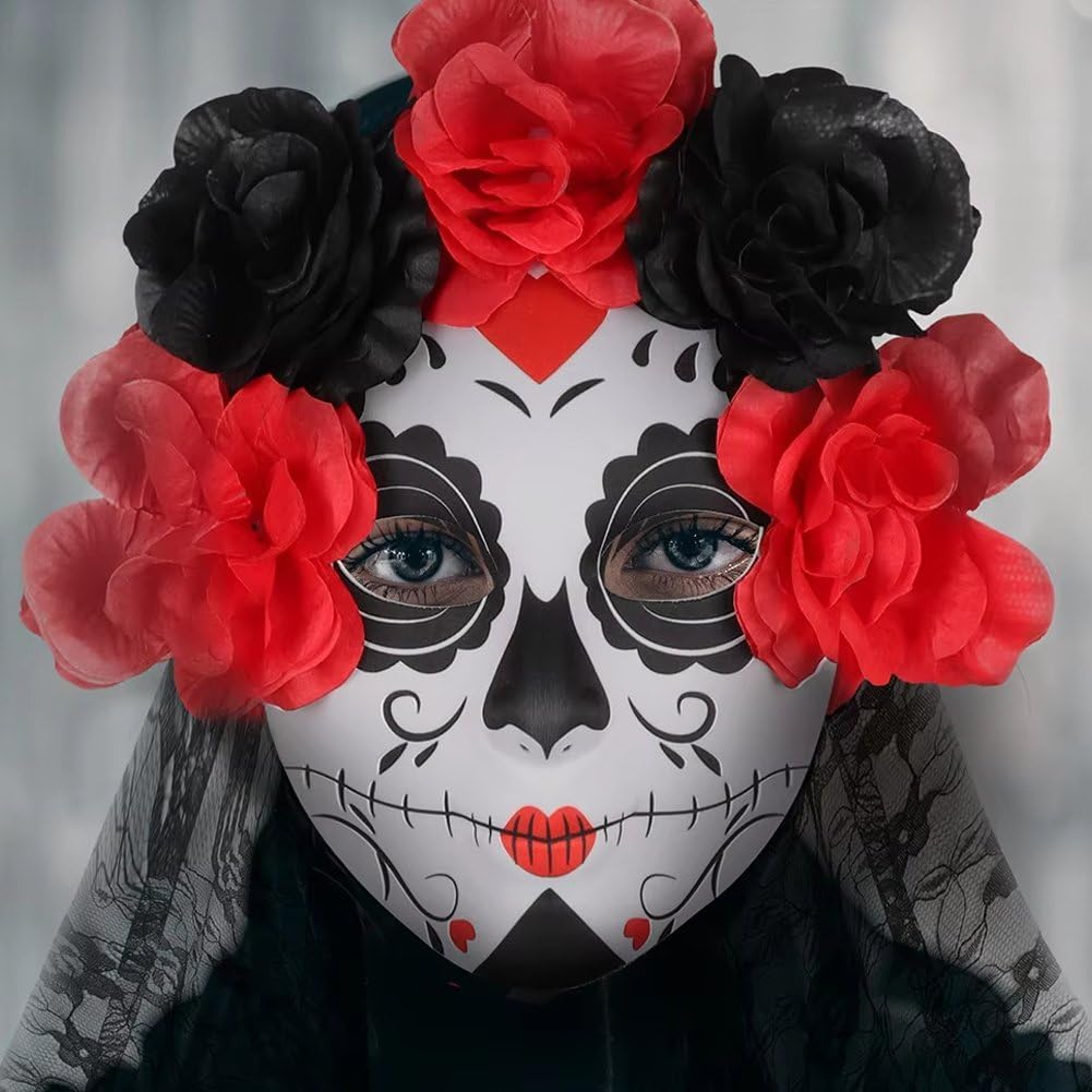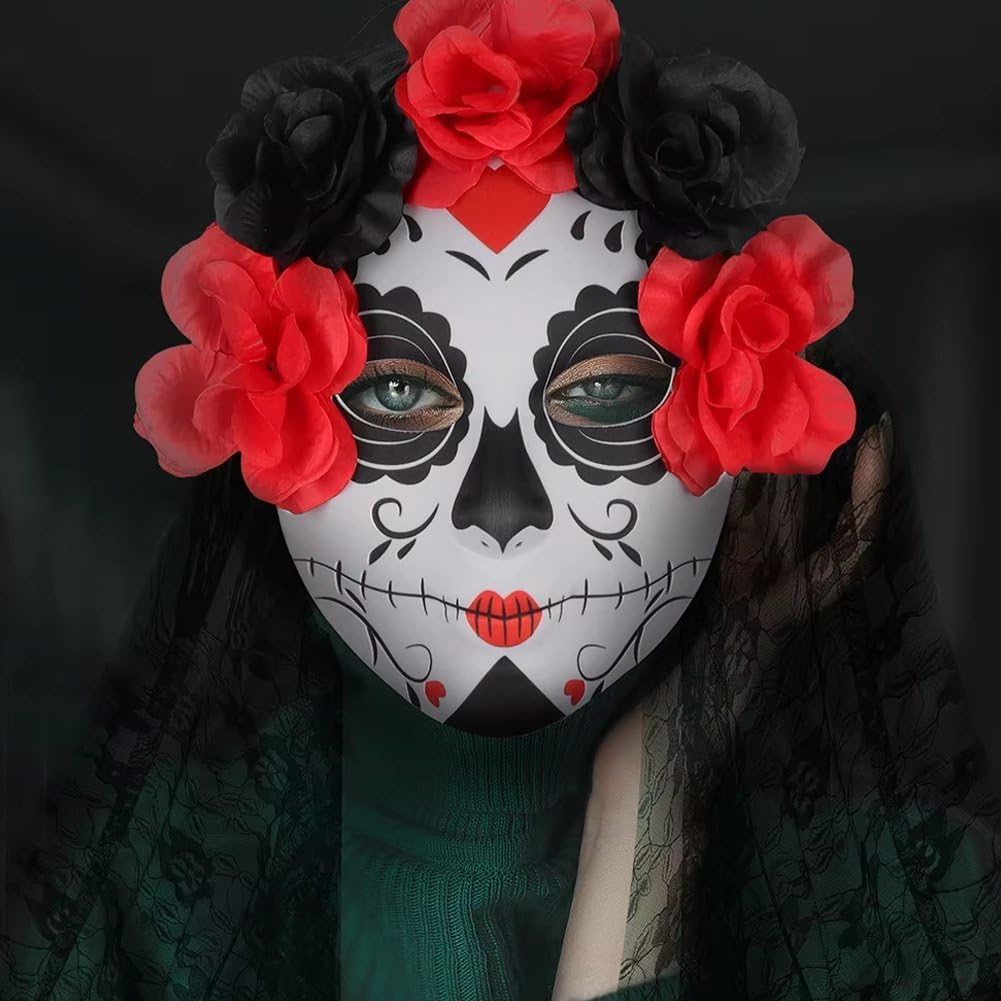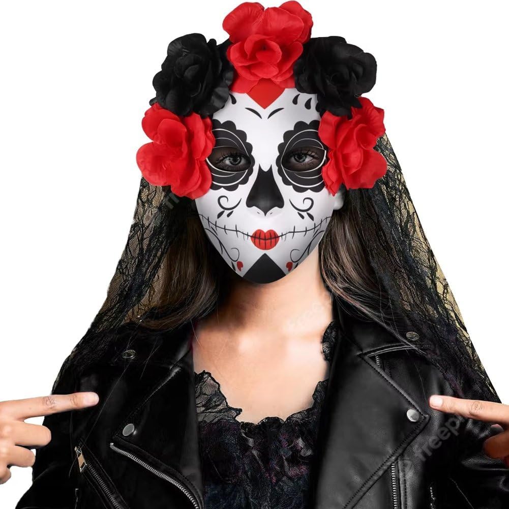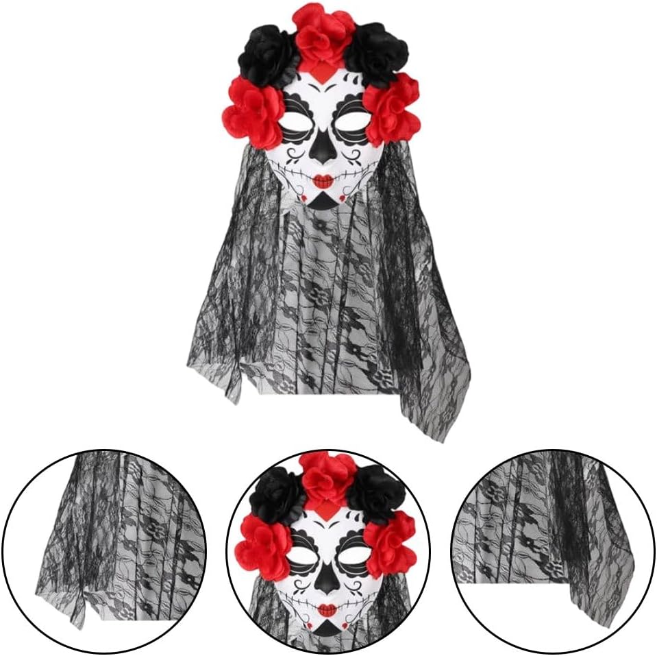 Accessorio per costumi versatile: ideale per Halloween, carnevale, martedì grasso, cosplay, spettacoli di danza, feste a tema o eventi in maschera. Design nuziale del giorno dei morti: miscela unica di spettrale ed elegante, ispirata alle immagini nuziali spettrali dei temi del Día de los Muertos (Giorno dei morti). ACCATTIVANTE UNICO: dettagli intricati e design audace rendono questa maschera un accessorio eccezionale per foto, spettacoli teatrali e apparizioni indimenticabili alle feste. Maschera per mascherata a pieno facciale: copre l'intero viso per un look misterioso e drammatico, perfetto per balli in maschera, feste di Halloween ed eventi cosplay. Materiale premium: realizzato con materiali leggeri e durevoli per un uso confortevole durante eventi lunghi e un facile trasporto.
