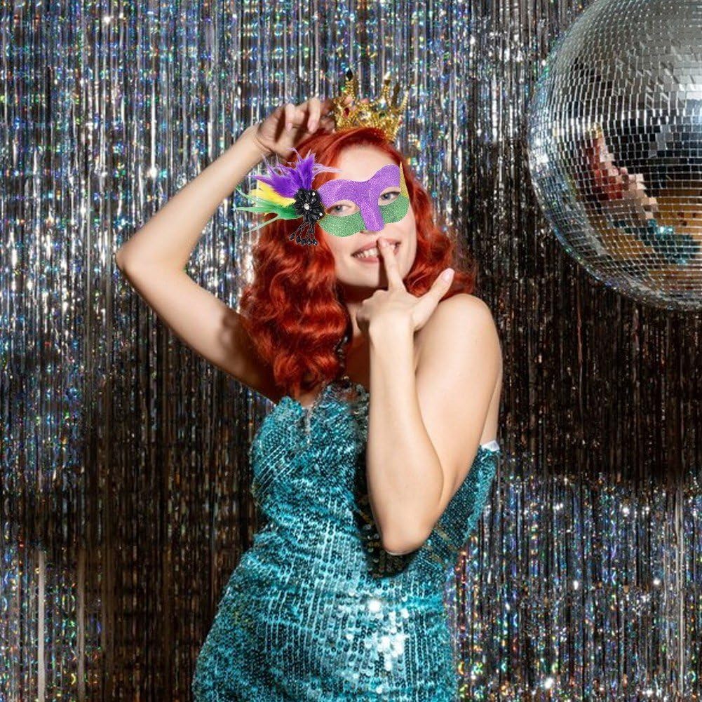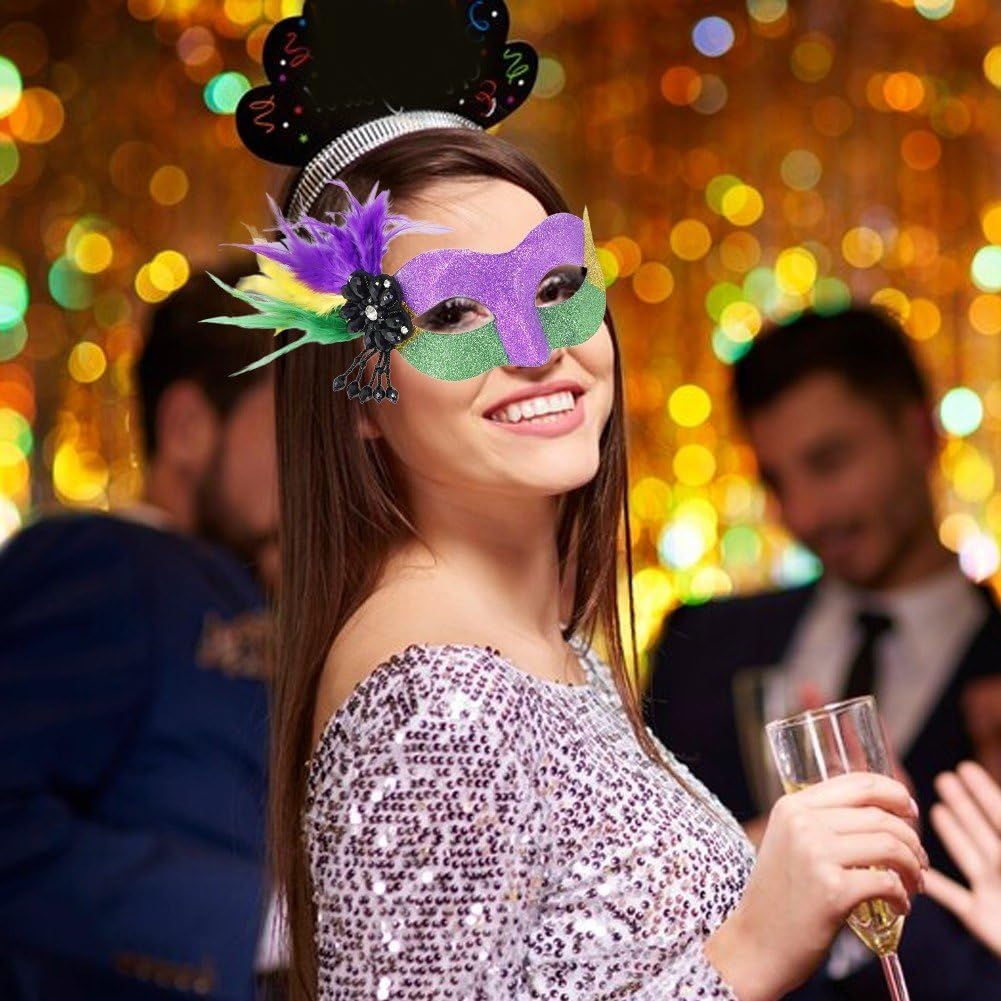 La maschera di carnevale con piume adotta i colori tradizionali del carnevale, oro, verde e viola rappresentano la fede, la giustizia. I colori vivaci rispondono al tema del carnevale e si abbinano all'atmosfera festosa. Il look alla moda e i colori vivaci rendono la maschera veneziana più attraente e accattivante alle feste. Il design della maschera veneziana del Mardi Gras è delicato ed elegante, adatto alla maggior parte delle persone. La maschera in maschera è adatta per feste in costume di Halloween Mardi Gras, sfilata di Mardi Gras, compleanno, ballo di fine anno, ballo di laurea, festa danzante, ballo veneziano, festa in maschera, puoi abbinarla a diversi stili di costumi. Sarai l'invidia di una festa quando le persone ti vedranno indossare la nostra delicata maschera veneziana luccicante. Distinguiti con i nostri splendidi colori attirerai sicuramente molta attenzione.