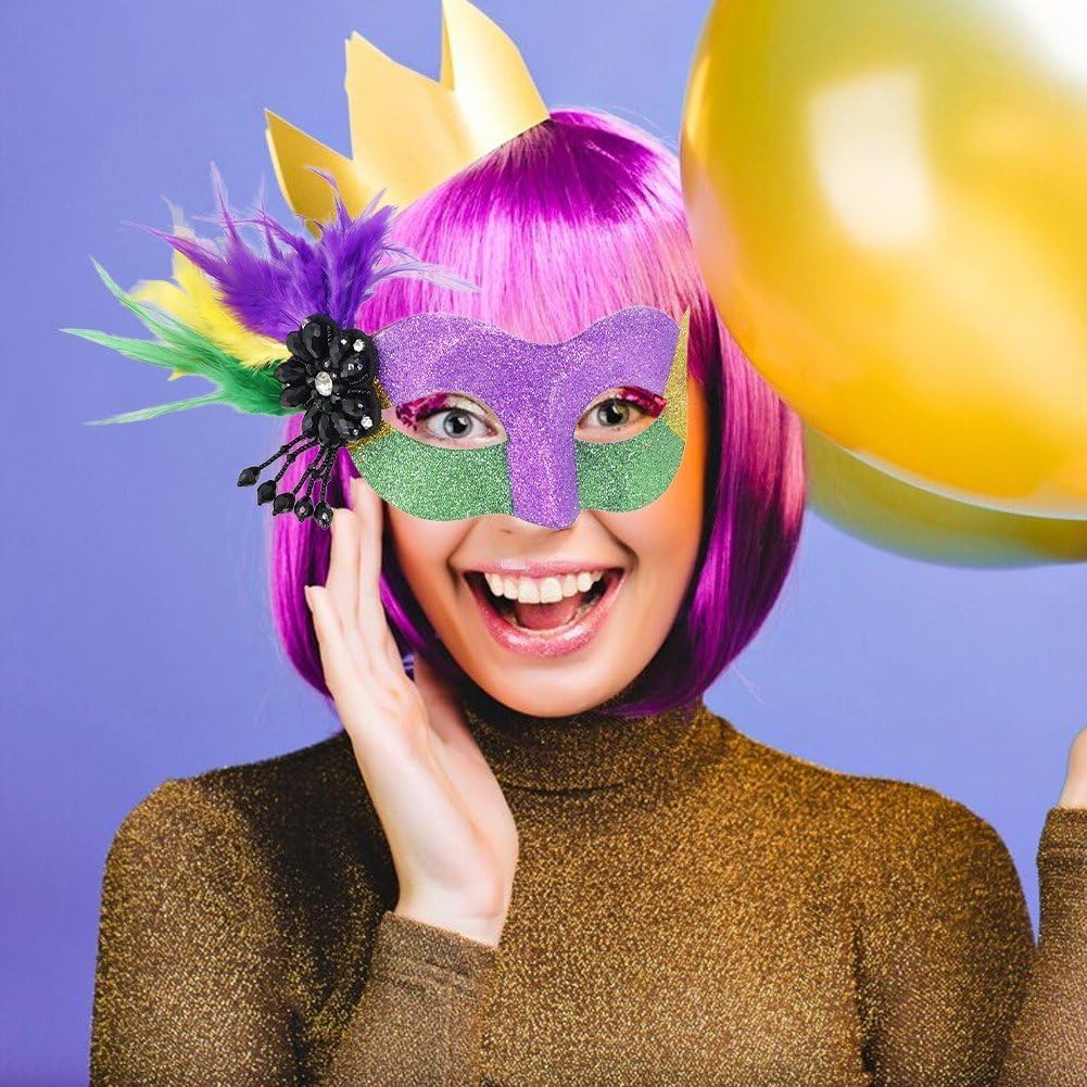 Sarai la star della festa quando le persone ti vedranno indossare la nostra delicata maschera veneziana luccicante. Distinguiti con i nostri splendidi colori attirerai sicuramente molta attenzione. Il design della maschera veneziana del Mardi Gras è delicato ed elegante, adatto alla maggior parte delle persone. La maschera di carnevale con piume adotta i colori tradizionali del carnevale, oro, verde e viola rappresentano la giustizia. I colori vivaci si abbinano al tema del carnevale e si abbinano al tema festivo. La maschera in maschera è adatta per la festa in costume di Halloween del Mardi Gras, Mardi Gras, compleanno, ballo di fine anno, ballo di laurea, festa da ballo, ballo veneziano, festa in maschera, puoi abbinarla a diversi stili di costumi. Il look alla moda e i colori vivaci rendono la maschera veneziana più attraente e attirano l'attenzione durante la festa.