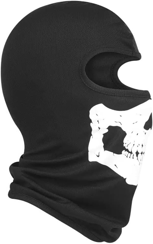 Passamontagna nero leggero teschio maschera integrale. Materiale: filo di tessuto. Senza cuciture o orli irritanti. Sia il maschio che la femmina possono indossarlo. Comodo da indossare e mantiene la testa calda. Taglia unica, adatta per ciclismo, escursionismo, campeggio, sci, arrampicata, pesca, caccia, jogging, motociclismo e così via. Collo più lungo e anteriore extra lungo per una migliore protezione, taglio migliorato e angolo di cucitura diverso per una migliore vestibilità sulla testa: questi piccoli dettagli fanno la differenza. Può essere indossato da solo o sotto qualsiasi tipo di casco. Il tessuto è ipoallergenico e non irritante per la pelle. Cuciture piatte. Lavabile in lavatrice. Asciugatura molto rapida.