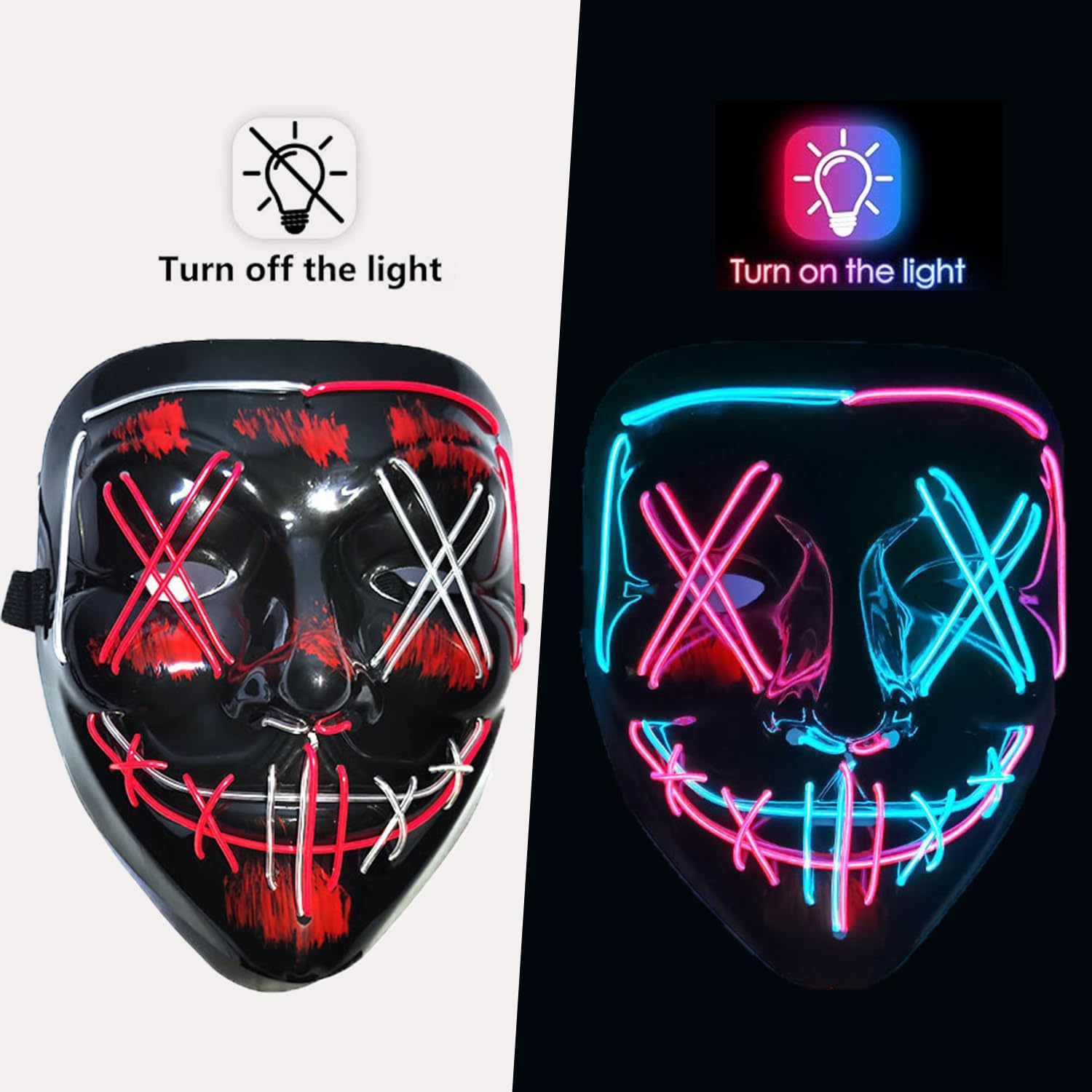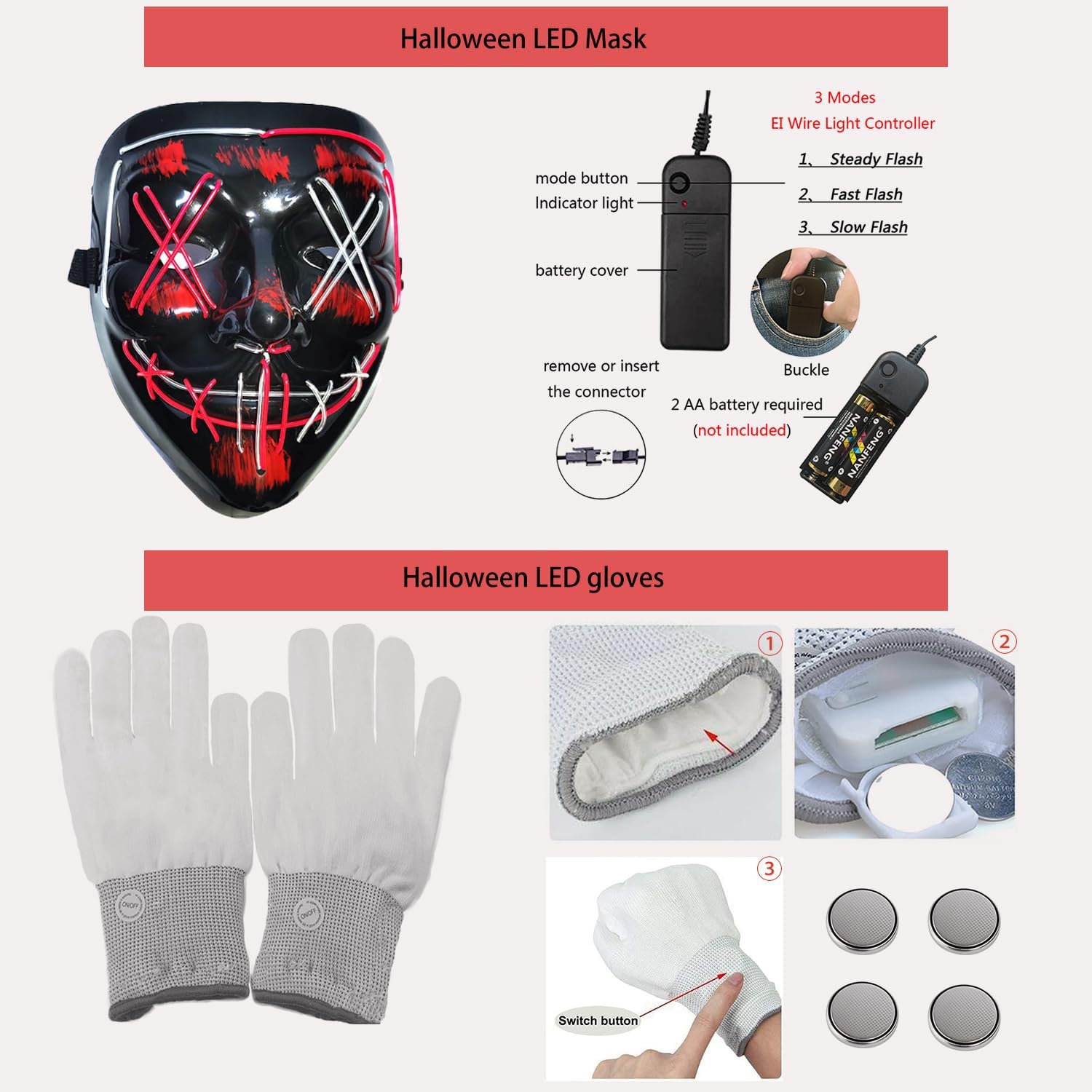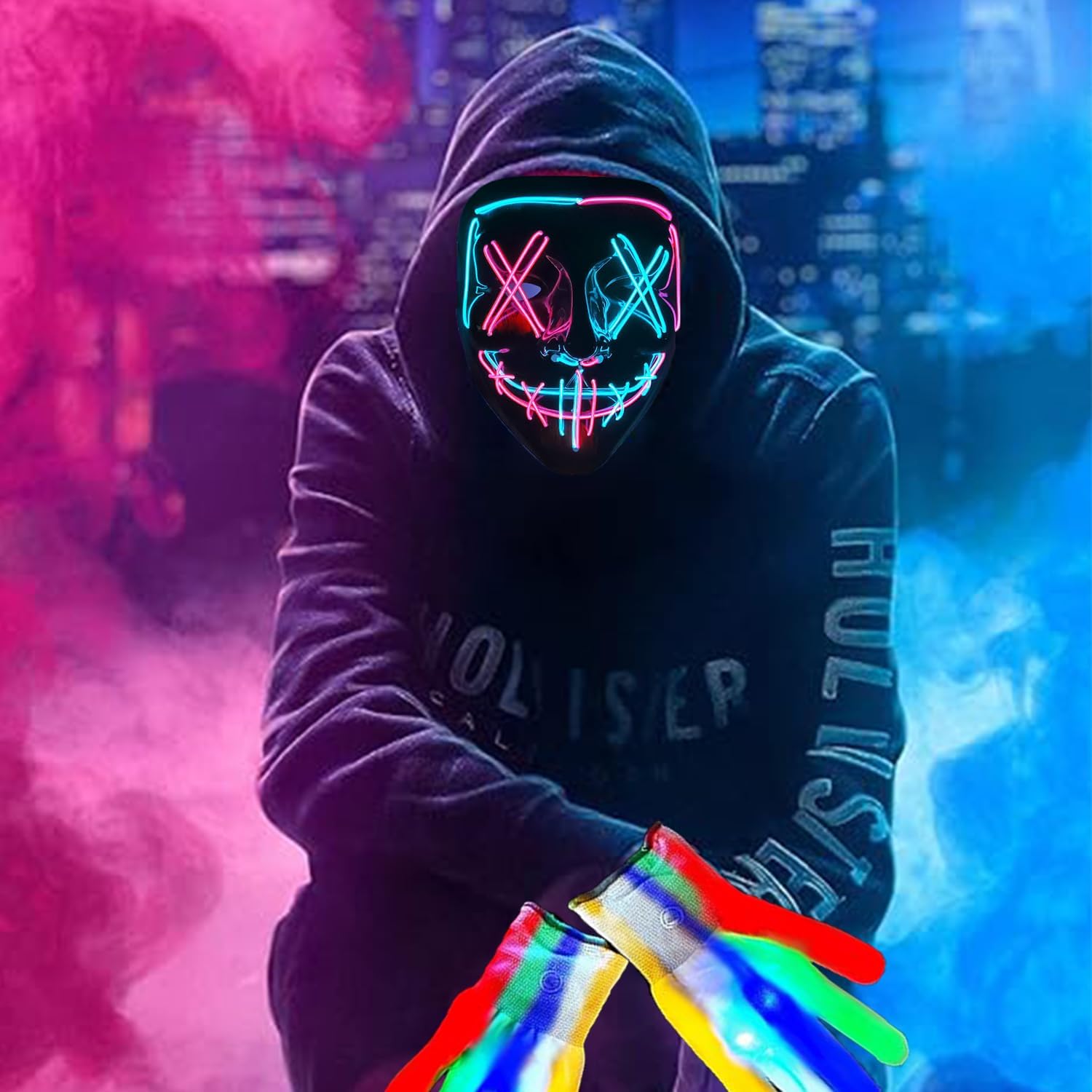 Maschera LED per Halloween con set di guanti luminosi a LED, costume di Halloween, costume per maschere, cosplay, maschera illuminata per bambini, uomini, donne, Halloween, festival
