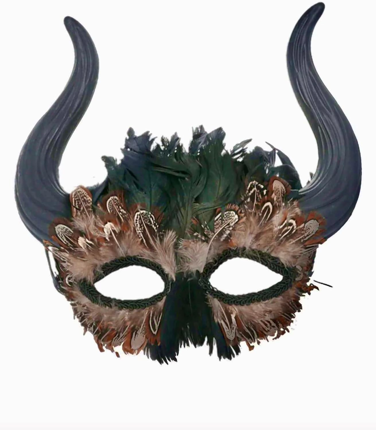 Minotauro mezza maschera con corni di toro e piume. Minotauro/Minotauro/Minotauro è un essere misto della mitologia greca che possiede un corpo umano e una testa di toro. L'accessorio perfetto per costumi di Halloween o spettacoli teatrali. Per il fissaggio alla testa servono elastici. Il fatto che la bocca rimanga libera con questa maschera, mangiare, parlare, bere non è affatto un problema. Colori: Nero/Marrone Dimensioni: 26 x 23 x 7 cm. Materiale: Maschera: 100% plastica, decorazione: piume (contiene parti non tessili di origine animale)
