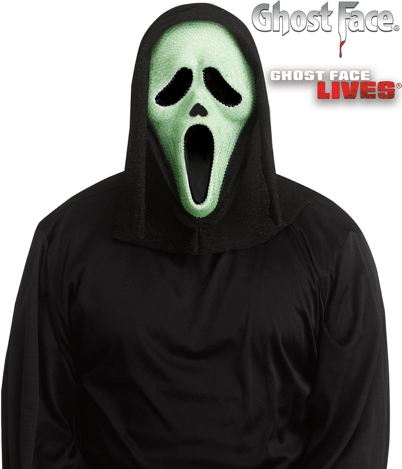 Stravagante maschera da fantasma con strass fosforescenti e cappuccio in tessuto scintillante. Le aperture per gli occhi della maschera sono rivestite in rete. Colori: nero/verde. Materiale: Tessuto: 100% poliestere Maschera: 100% plastica